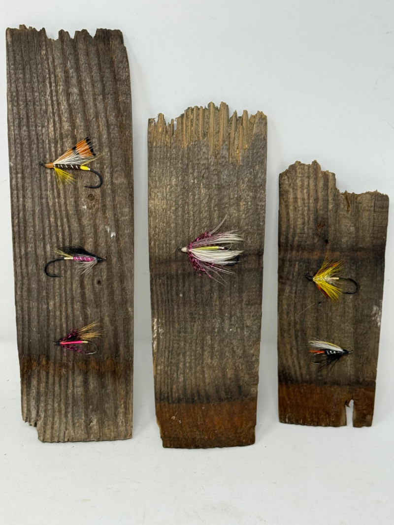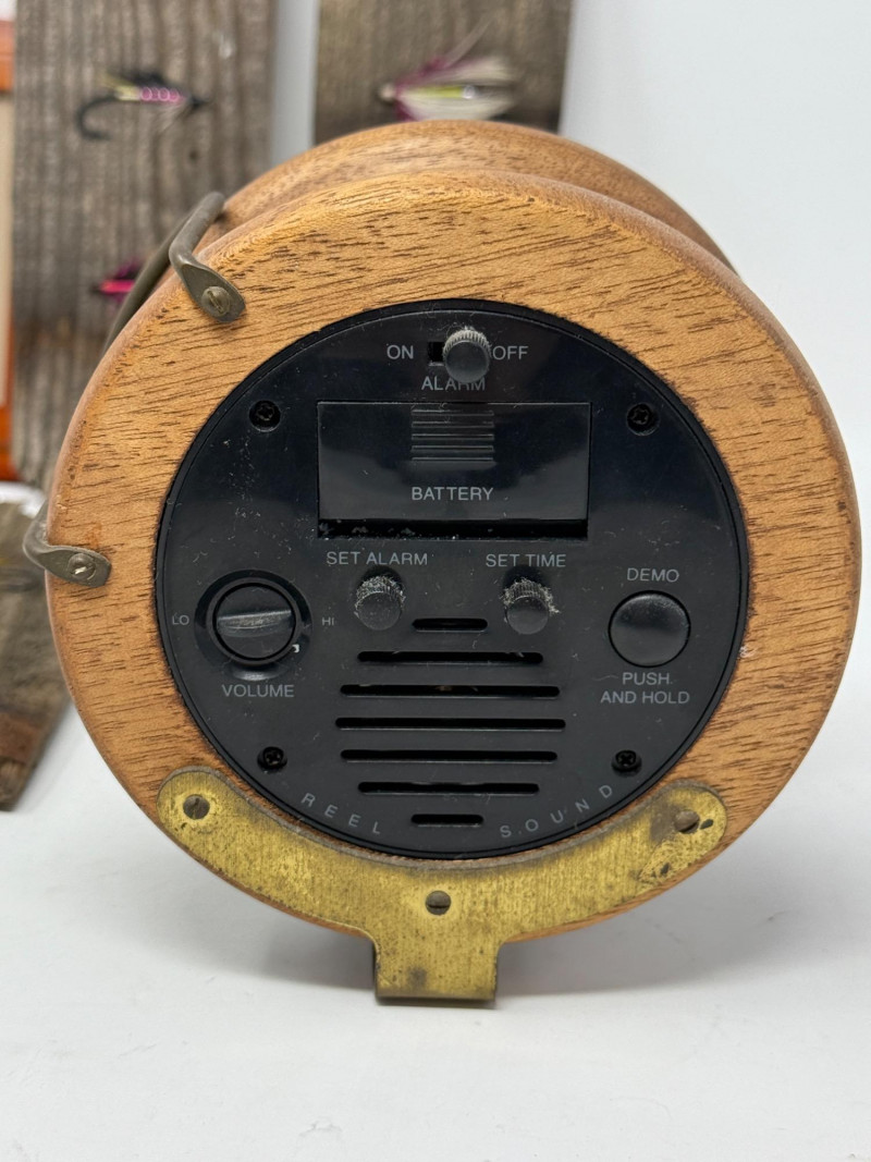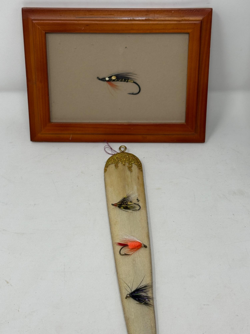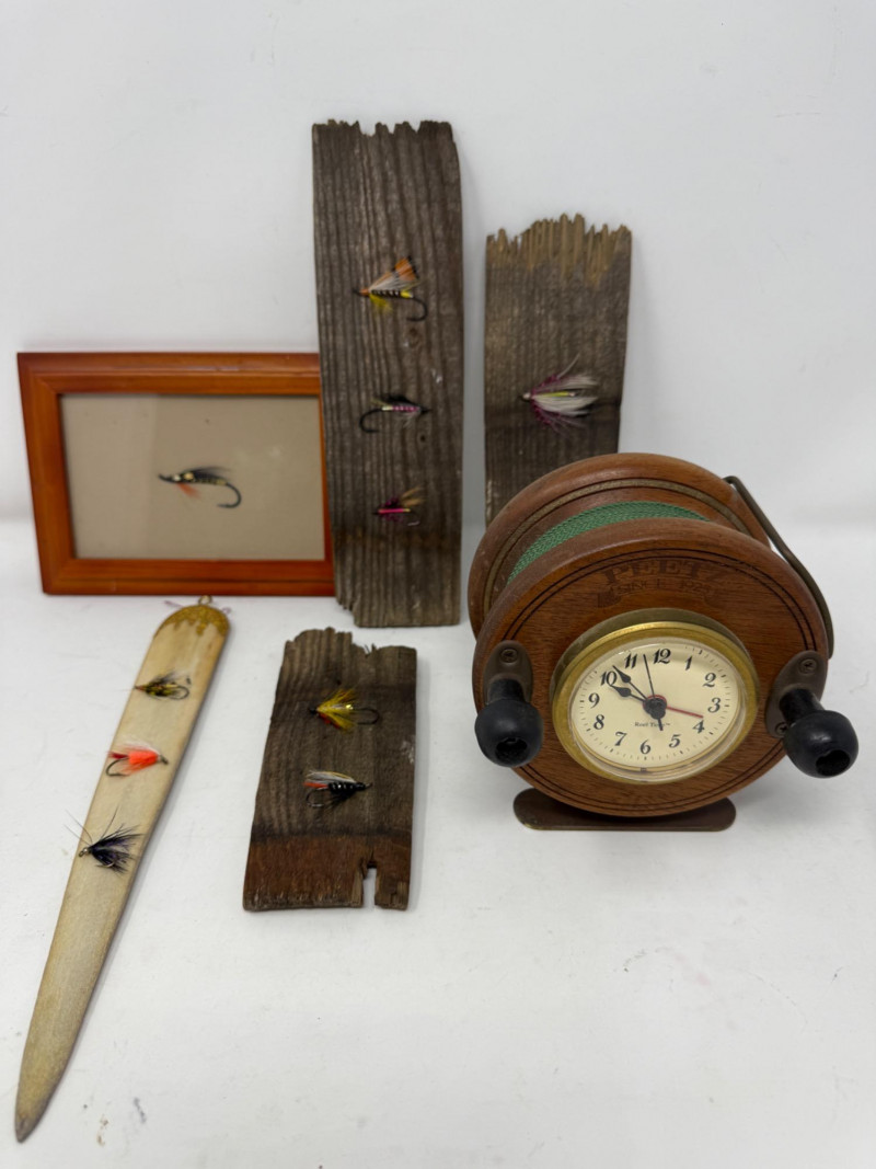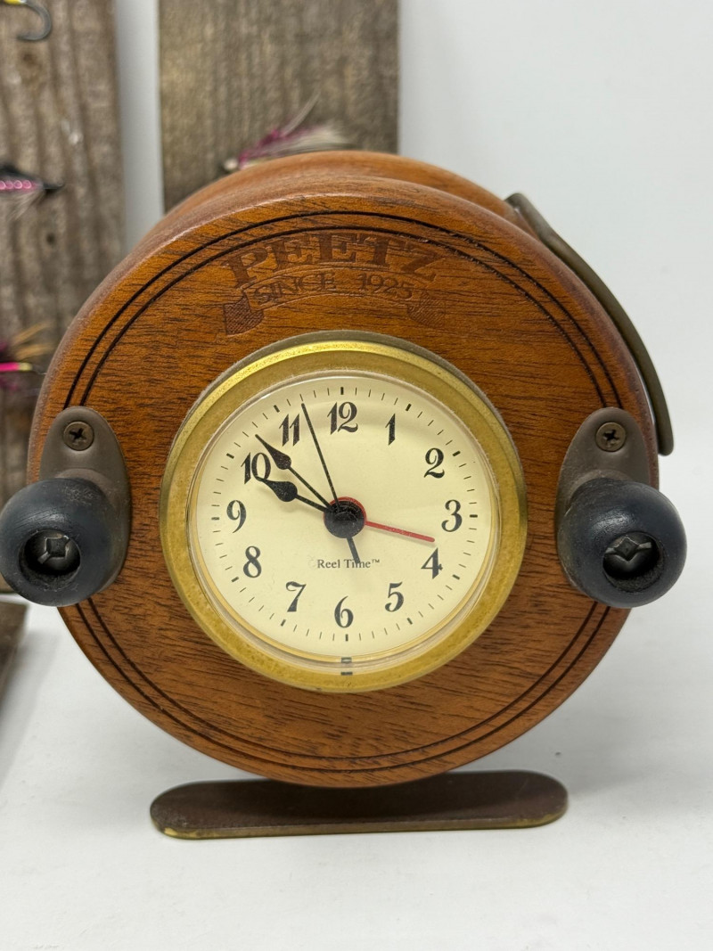 5.5”x4.75” 11” ornament 9.5x2.75” flies mounted on largest barn wood. 5x7” frame Peetz Wood Frame Reel Clock. Needs battery, not tested.