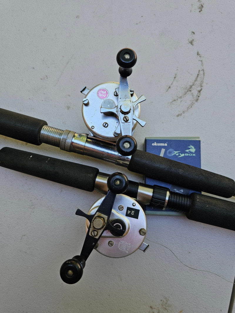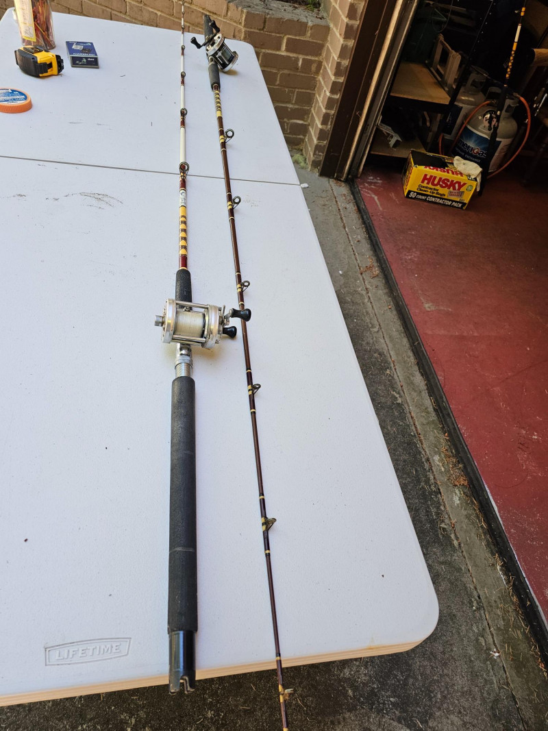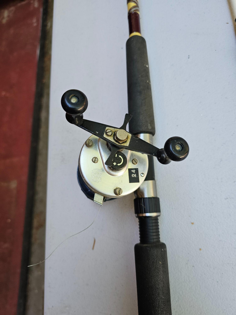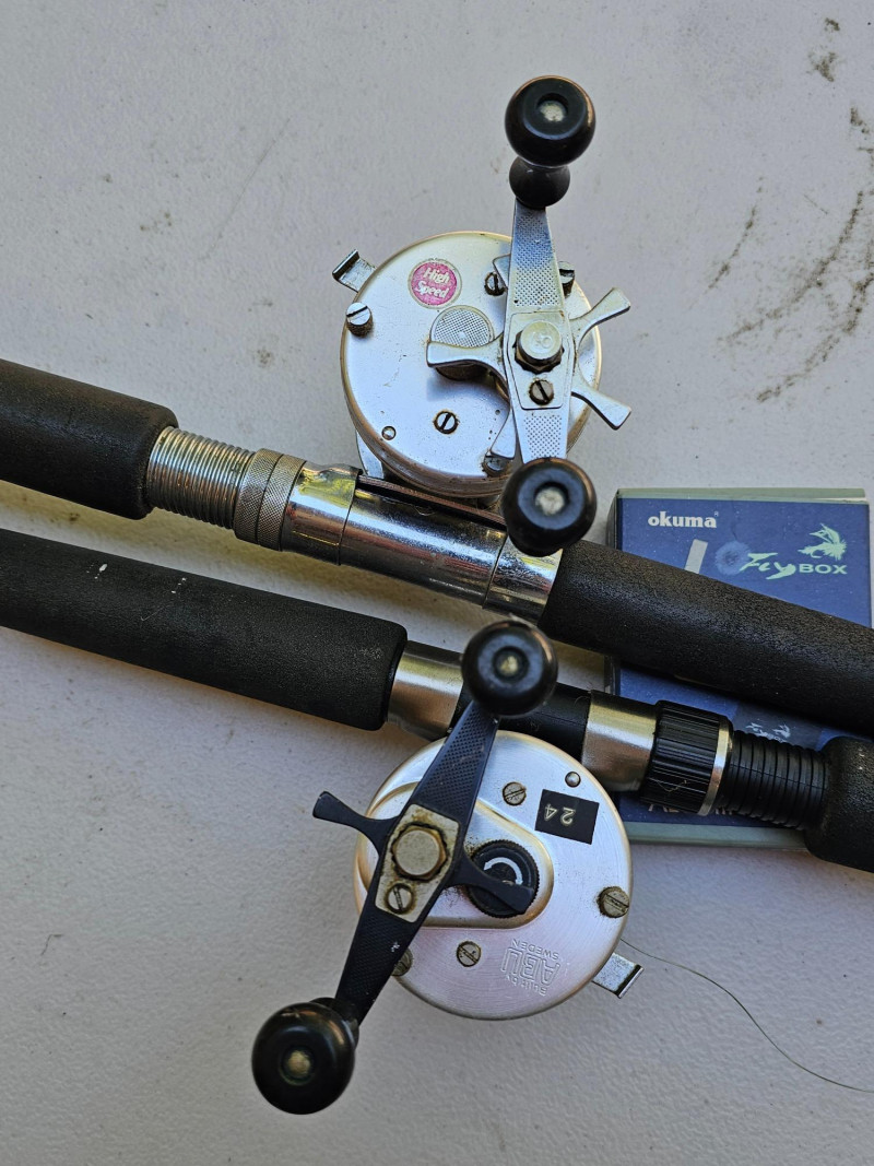 Pair Of Vintage Abu Garcia Ambassadeur Baitcasting Reels & Custom 7ft Rod Combos (1) Vintage Abu Garcia Ambassadeur 5000 baitcasting reel & custom-built 7ft fiberglass saltwater rod (7-Eye) The Abu Garcia Ambassadeur 5000 is a classic baitcasting reel renowned for its durability and smooth operation. Introduced in the mid-20th century by the Swedish company Abu Garcia, it quickly gained popularity among anglers worldwide. Its robust construction and reliable performance made it a favorite for both freshwater and saltwater fishing (1) Vintage Abu Garcia Ambassadeur 5500C fishing reel & custom built 7ft fiberglass saltwater rod by M.V. Tackle in Brielle, NJ (7-Eye) These reels are known for their durability, smooth operation, and distinctive design, making them highly sought after by collectors and fishing enthusiasts alike Appear to be in nice condition (see pics) 2 Abu Garcia Ambassadeur rod & reel combos total!