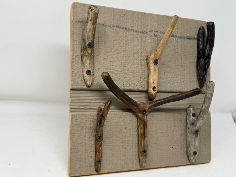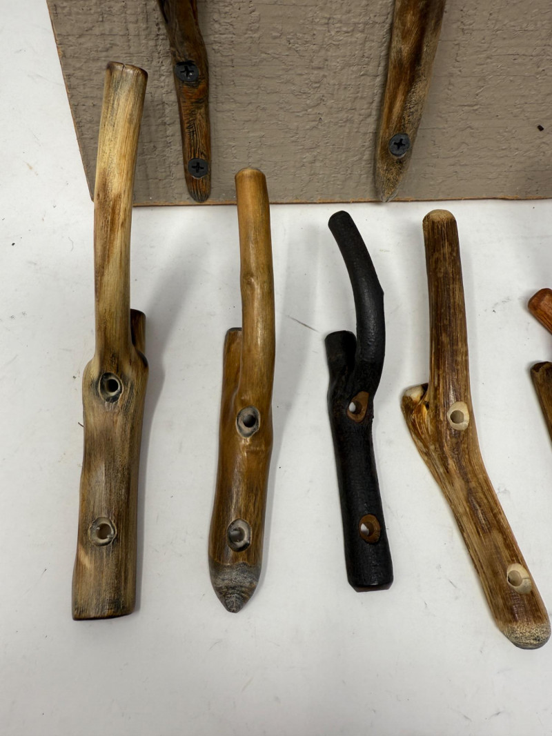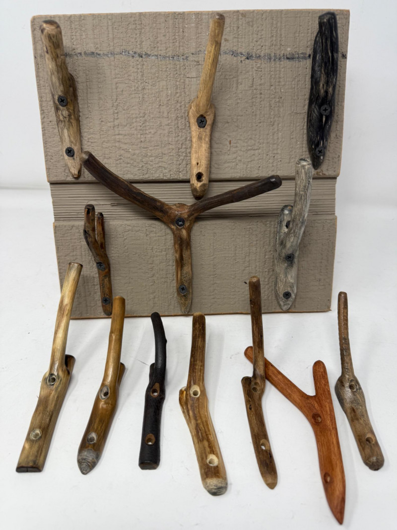 “Nature’s Hooks” Ready to Hang Hand Crafted Coat or Towel Hooks 11x11” Display with 6 hooks and 7 variety hooks drilled and ready to hang. Each retailed at $6-7 5 extra hooks included but not drilled or photographed.