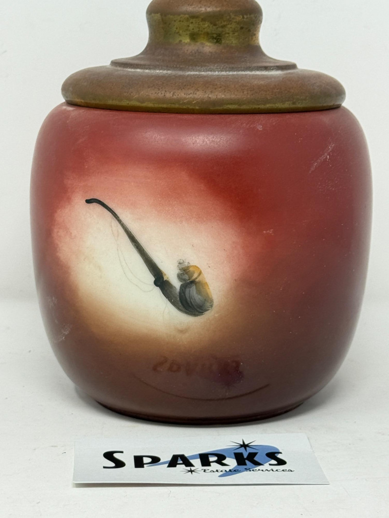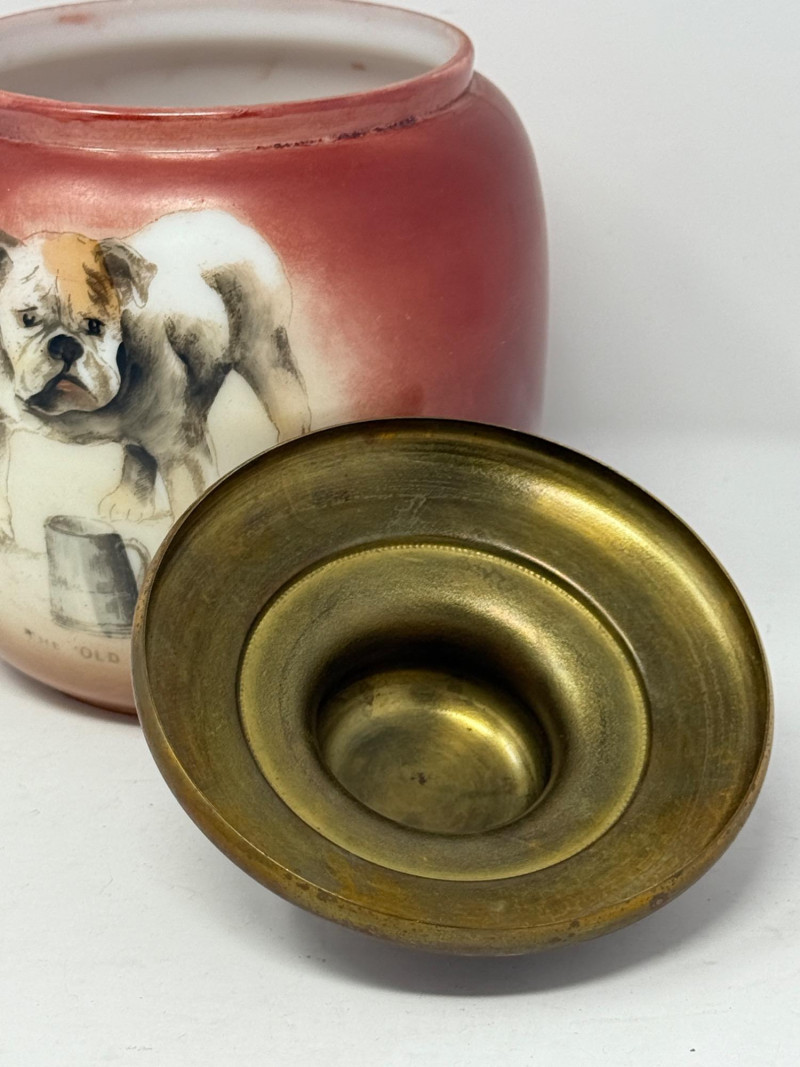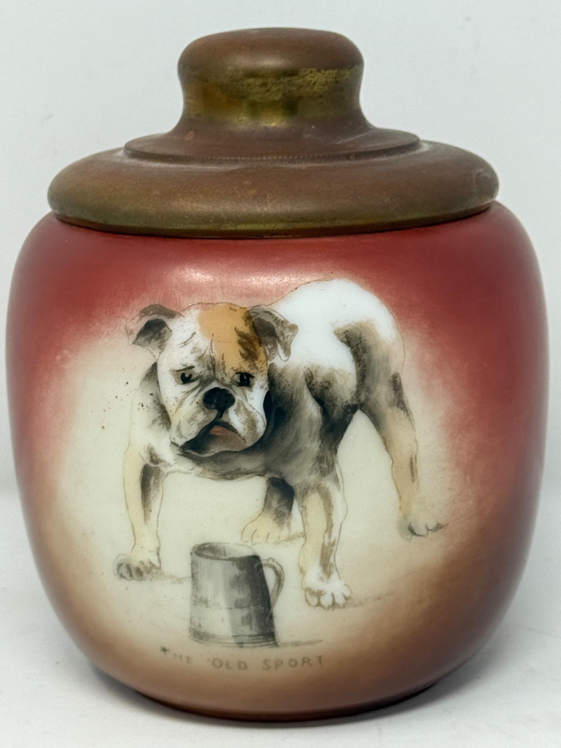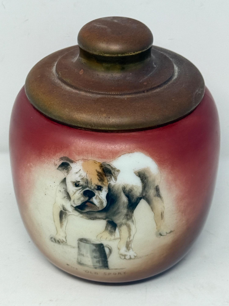 “The Old Sport” Bulldog Tobacco Jar or Humidor. Shades of red to brown with a tobacco pipe on the back side. Brass lid on glass jar.