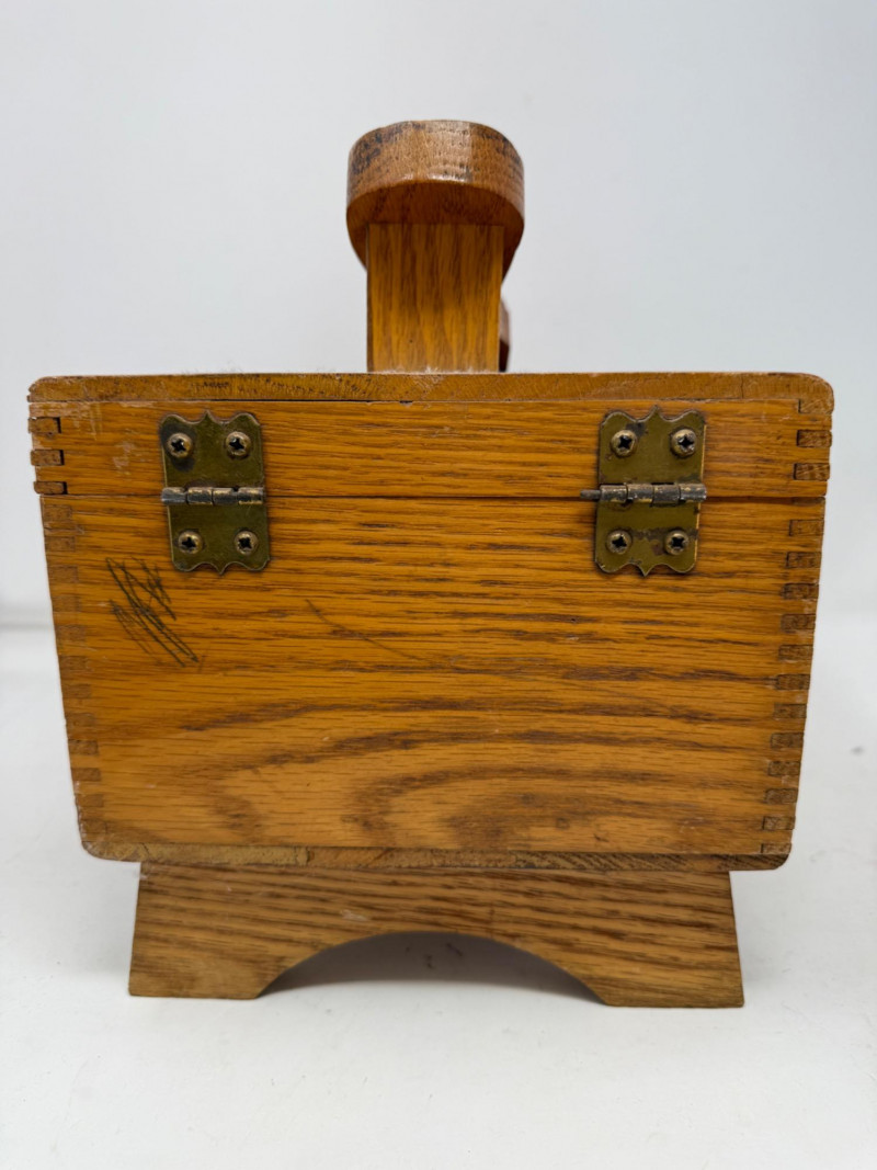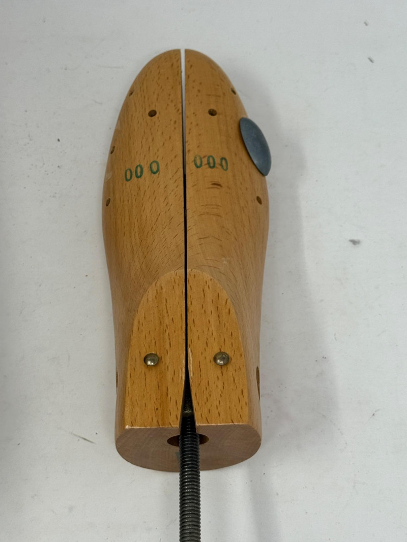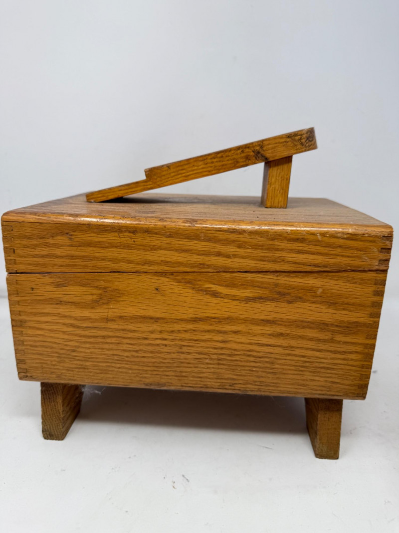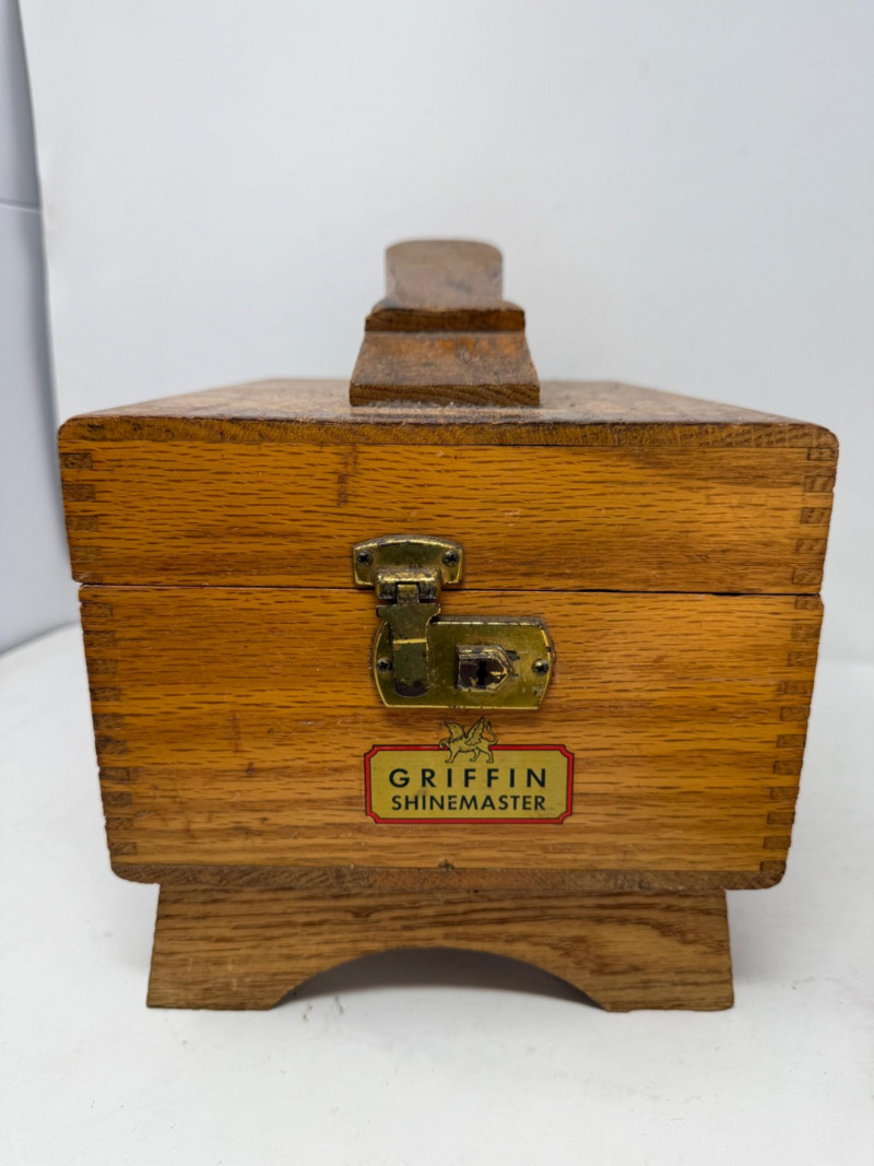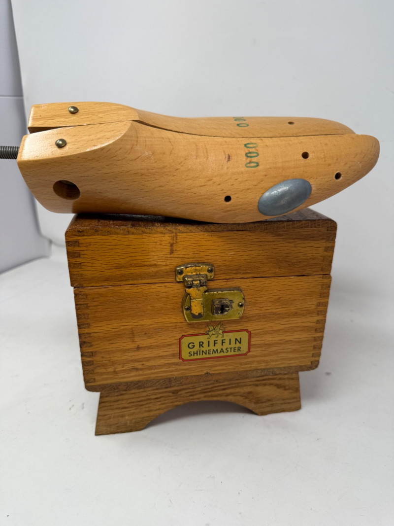 Vintage Shoe Shine Box & Stretcher From Slovania Oak wood box is 8x11x11” no key Shoe Stretcher is 9.5x4” wood only, not the screw turn.