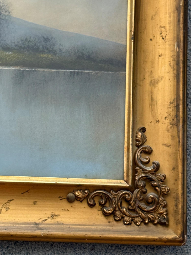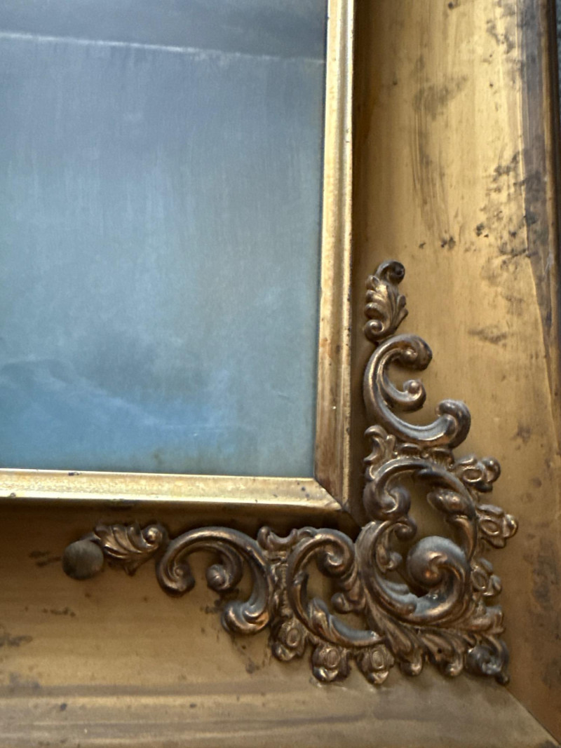 in ornate wood gold frame with metal accent corners under glass.