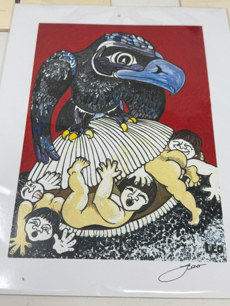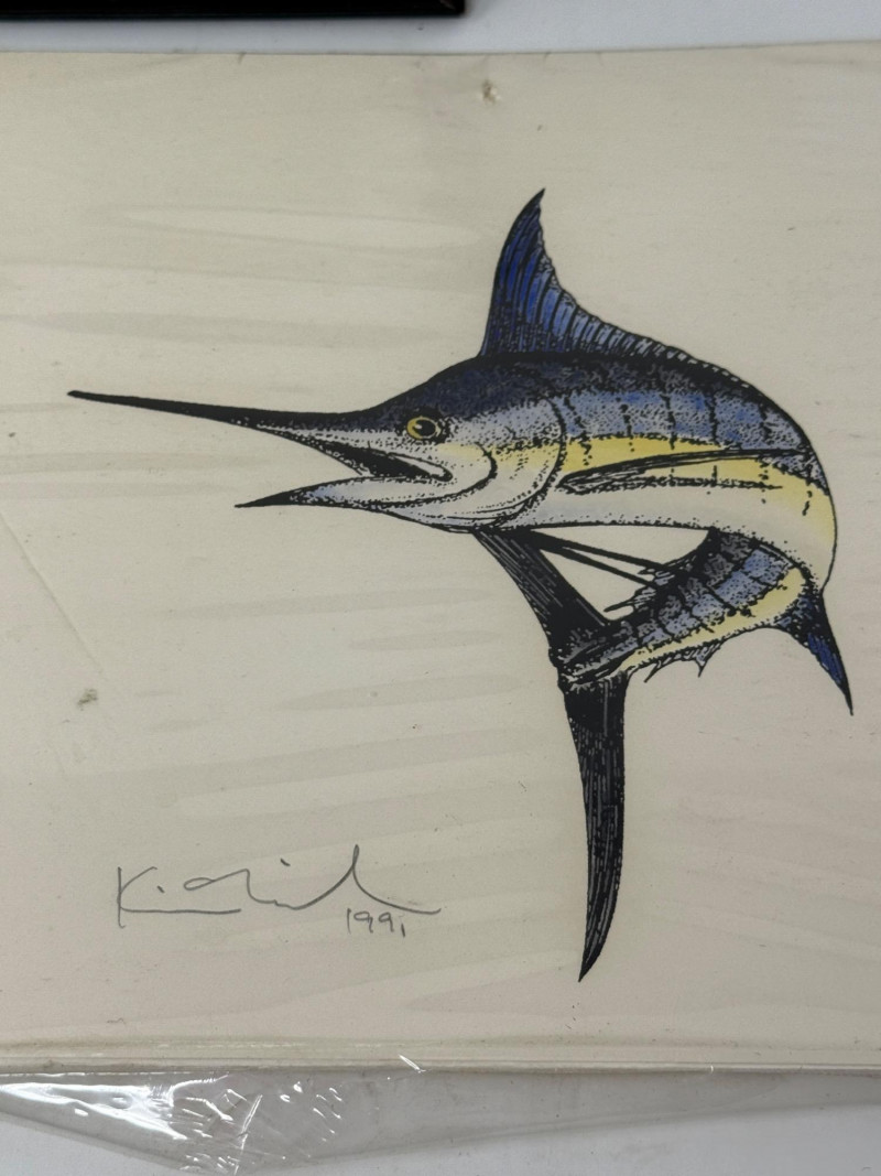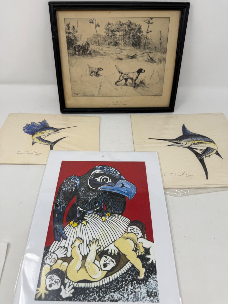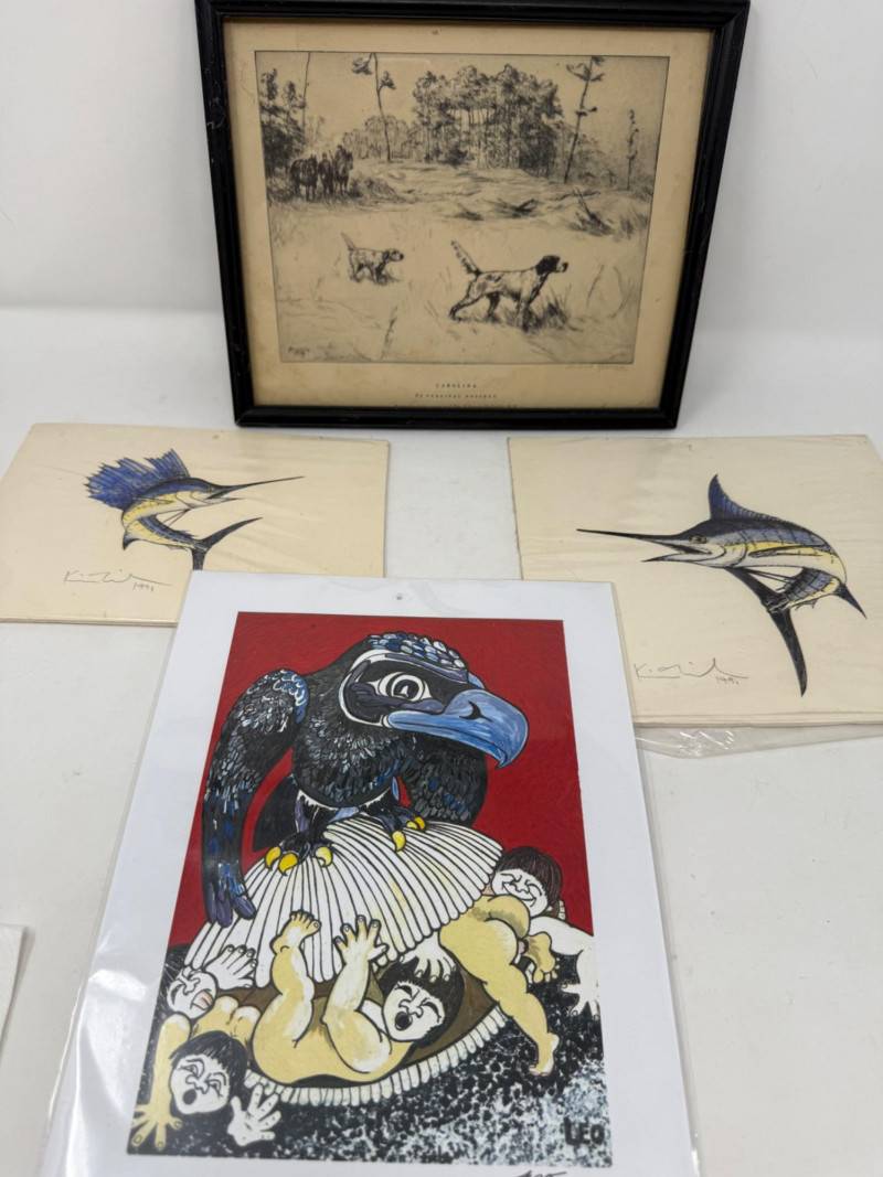 “Bill’s Covey” 1934 Etching 10.75x9” By Percival Rosseau Hand Drawn Striped Marlin 8.75x8” in plastic sleeve. Sailfish 8.5x6” in plastic sleeve. NW Coast Indigenous Art depicting Raven and The First Humans 8.5x11” Signed LEO in plastic sleeve.