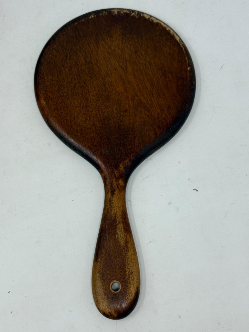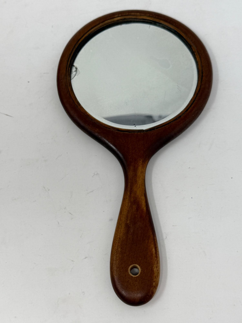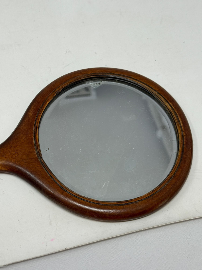 Wood Box - Hand Mirror and Wood Framed Metal Welcome Sign Hand Mirror 10” beveled mirror with chip. Vintage Wood Framed Metal Welcome Sign 10x9”