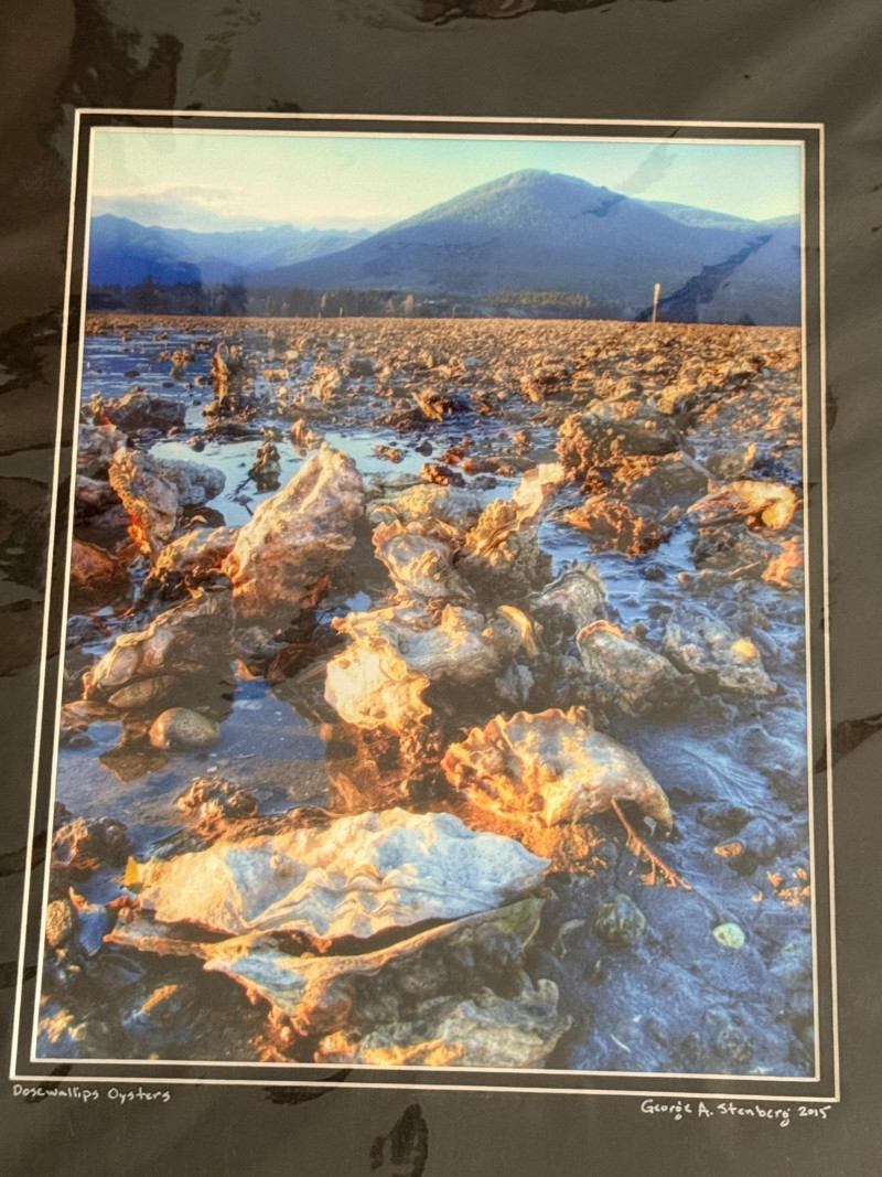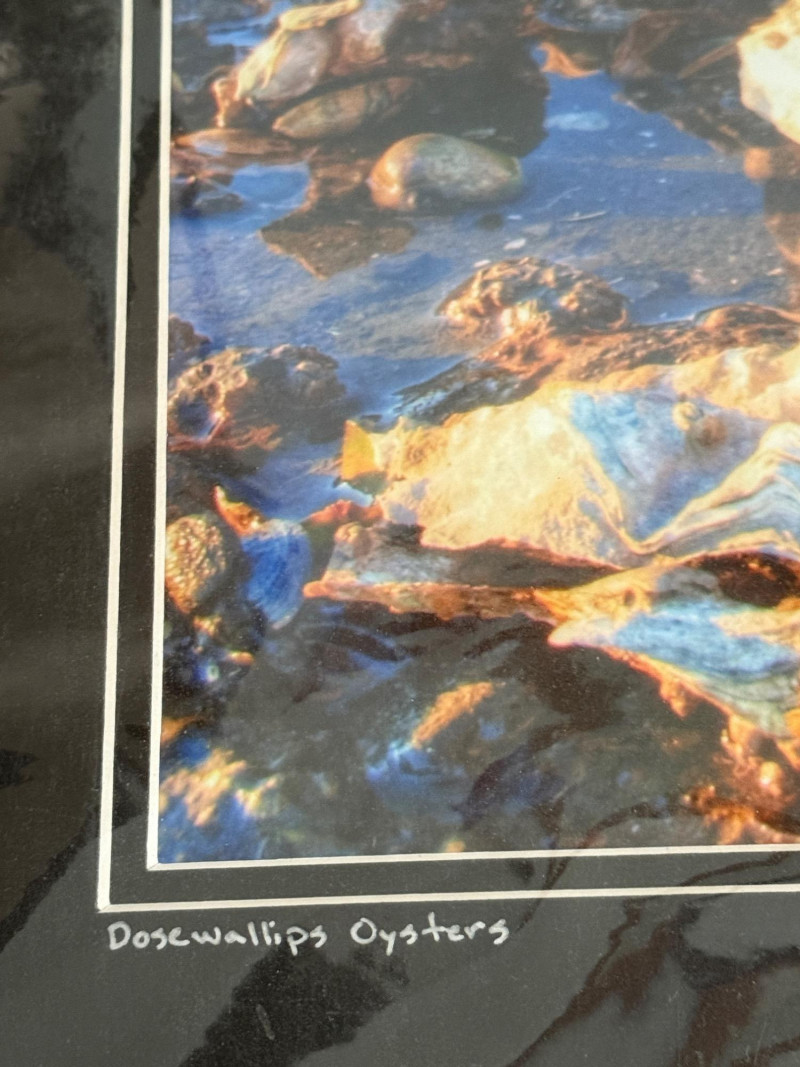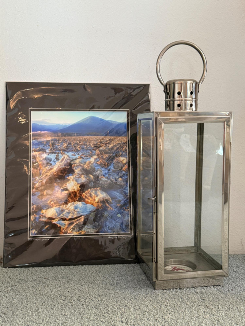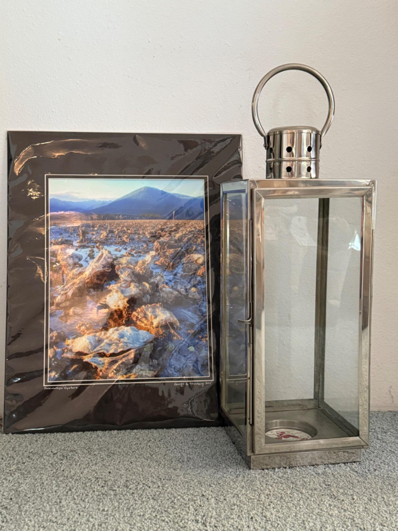 “Dosewalips Oysters” a double matted photograph signed by George A Stenberg in plastic sleeve 11x14” Chrome Candle Lantern. Heavy duty and 7x7.5x23”