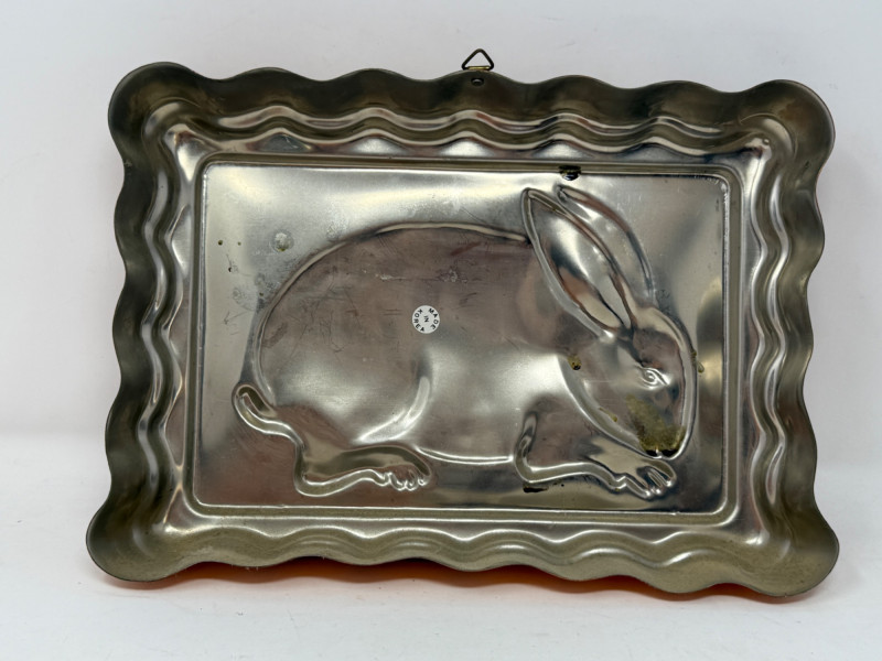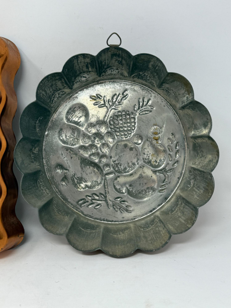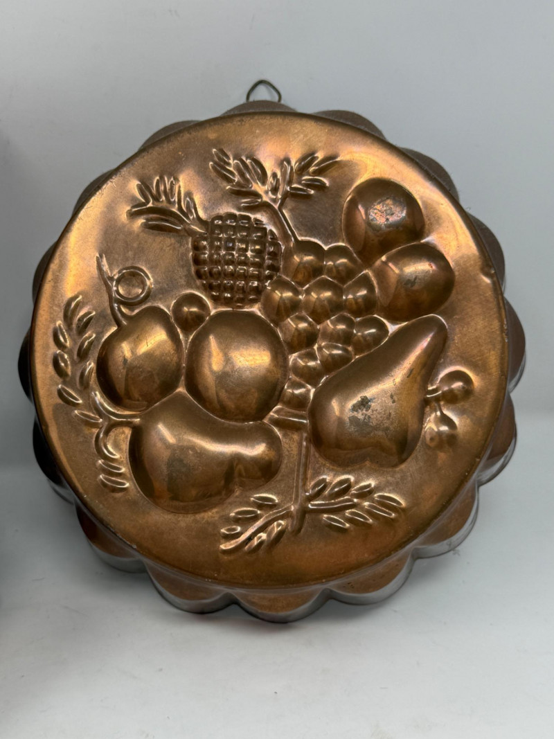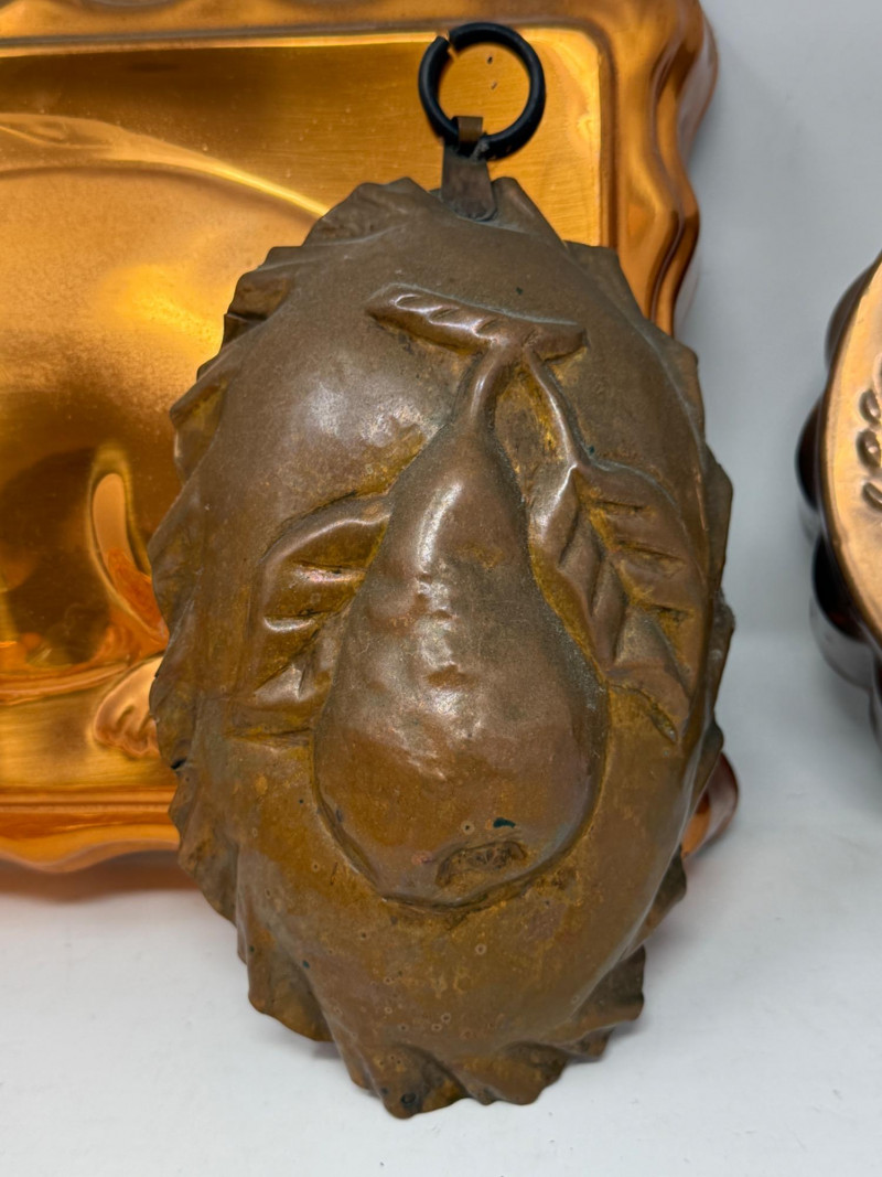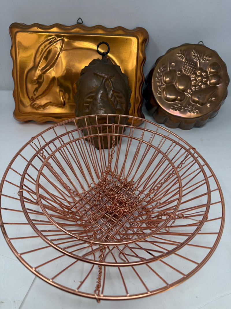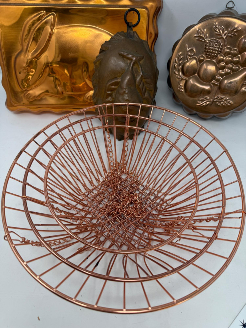 (3) Copper Molds Bunny mold is 12x9” 3 Tier Hanging Basket not currently connected and is 3 separate pieces. Connection chains appear to be complete. Largest basket is 12”