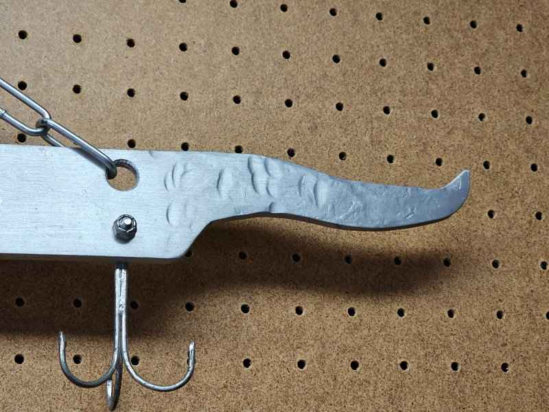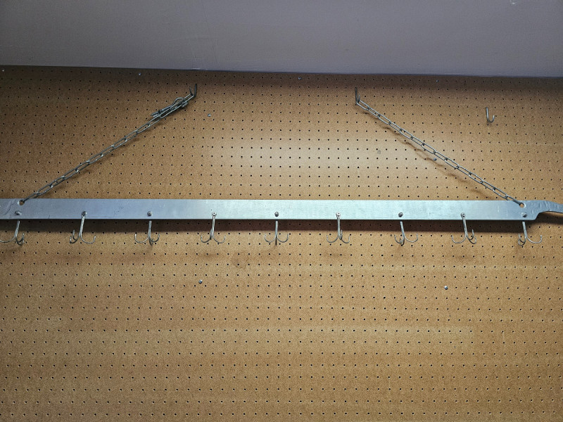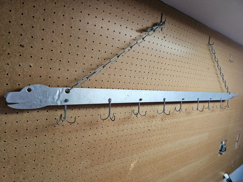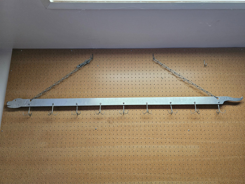 Custom-Made Aluminum Hanging Rack - Doggy Made of solid 1/4" aluminum 9 total 3" treble hooks to hang anything: pots, hats, coats... 60"L x 5"T Very cool handcrafted functional artwork!