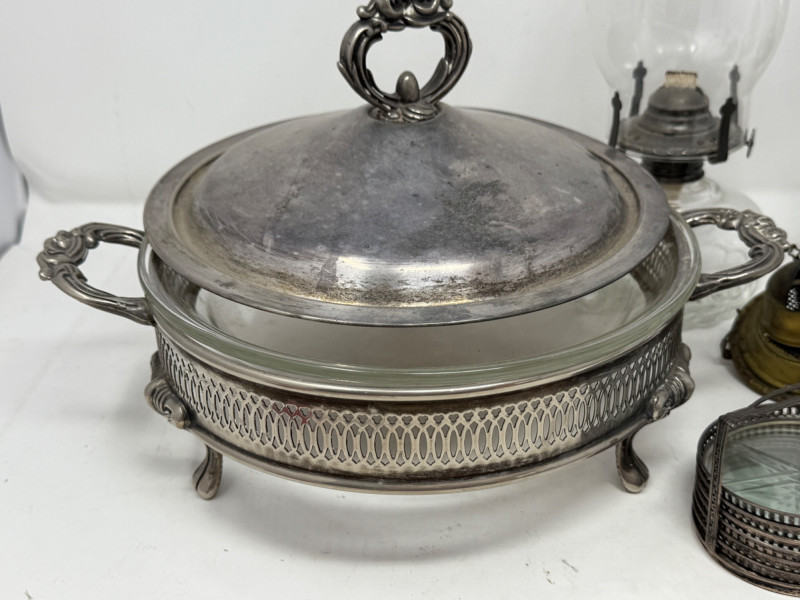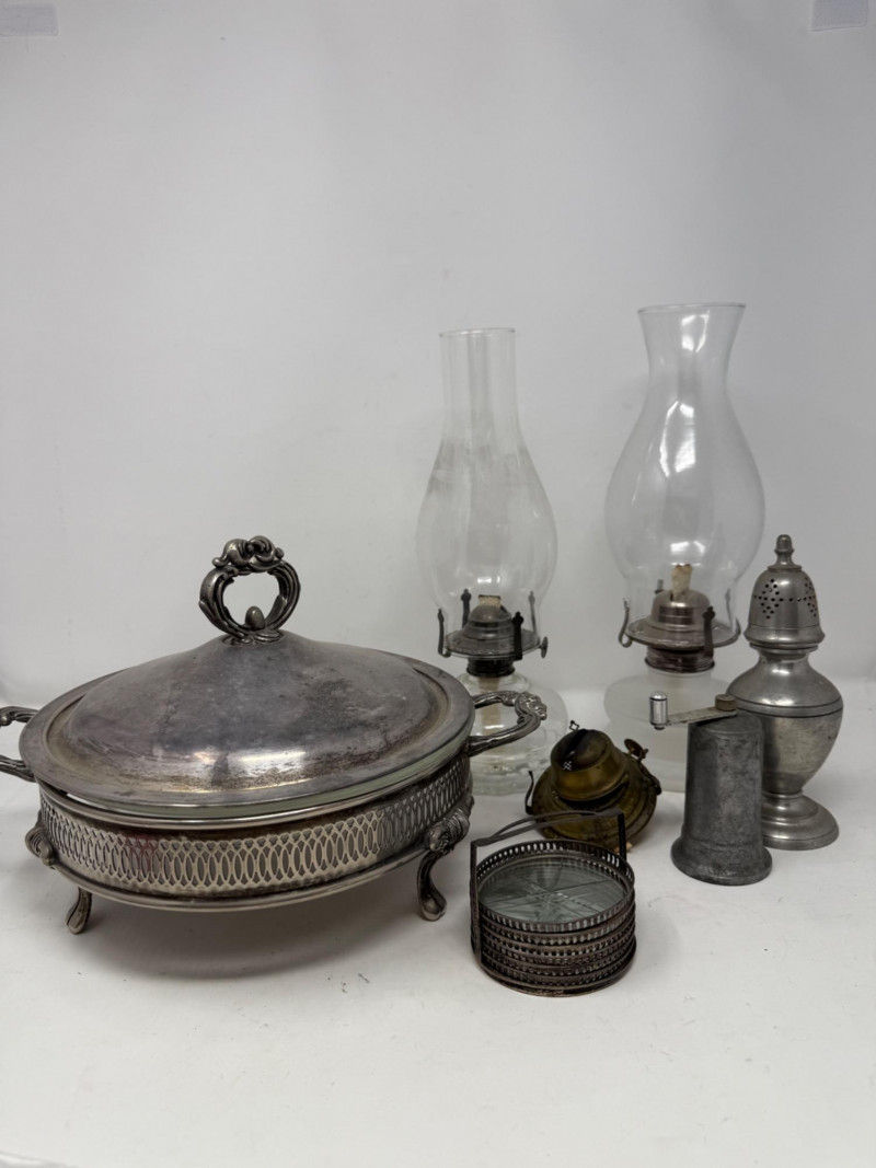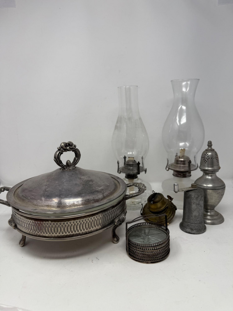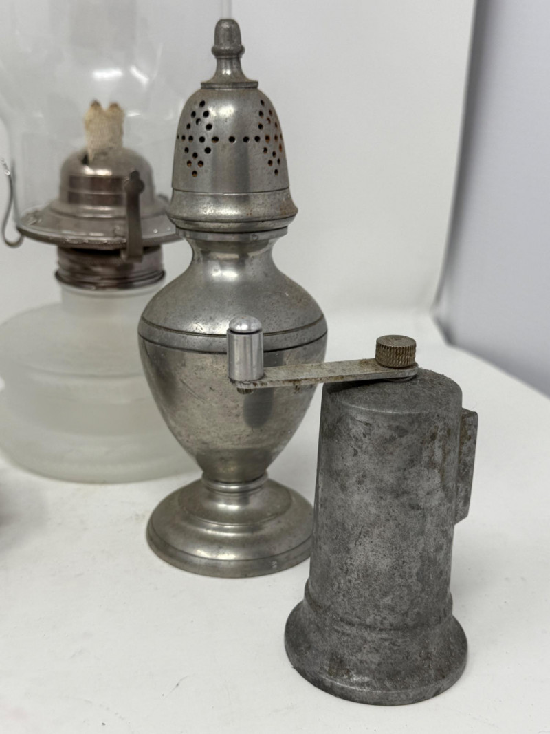 Oil Lamps Pewter Pepper Mill and Shaker - Silver Plate Lidded Pie Server and Coaster Set
