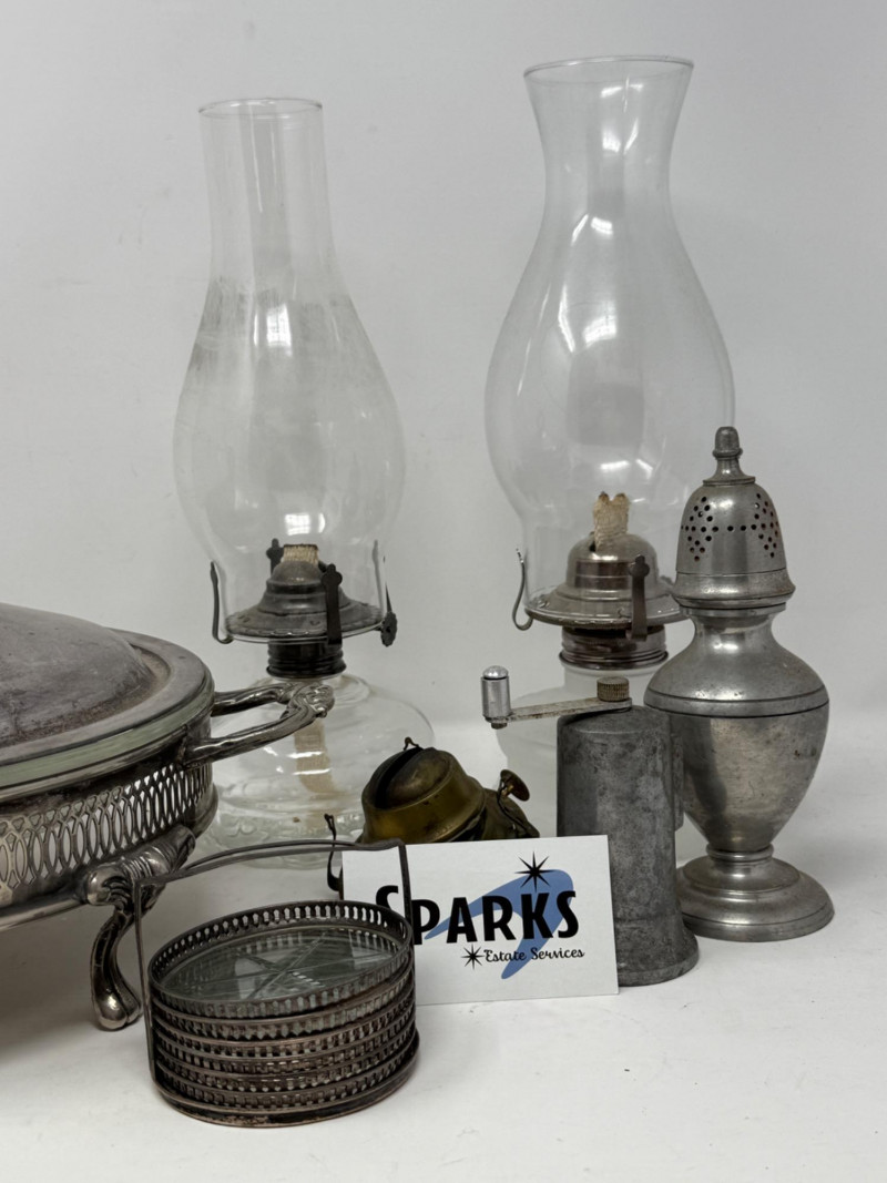 Lot # 169 - Oil Lamps- Pewter Pepper Mill and Shaker - SP Pie Server