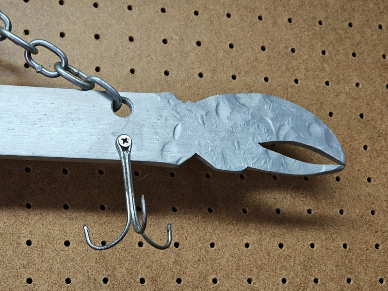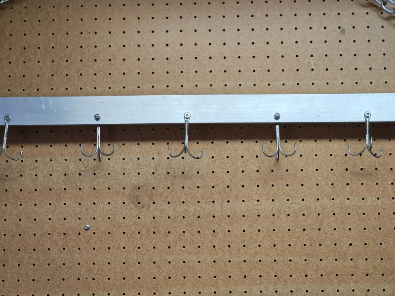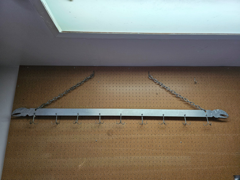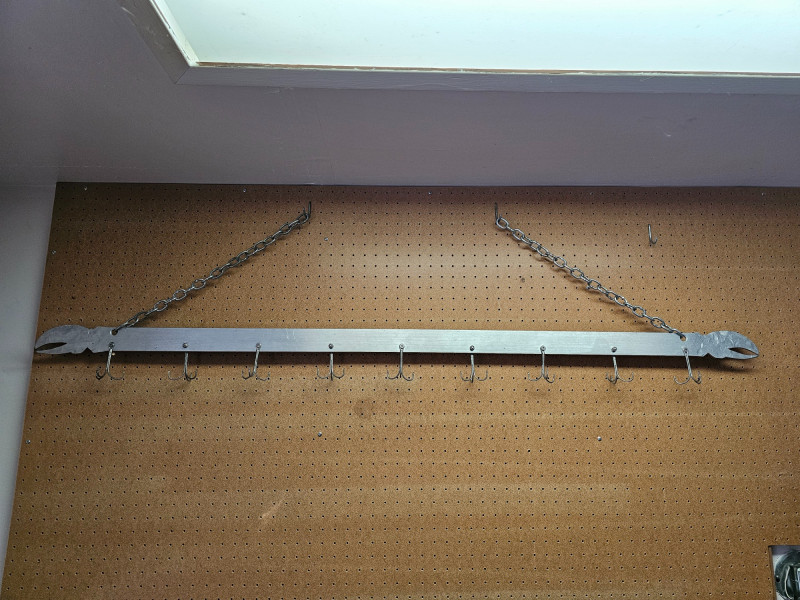 Custom-Made Aluminum Hanging Rack - Lobster Claws Made of solid 1/4" aluminum 9 total 3" treble hooks to hang anything: pots, hats, coats... 60"L x 4.5"T Very cool handcrafted functional artwork!