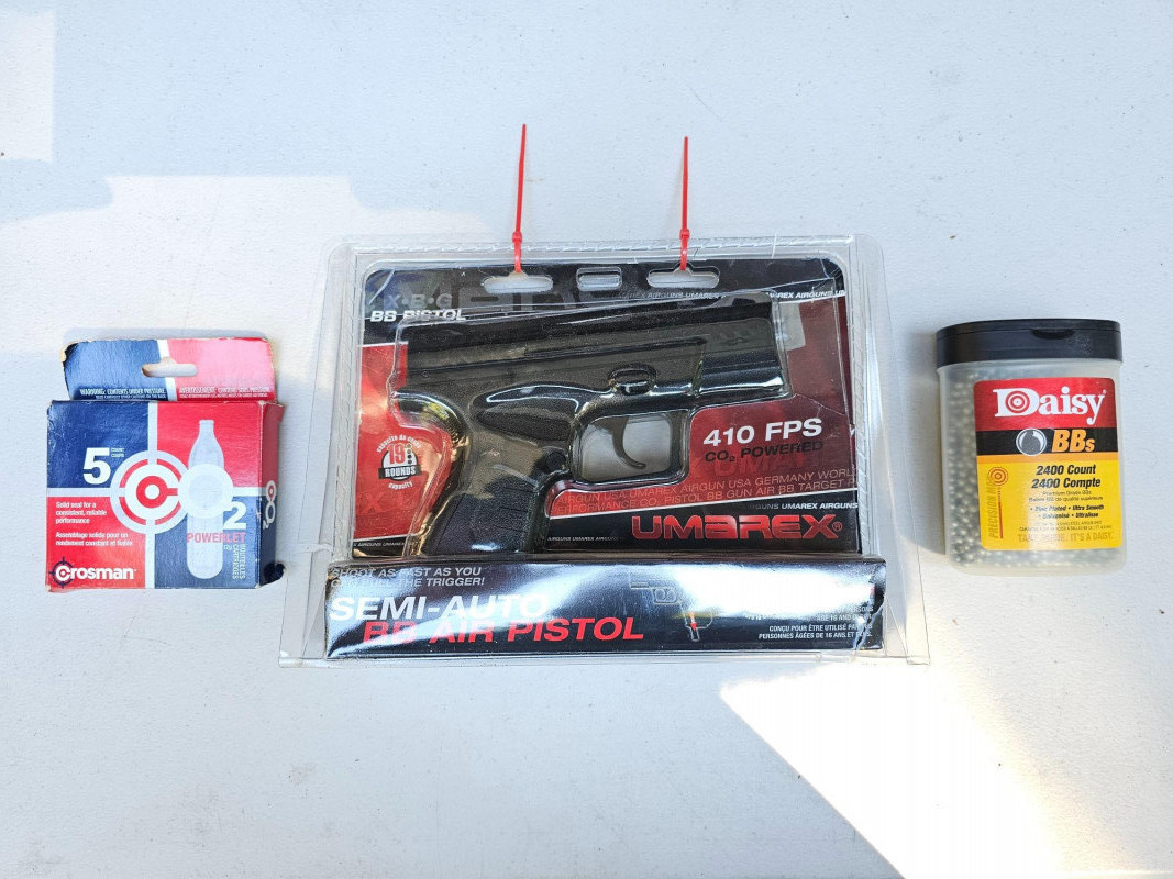Umarex XBG CO2-Powered BB Pistol, (3) CO2 Cartridges, 1/3 Box BBs Umarex XBG CO2 Semi -Auto BB Pistol Umarex #2254802 410fps, 19 round capacity, drop free magazine 3 CO2 cartridges (1 in CO2 gun package, 2 in Crosman box) 1/3 of Daisy BBs (full box holds 2400, estimate maybe 800 left in box) Appears to be in nice condition and includes original packaging! Untested!