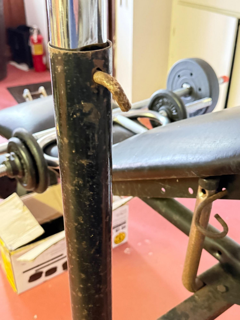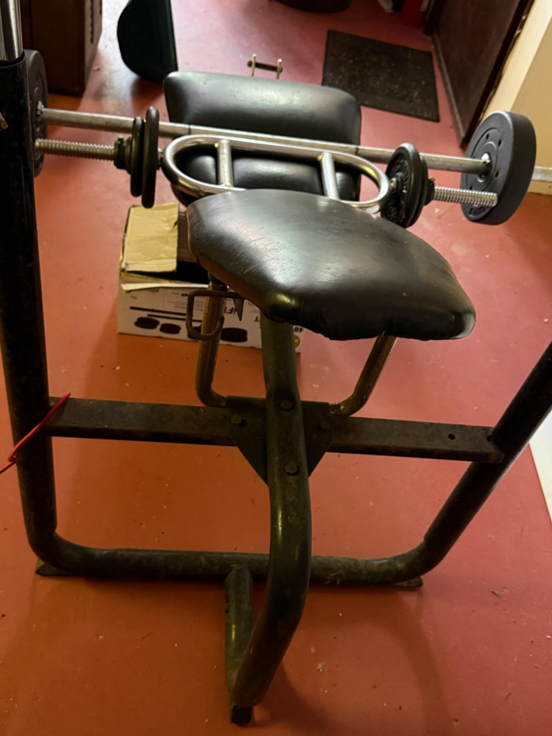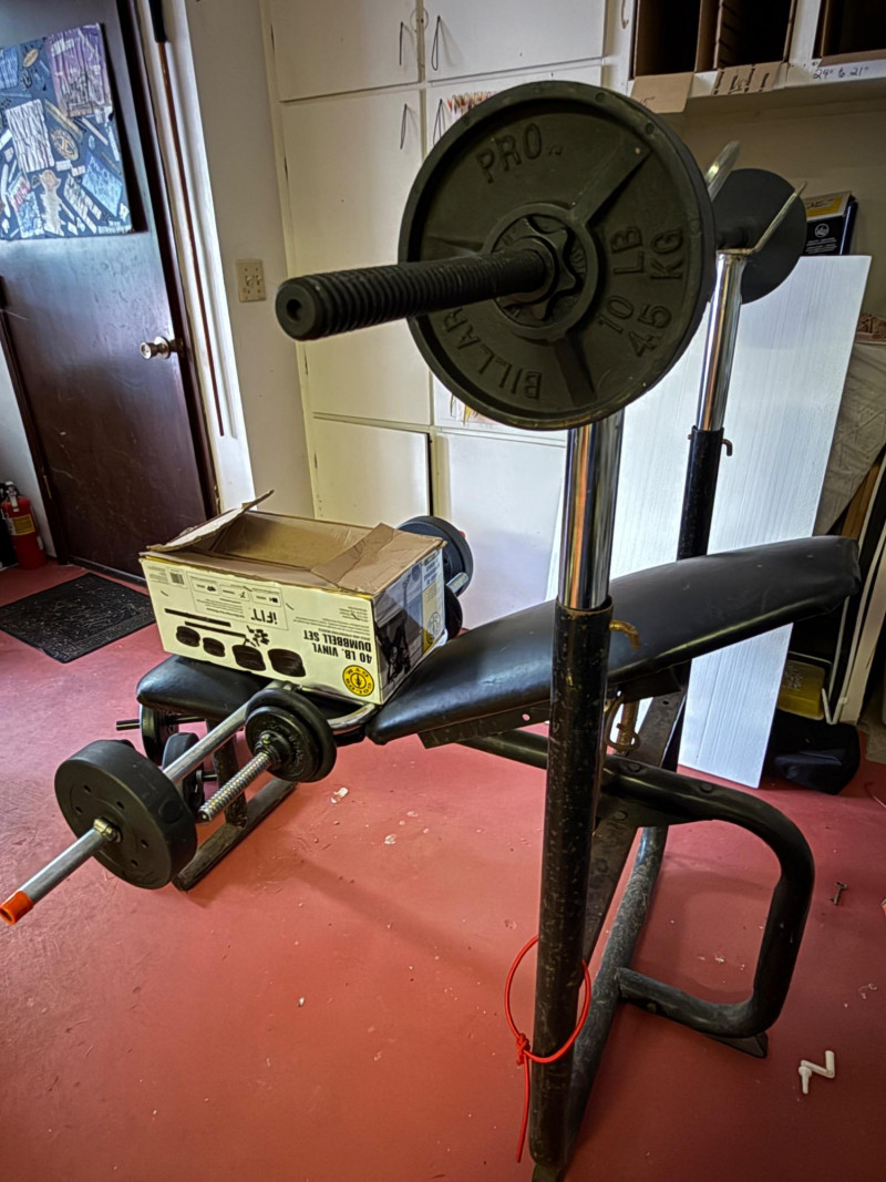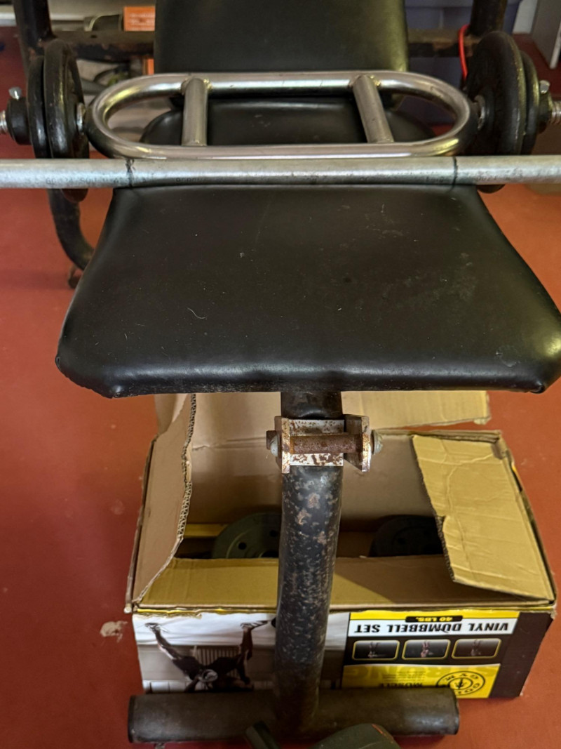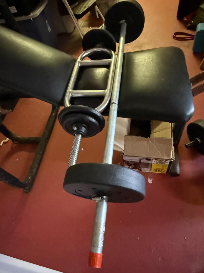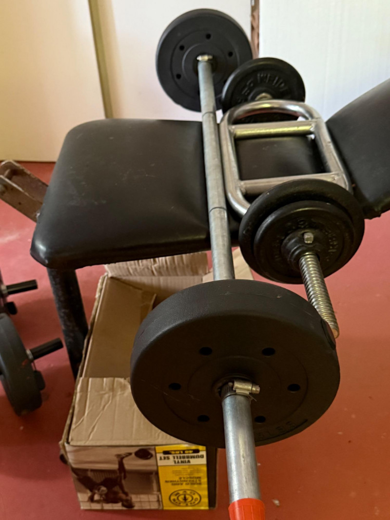Reclining Weight Bench & Weights 2 sets of 20lb weights on hand bars 2 7.5lb weights on long bar 2 10lb weights on long bar on rack. 4 2.5lb weights in box