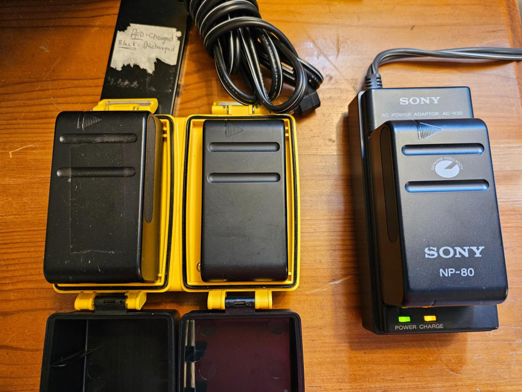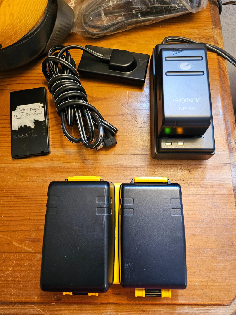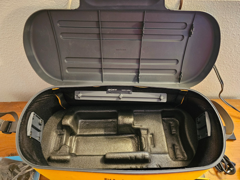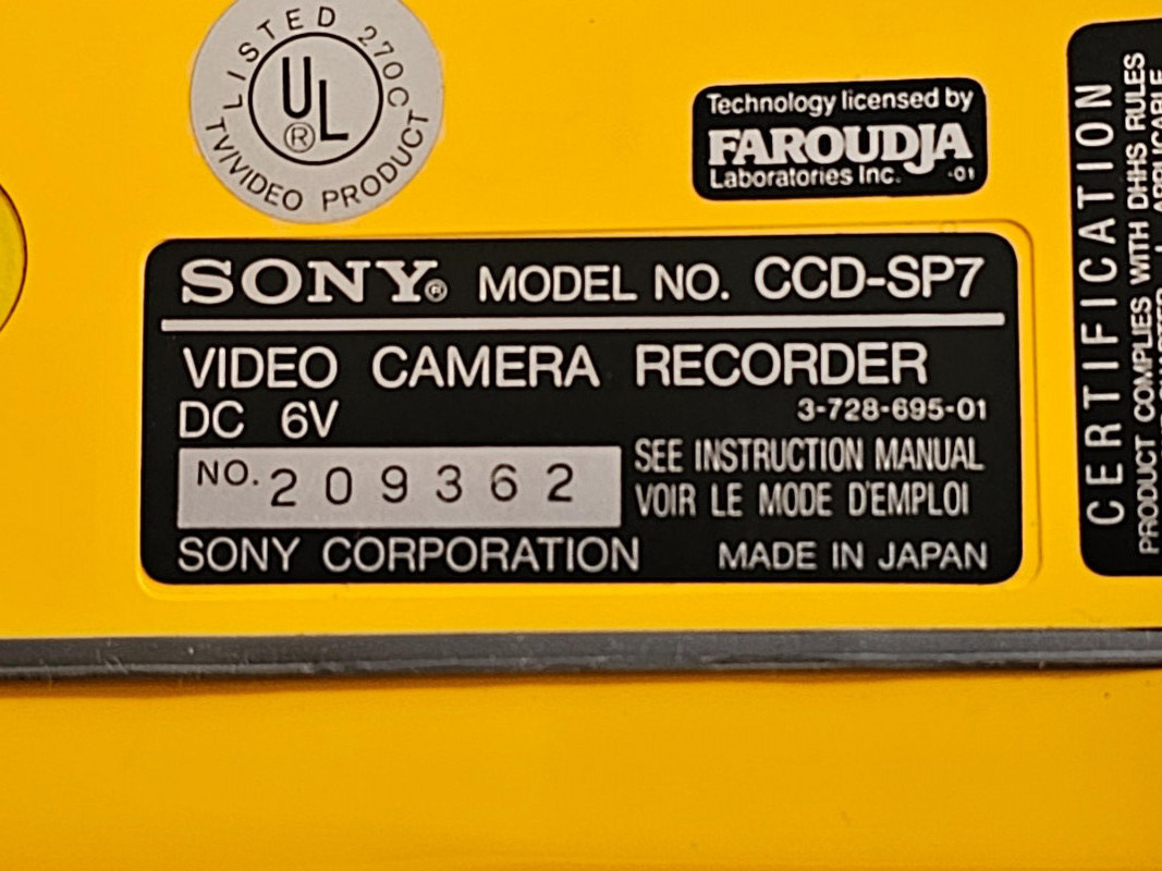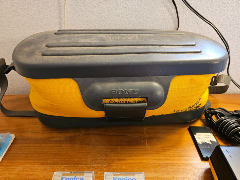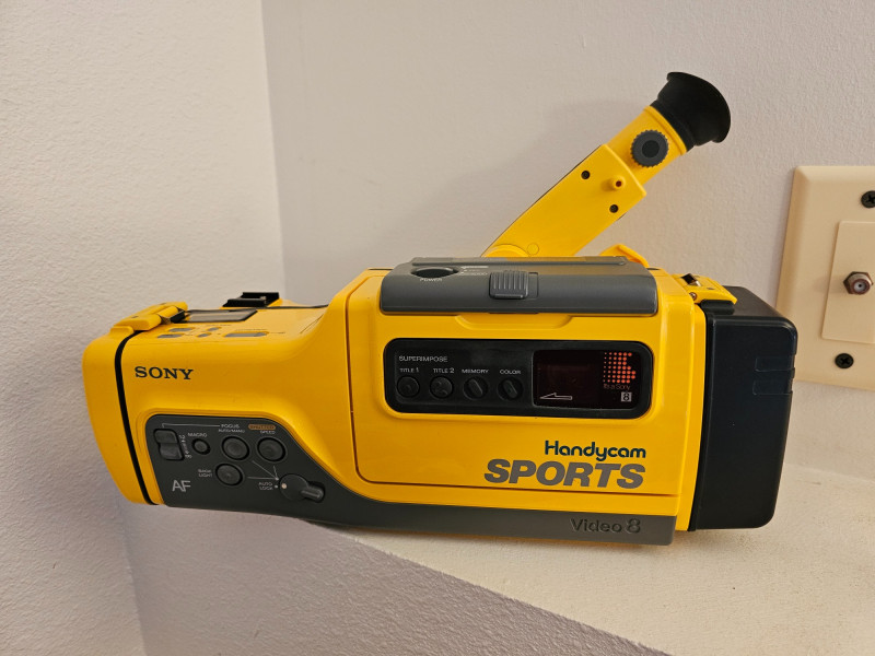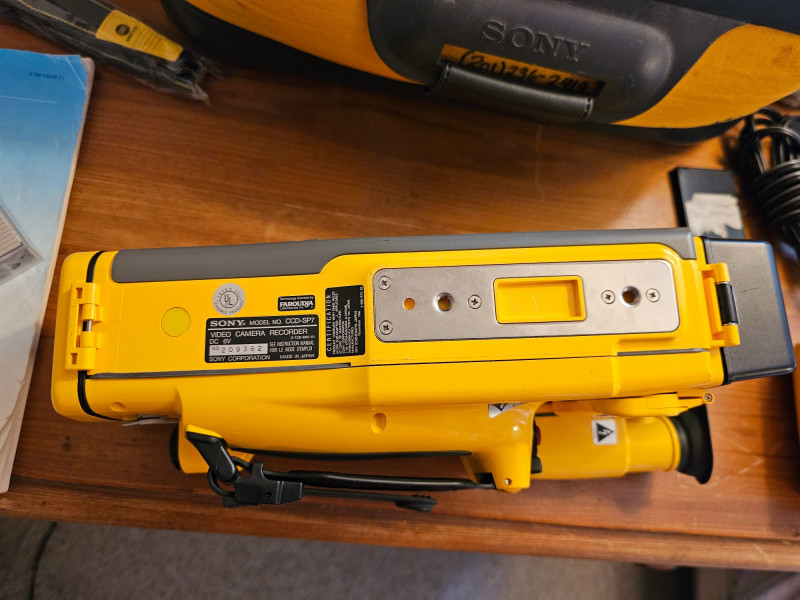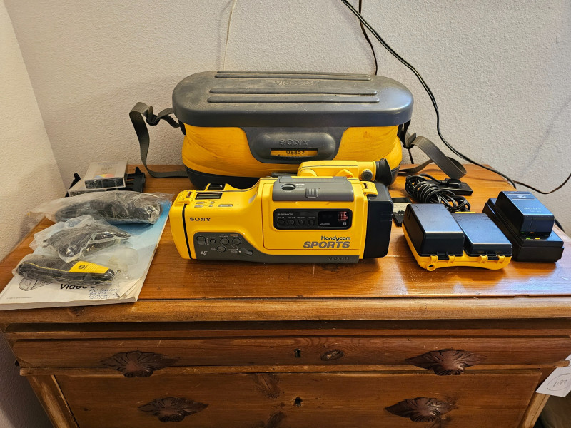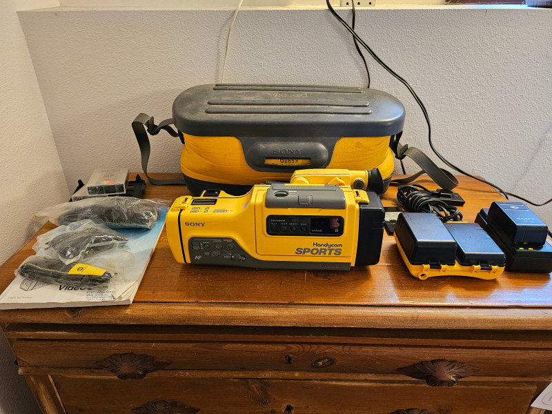 Sony Sports Handycam Bundle Sony #CCD-SP7 Released in 1988, the CCD-SP7 was a weather-resistant camcorder designed for outdoor use It recorded video on standard 8mm videotape Multicolor, Dual-Title Superimposition, Six-power Automatic Zoom Lens, Black-and-White Electronic Viewfinder, Infrared Autofocus, LCD Clock/Calendar and Real-Time Tape Counter, Separate Lithium Battery Includes carry bag, 3 batteries, battery chargers, manual, 8mm tapes, cords & cables Tested - Powered On (battery charged up)