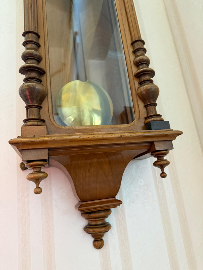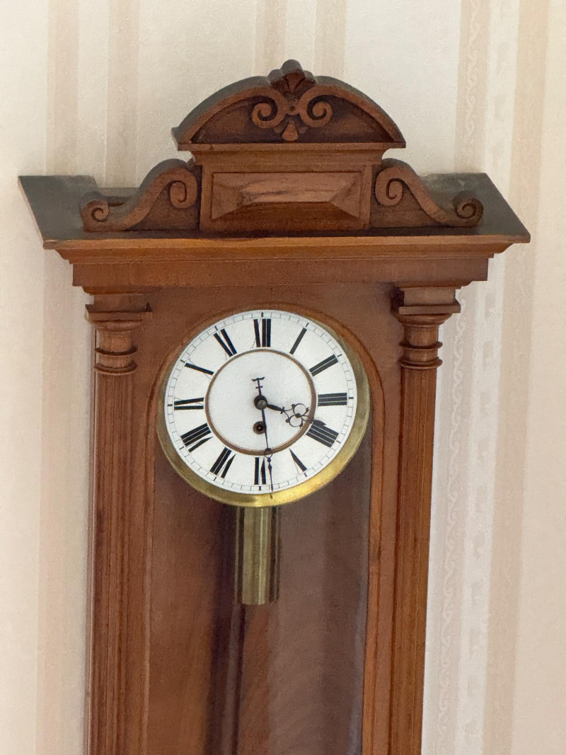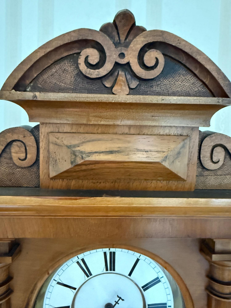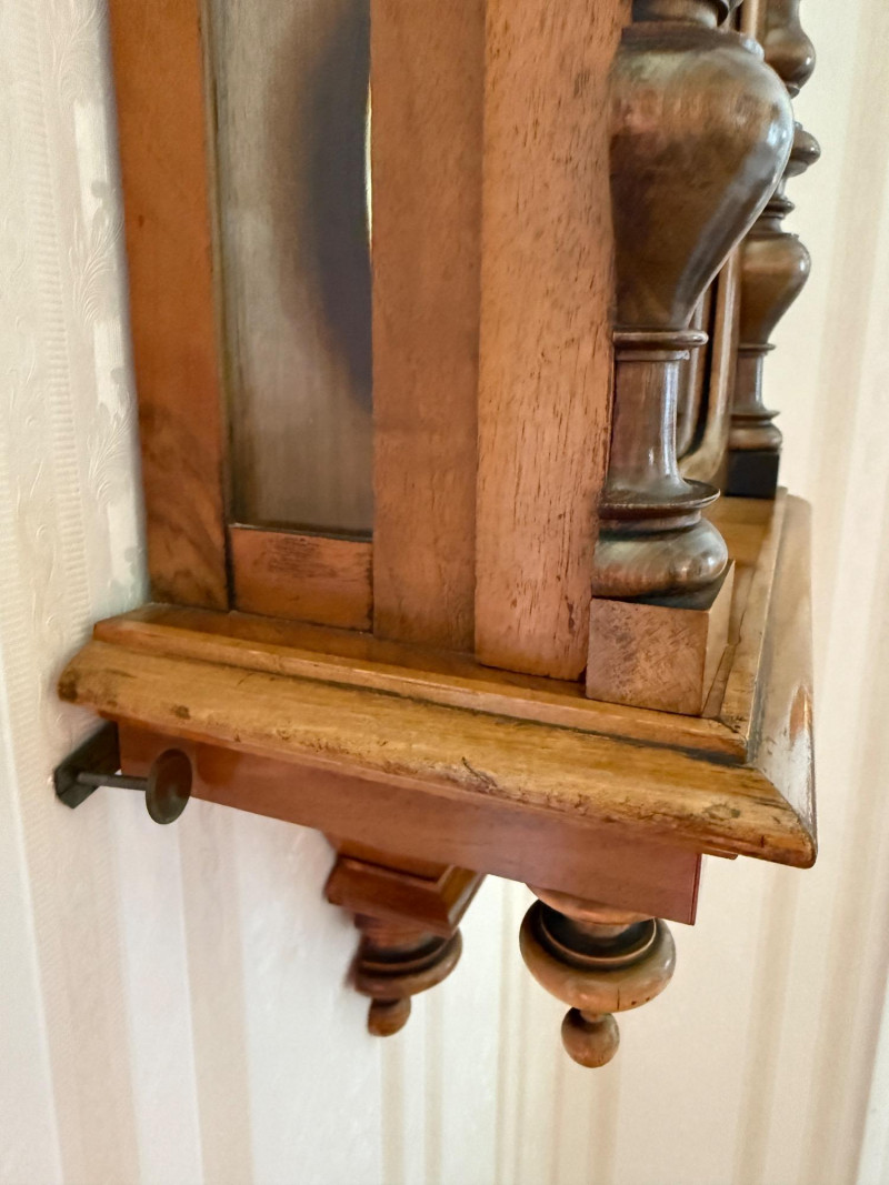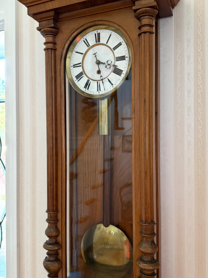 Antique Vienna Single Weight Regulator Clock These clocks often feature ornate carvings and high-quality wood, reflecting the craftsmanship of the era. The clean lines and functional elegance made them popular in middle-class homes. Today, Vienna Regulator clocks are highly sought after by collectors for their historical significance and aesthetic appeal. They represent a blend of functionality and artistry that is characteristic of 19th-century clockmaking. This beautiful wood encased clock keeps time and comes with winding key.