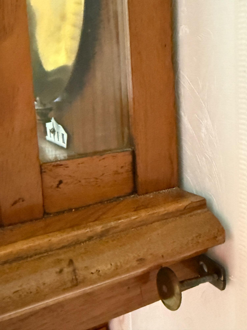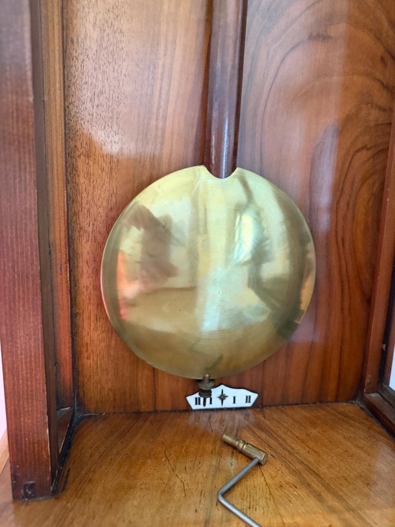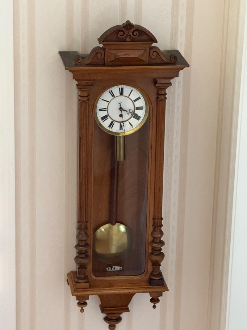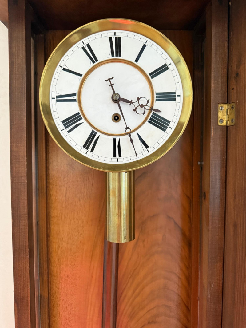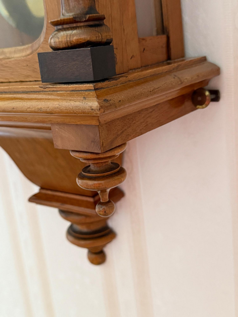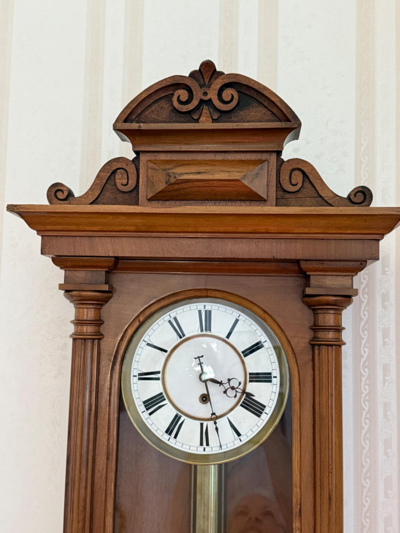 Antique Vienna Single Weight Regulator Clock These clocks often feature ornate carvings and high-quality wood, reflecting the craftsmanship of the era. The clean lines and functional elegance made them popular in middle-class homes. Today, Vienna Regulator clocks are highly sought after by collectors for their historical significance and aesthetic appeal. They represent a blend of functionality and artistry that is characteristic of 19th-century clockmaking. This beautiful wood encased clock keeps time and comes with winding key.