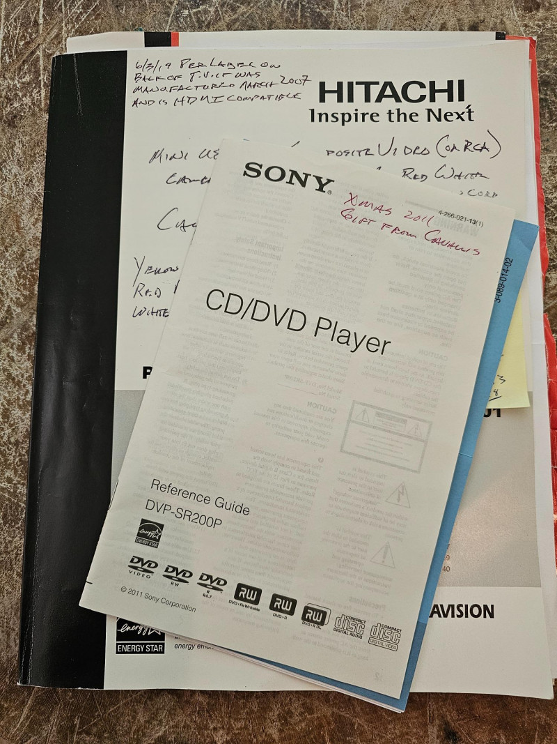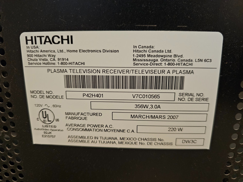 Hitachi 42" Plasma HDTV & Sony DVD/ CD/MP3 Player Hitachi Ultravision 42" Plasma HDTV Model #P42H4011 Mfg in 3/2007 Stand, 10-outlet surge protector, tv coax, power cord, manual & remote included Sony DVD/CD/MP3 Player Model #DVP-SR200P Mfg in 7/2011 HDMI cable, power cord, A/V cable, manual & remote included Both Tested - Both Work!