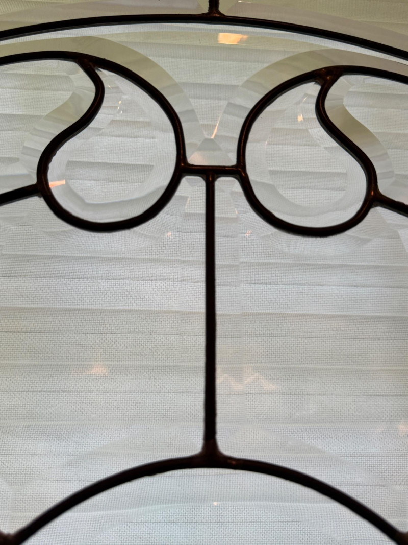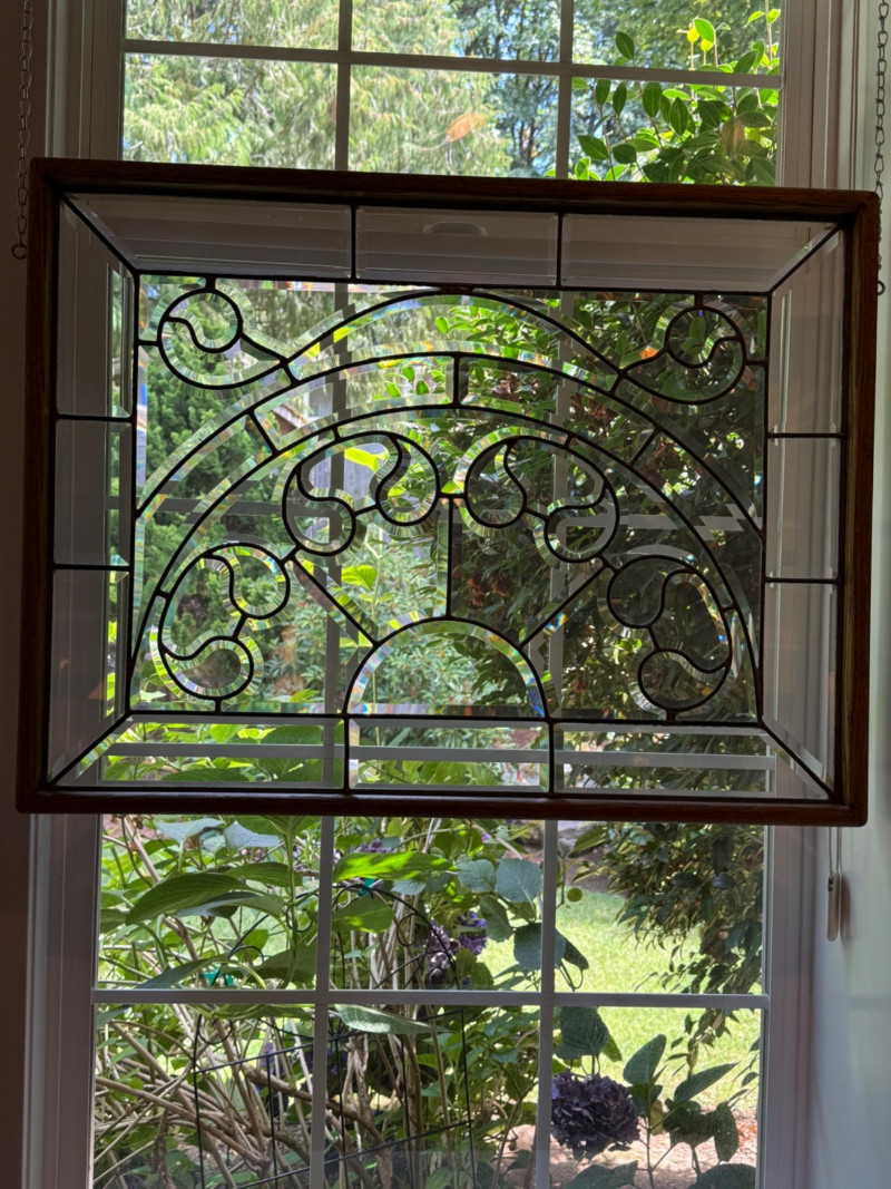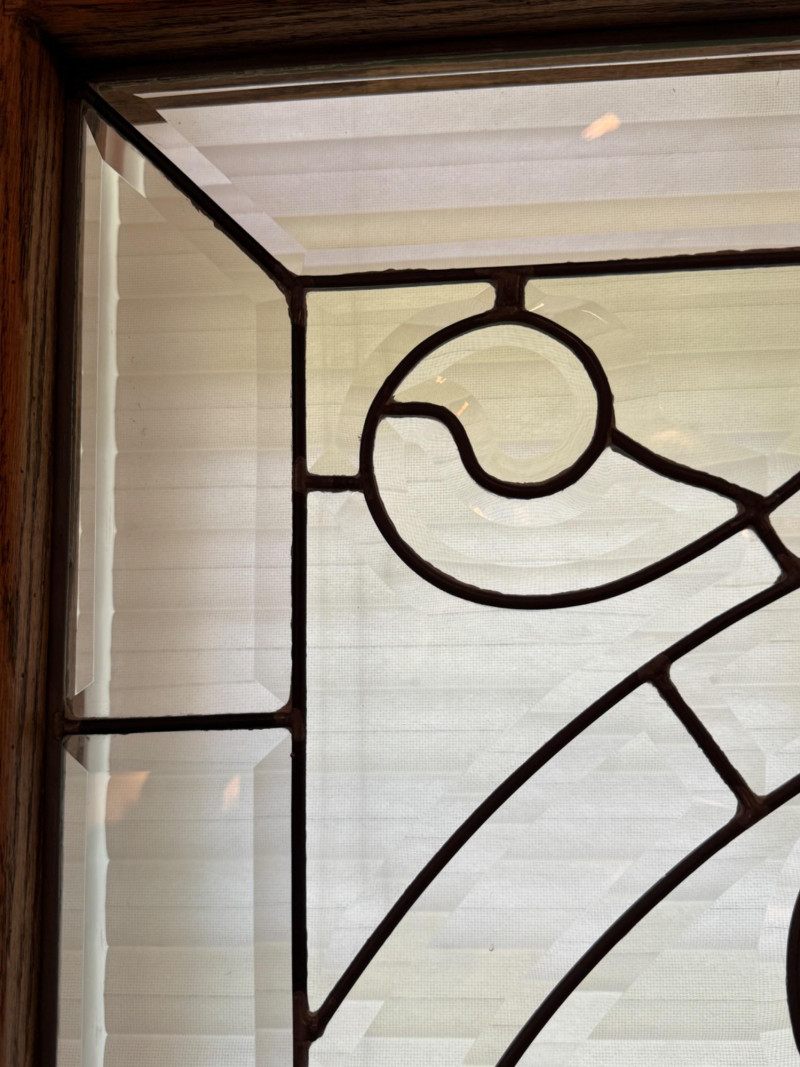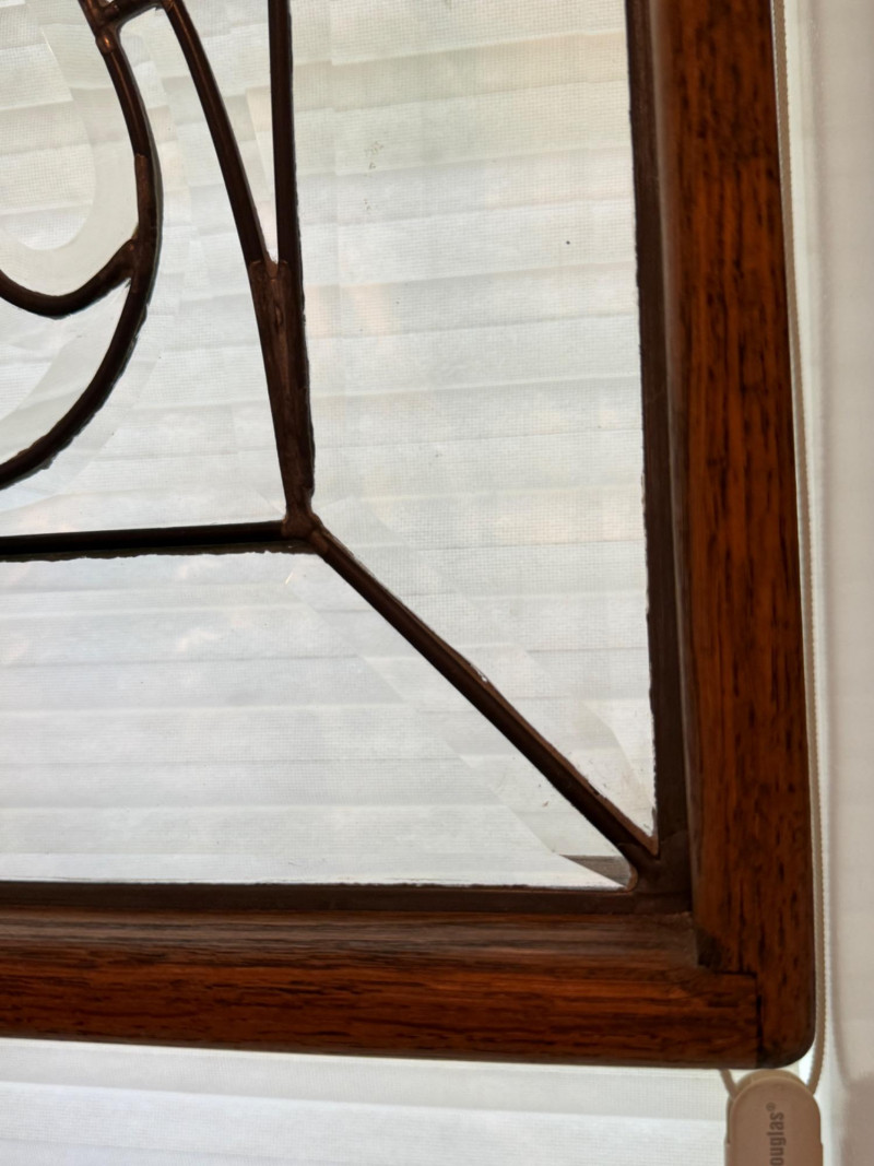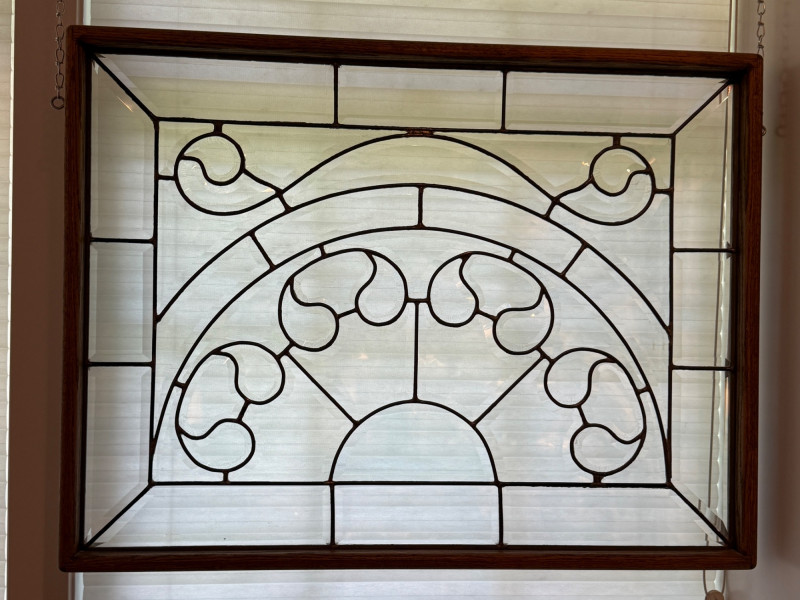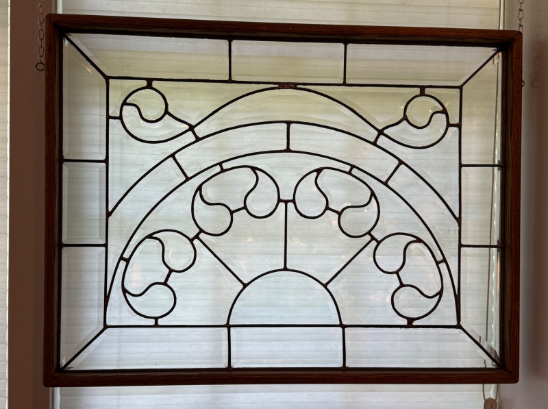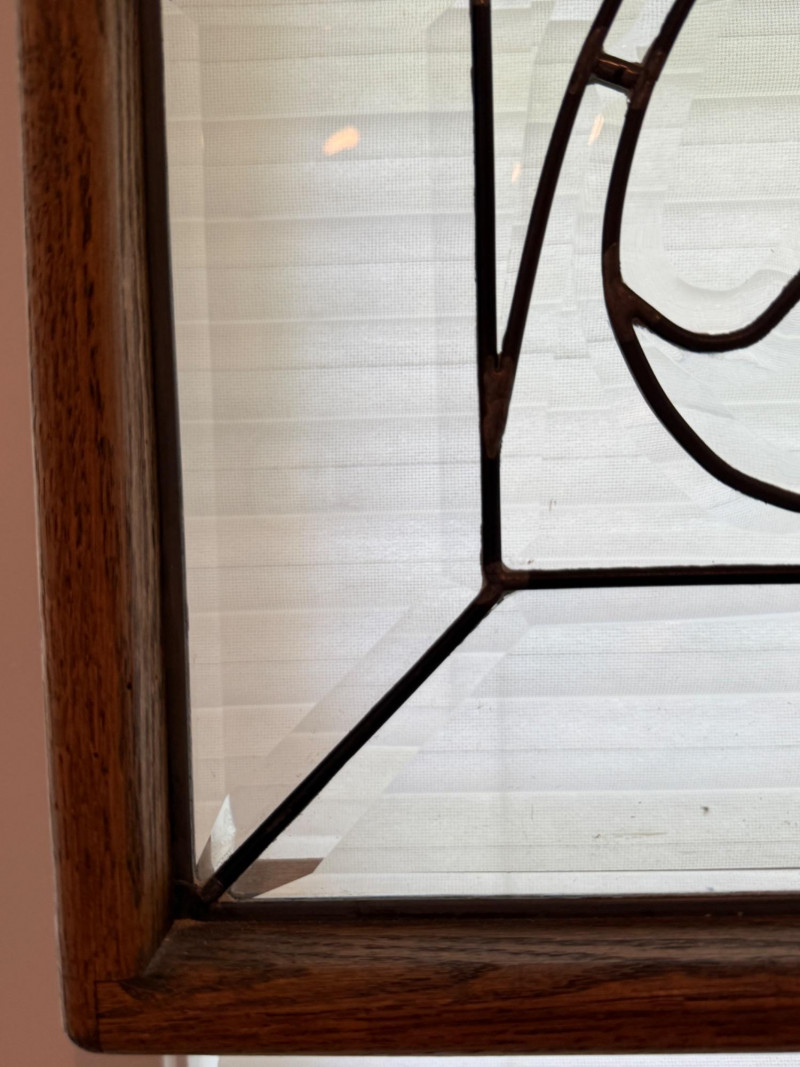 Wood Framed Hanging Leaded Beveled Glass Panel 32.5x24.5x2.5” rounded corner oak frame.