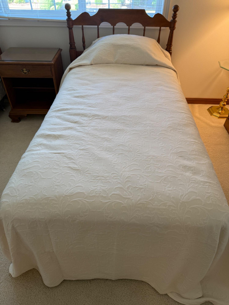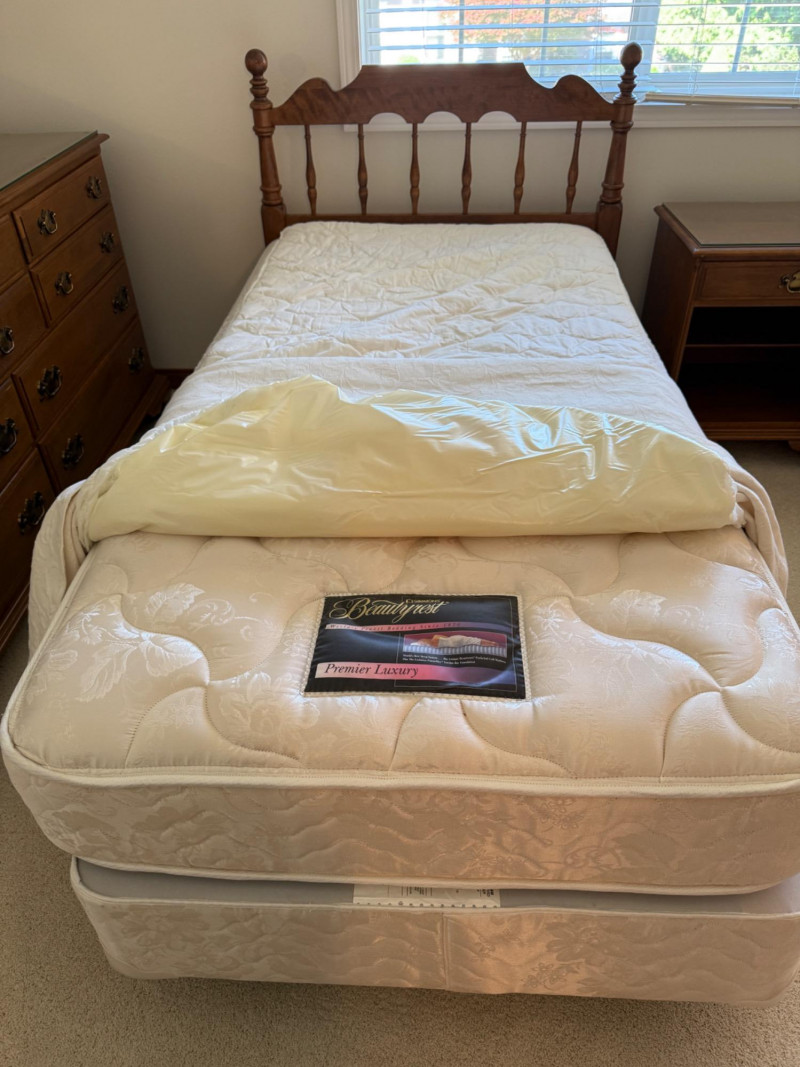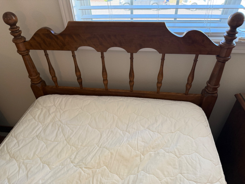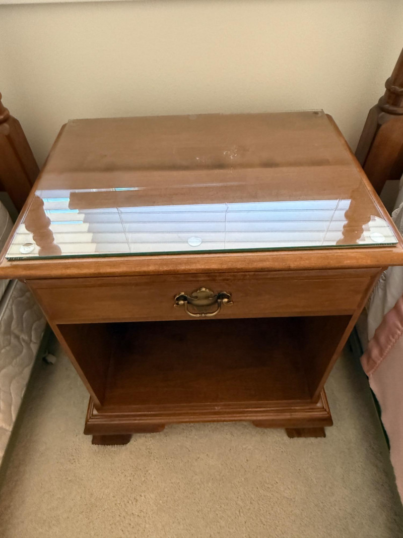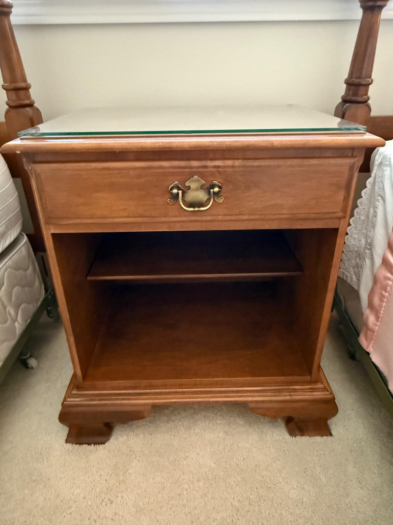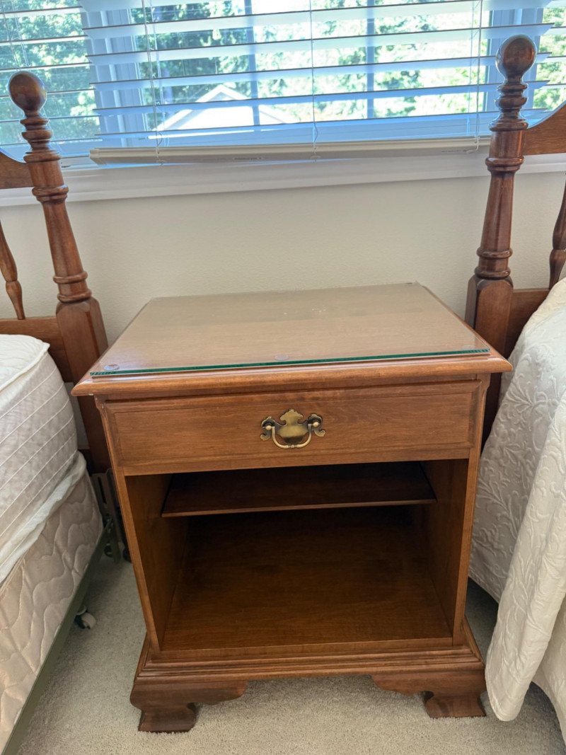 Ethan Allen Heirloom Nutmeg MapleCollection The 'Heirloom Nutmeg Maple' collection, which was popular for its warm finish and colonial-inspired design. The turned legs and brass-toned hardware are characteristic of this style, making it a recognizable and desirable piece for collectors of vintage American furniture. The design reflects a blend of functionality and aesthetic appeal, typical of Ethan Allen's approach to furniture making. dresser 65” x 19.5” x 34” tall with glass top. mirror 55“ x 35“ nightstand 22“ x 16“ x 25.5“ with glass top. (2) Twin bed headboards, mattresses and bedding. Headboards are 41”x41” Each piece is in B beautiful pristine condition.