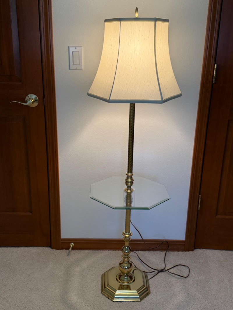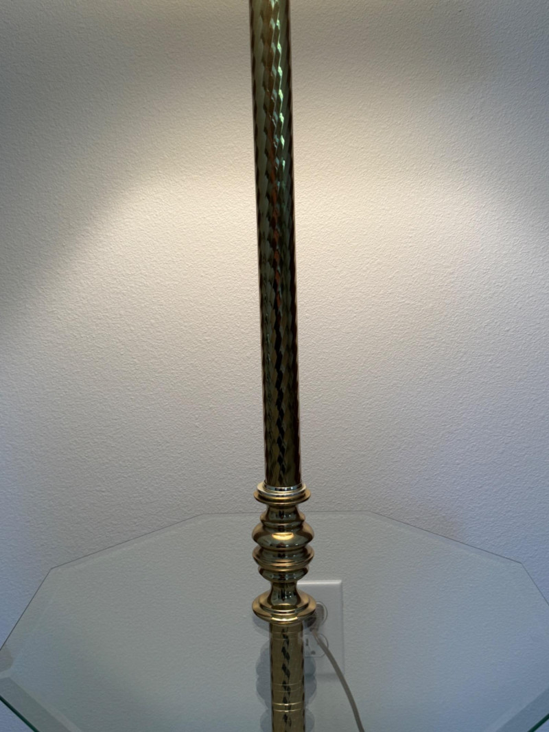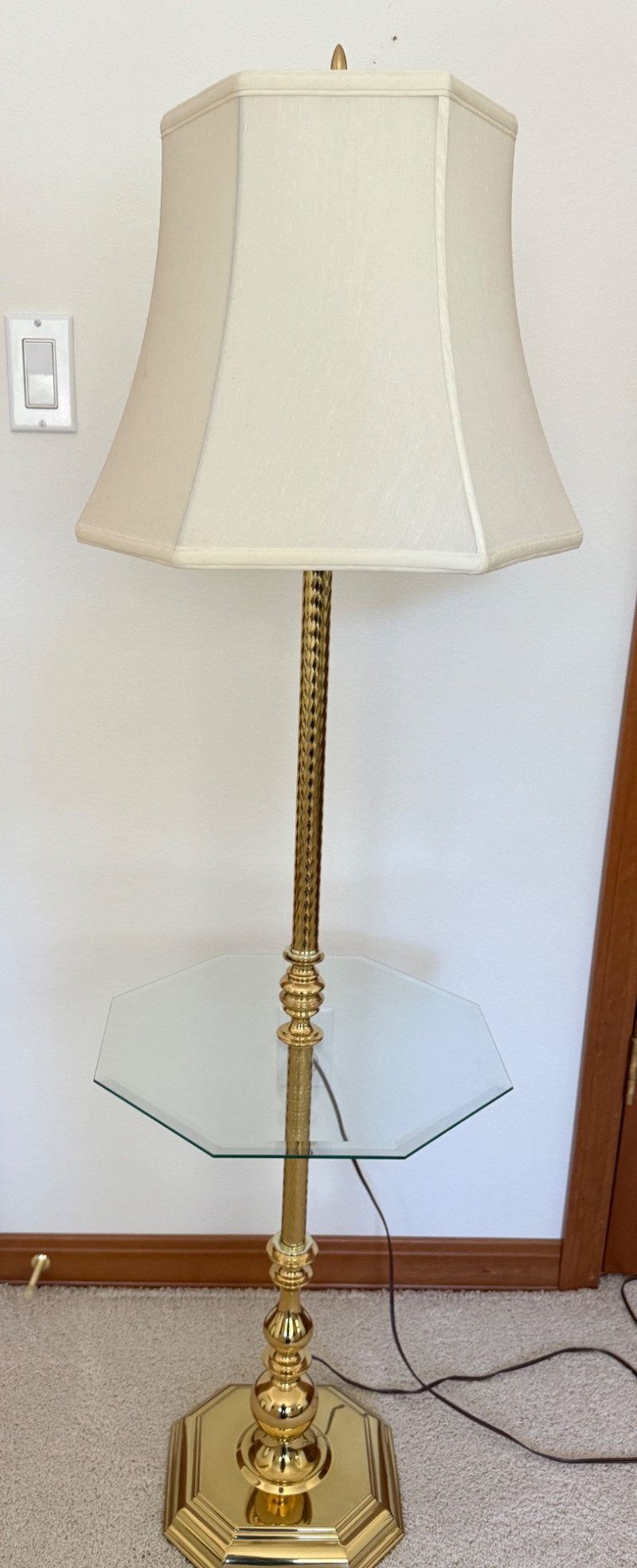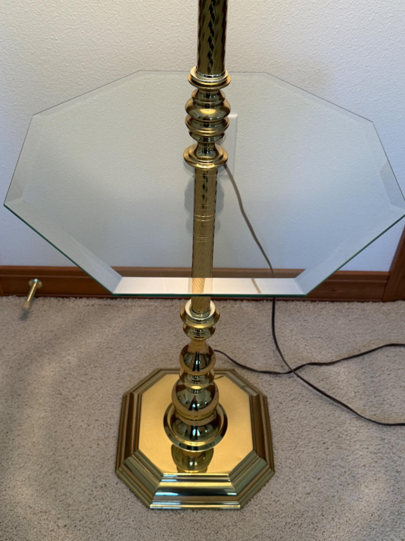 Brass and Glass 3-Way Lamp Table with twisted pole. 54” tall