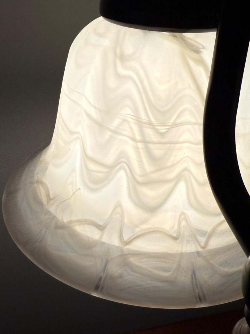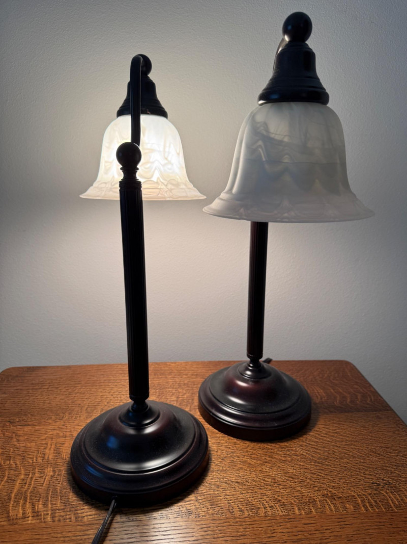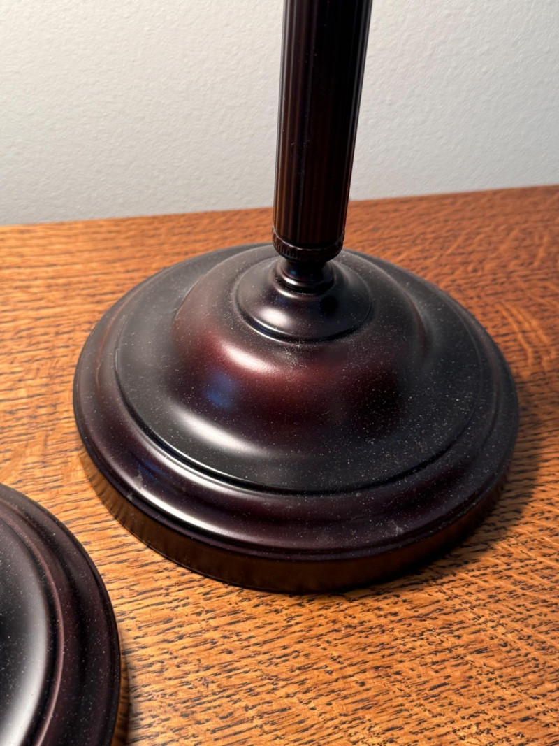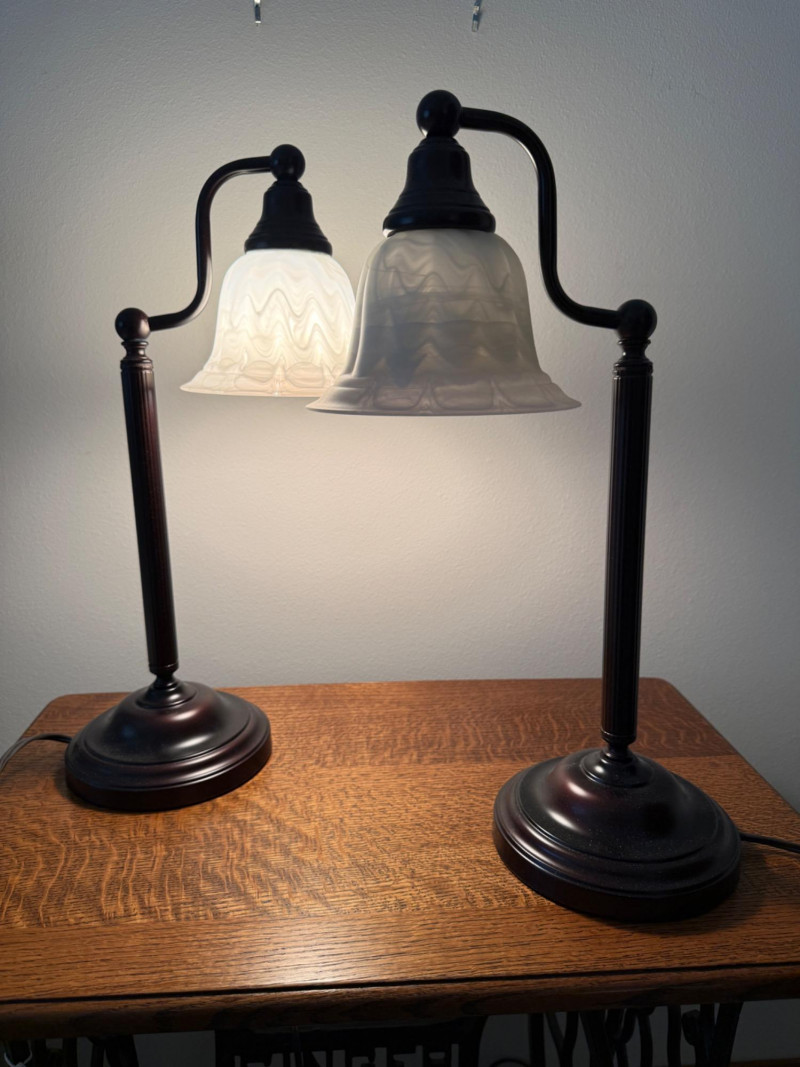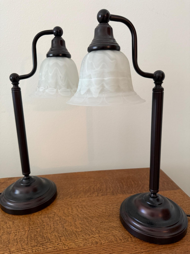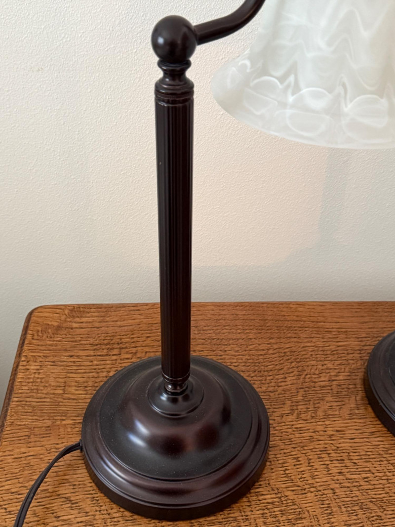 (2) Oil Rubbed Bronze Lamps with White Wispy Glass Shades 7” base by 21” tall in-line switch bed side lamps.