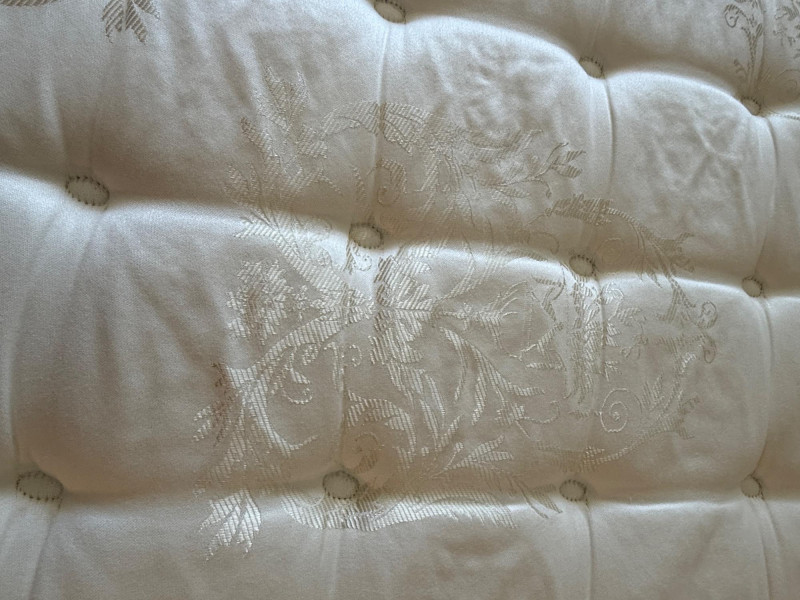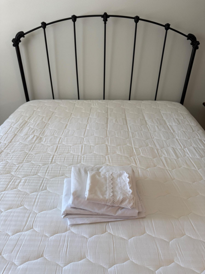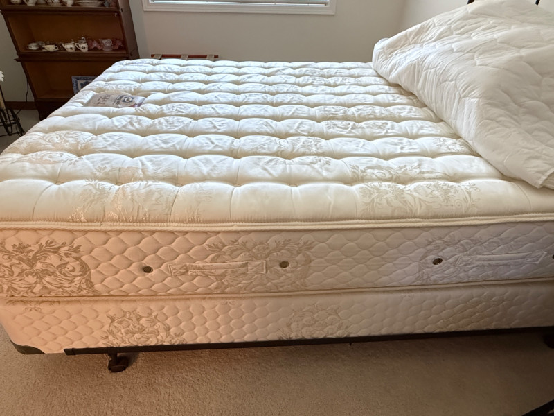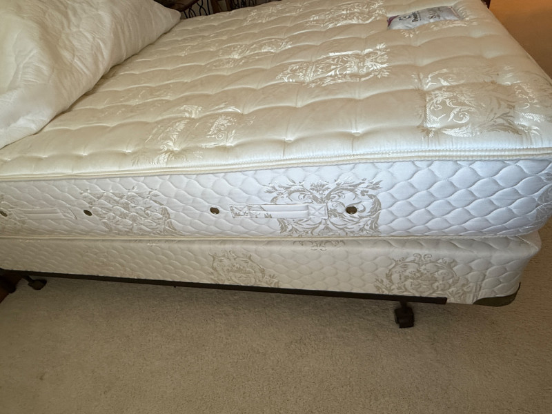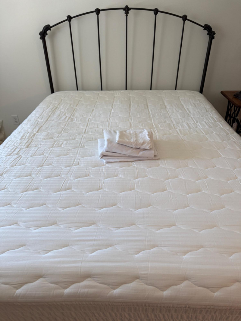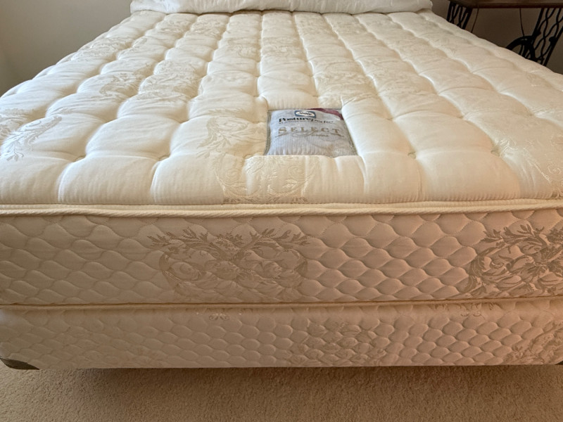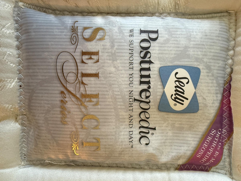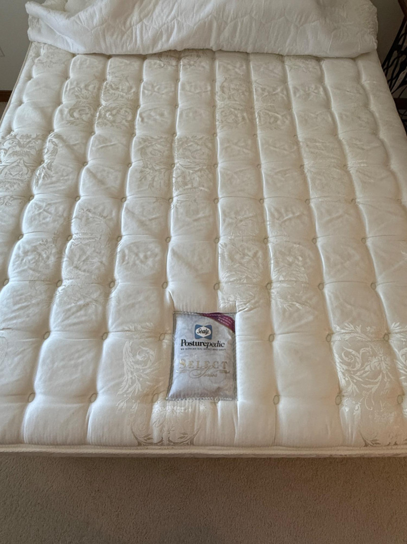 Black Iron Headboard and Frame with Queen Sealy Posturepedic Select Series Mattress & Boxspring. Mattress protector and sheet set. Mattress is clean with no signs of use or damage. Metal tube with iron accents Headboard is 61x57”