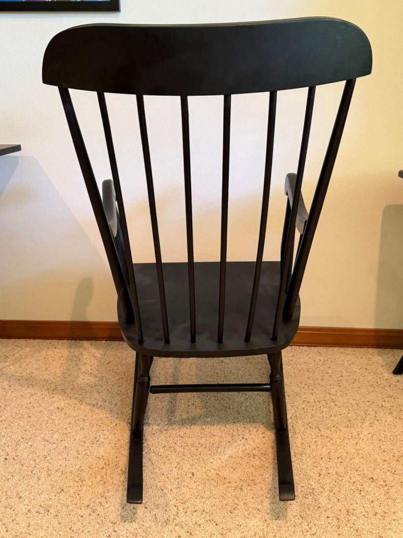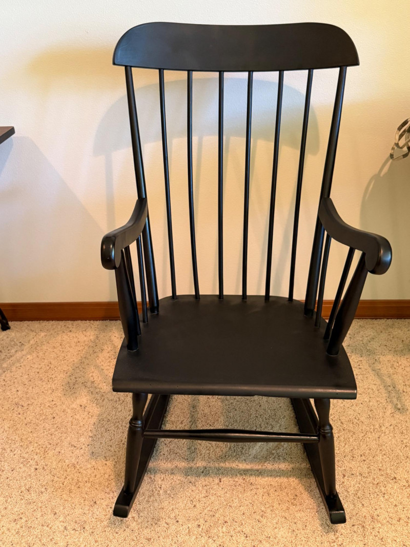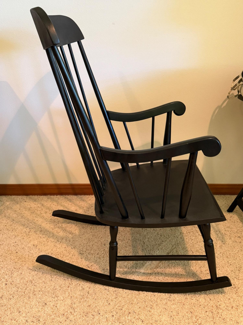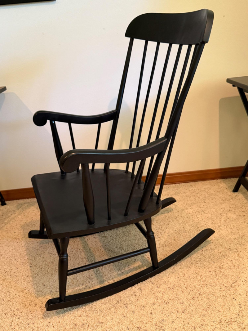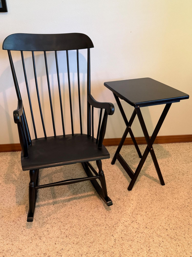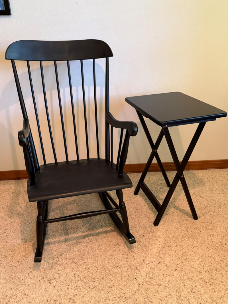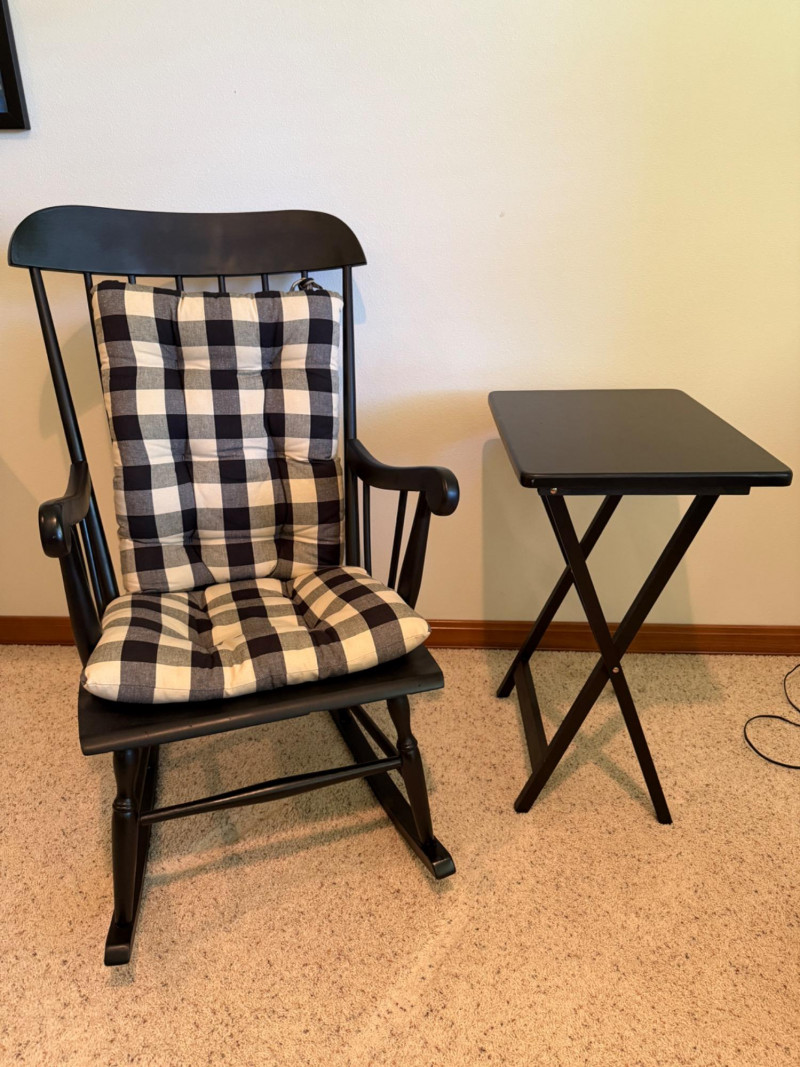 Black wood spindle back rocking chair with folding tray table. 23x31x38.5” rocking chair with buffalo plaid cushions. Tray table is 19x14.5x26.5”