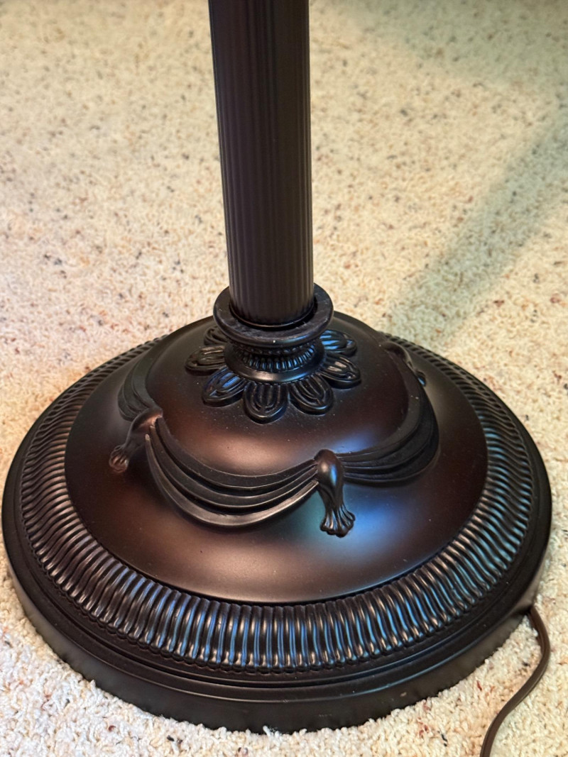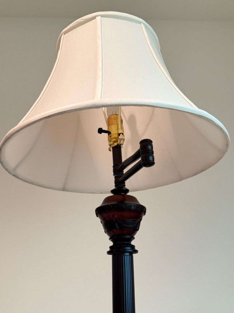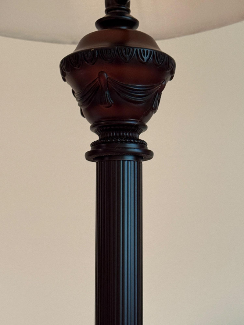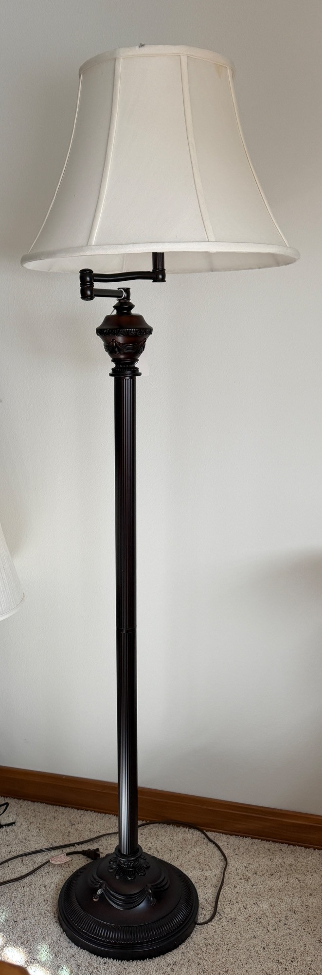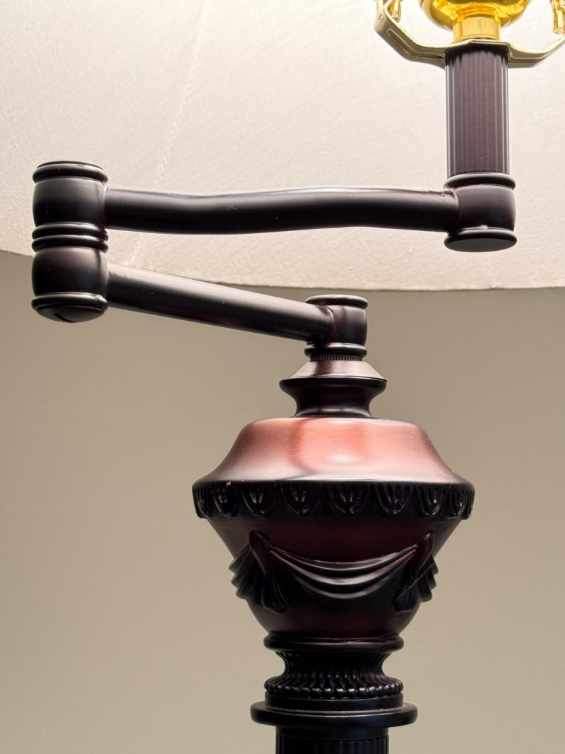 Oil Rubbed Bronze Corinthian Style Swing Arm 3-Way Lamp Base is 11”x59” with ivory fabric 17” shade. Works!