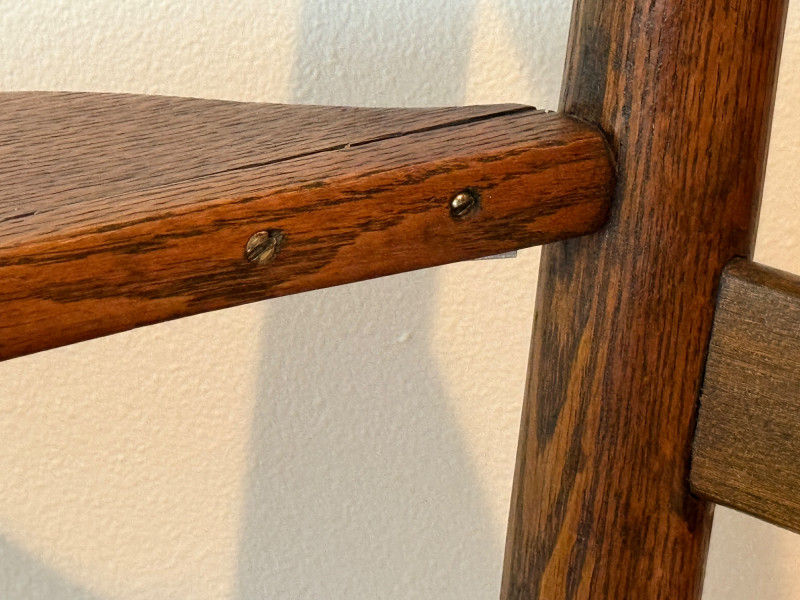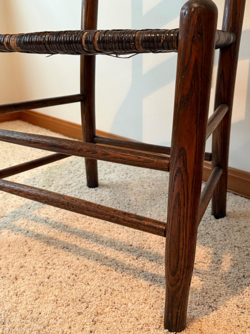 Dark oak right arm writing chair. Writing arm chairs, also known as writing arm Windsor chairs, were popular in the 18th and 19th centuries, particularly in educational settings and libraries. These chairs feature a built-in writing surface, providing a convenient and comfortable place for reading and writing. The design often includes a spindle back, turned legs, and a shaped seat for added comfort. These chairs were commonly made from hardwoods.
