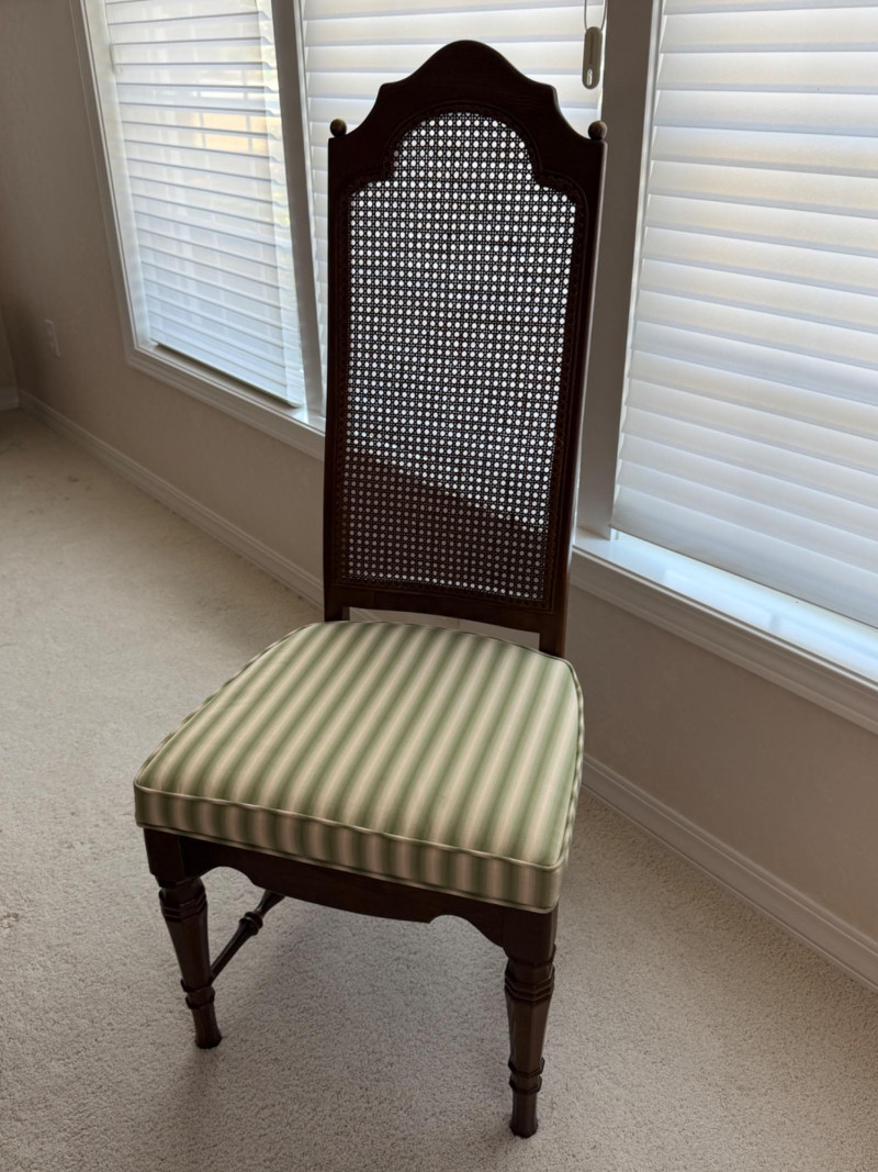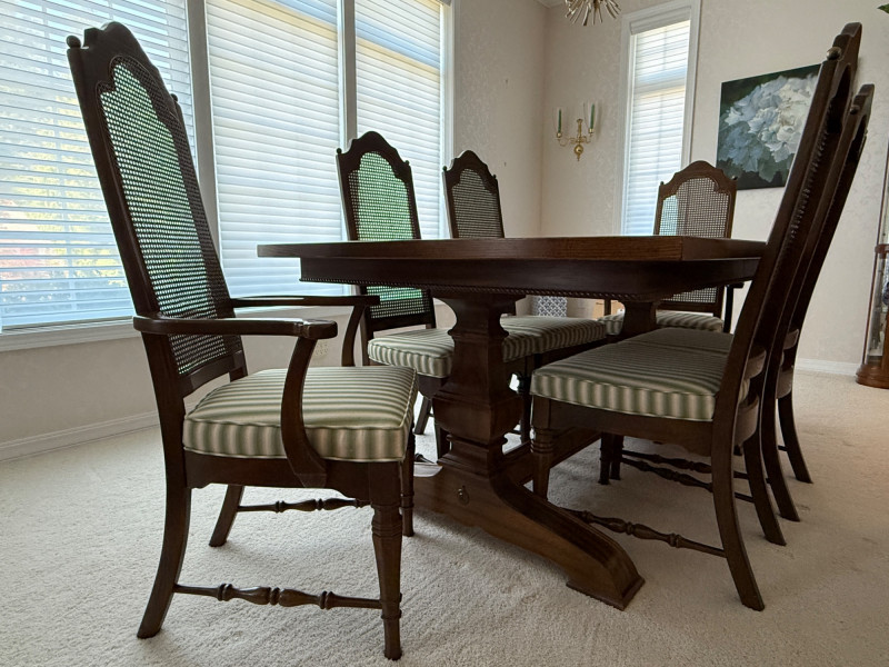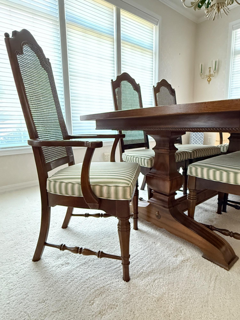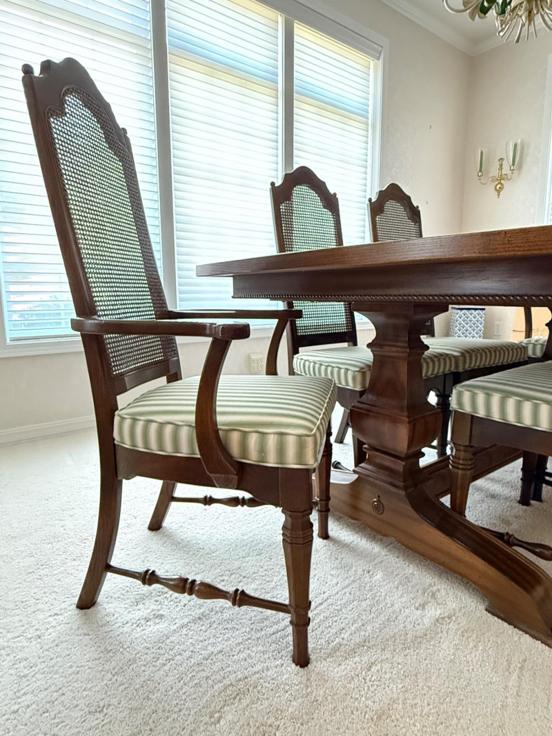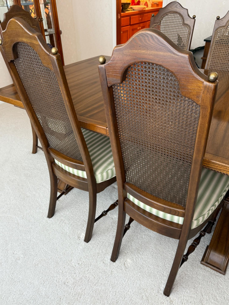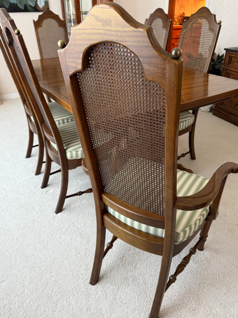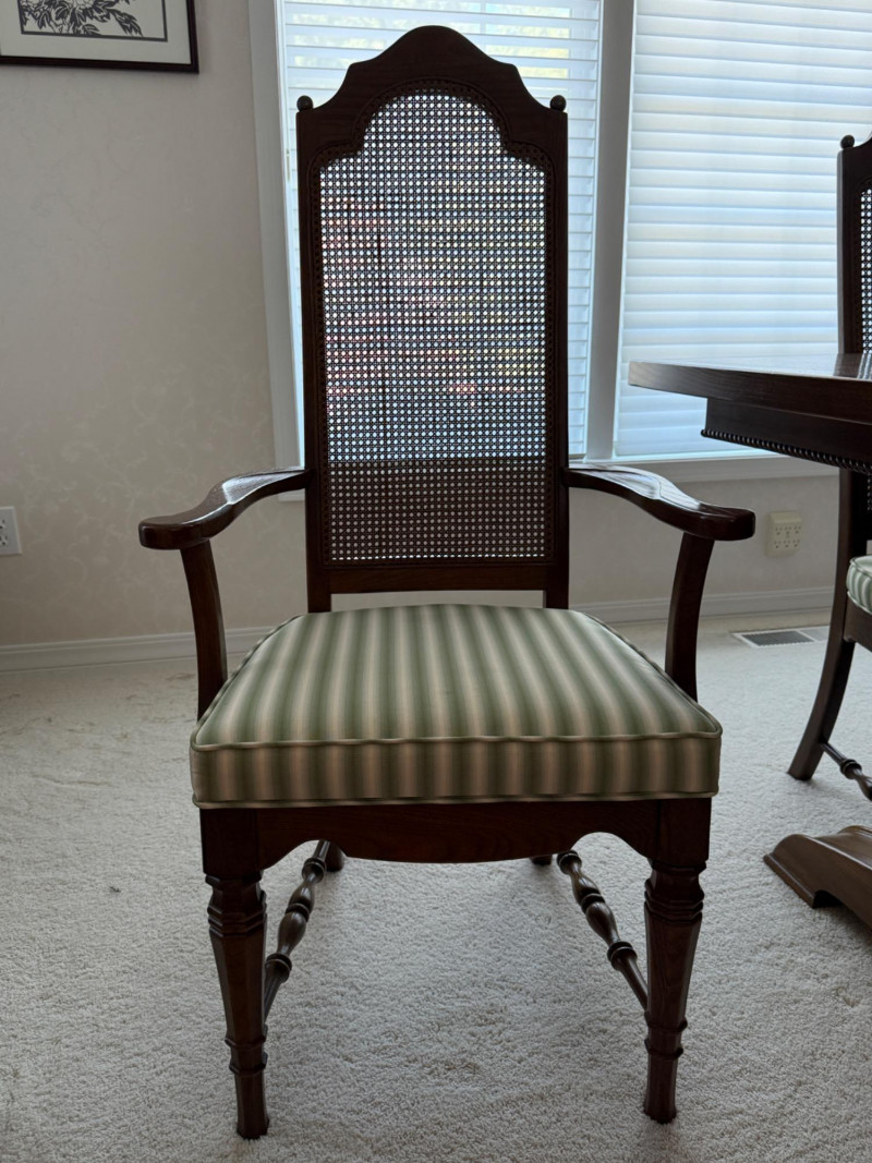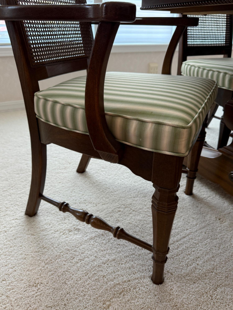 Thomasville Dining Set With Cane Back Chairs 68x44x30 Two section dining table and expands with 2 leaves (each 14” wide). 4 dining chairs and 2 arm chairs with cane back and green striped upholstered cushions. Arm chair measures 24x25x46” and 18” seat height. Comes with rigid padded folding surface protector that has done its job over the years. This set is beautiful!