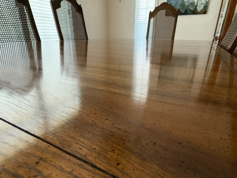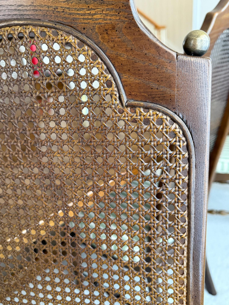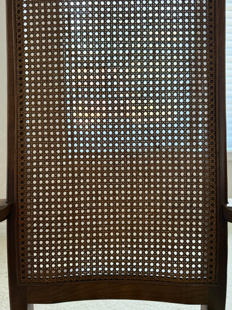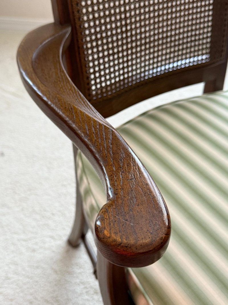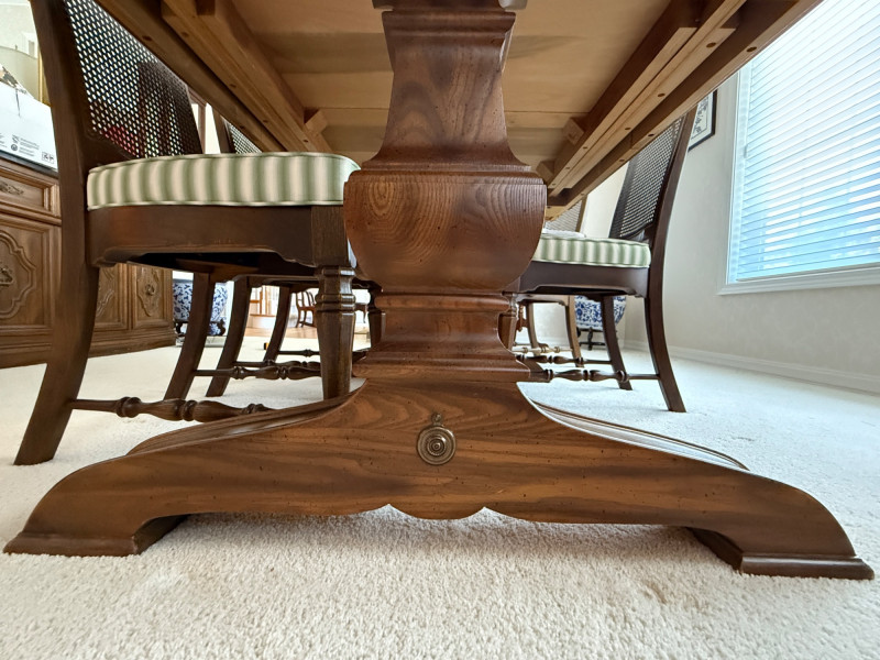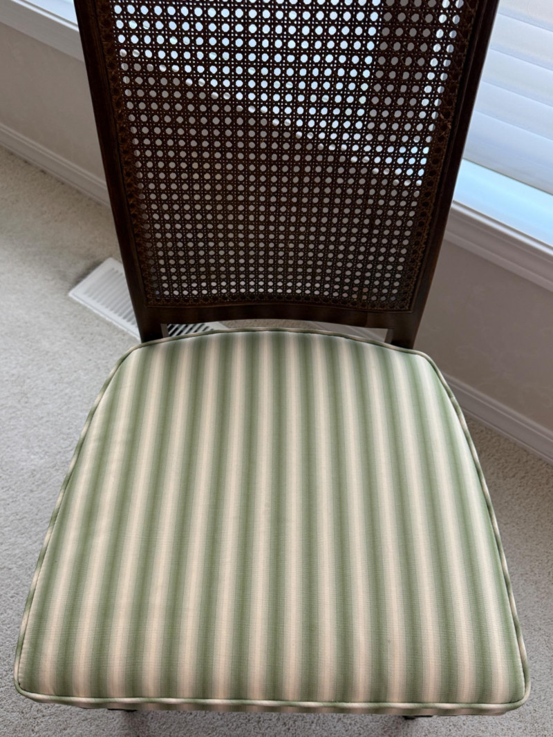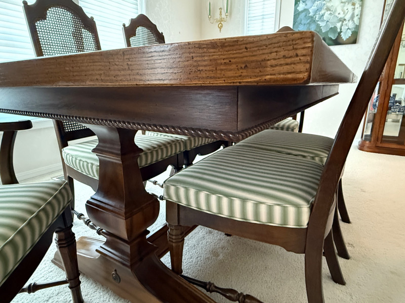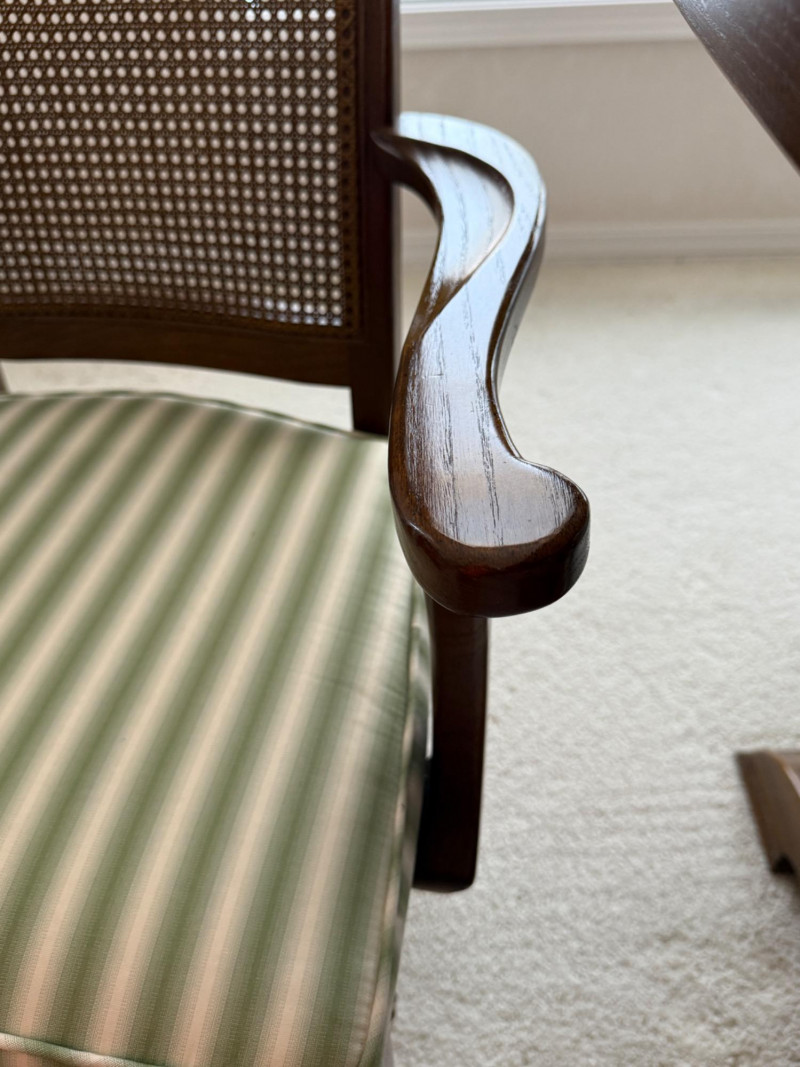 Thomasville Dining Set With Cane Back Chairs 68x44x30 Two section dining table and expands with 2 leaves (each 14” wide). 4 dining chairs and 2 arm chairs with cane back and green striped upholstered cushions. Arm chair measures 24x25x46” and 18” seat height. Comes with rigid padded folding surface protector that has done its job over the years. This set is beautiful!