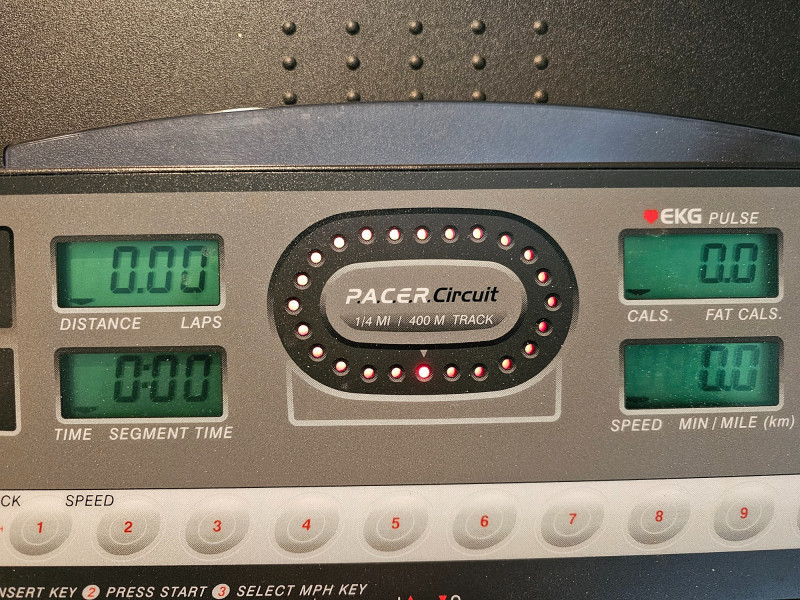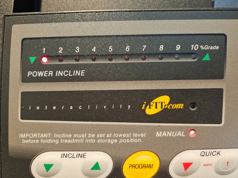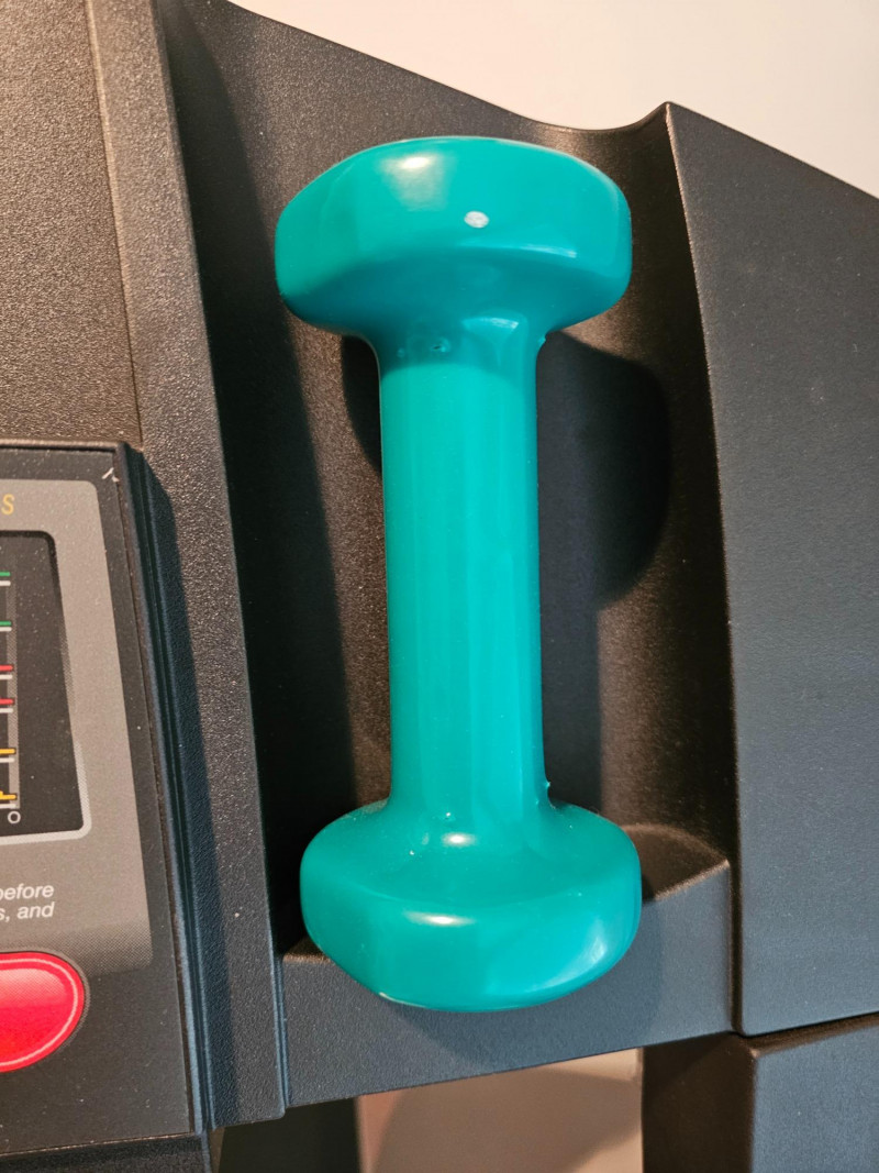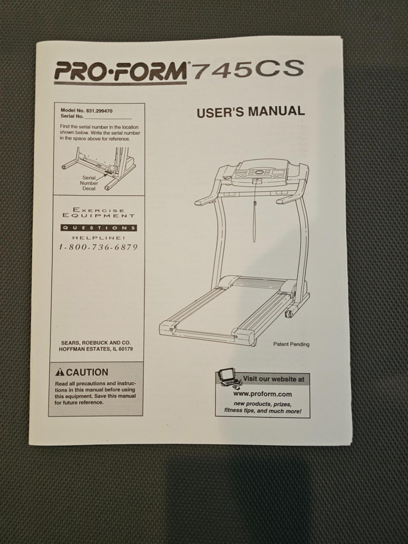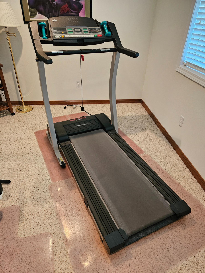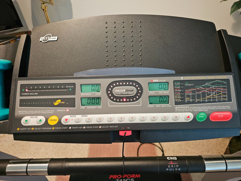 ProForm 745CS Treadmill Features: Space Saver Design: The treadmill folds up vertically for compact storage. 2.5 HP Motor: Enables speeds of up to 12 mph. 0-10% Incline: Adjustable incline for varied workout intensity. Console Features: Includes an LED display showing workout information like distance, laps, time, and estimated calories burned. Pulse Sensors: Built-in sensors in the handles allow for heart rate monitoring. Pre-programmed Workouts: Comes with ten personal trainer workouts that automatically adjust speed and incline. Quiet Deck technology Includes 2 small hand weights & manual Tested - Works! 51"T x 34"W x 67"D