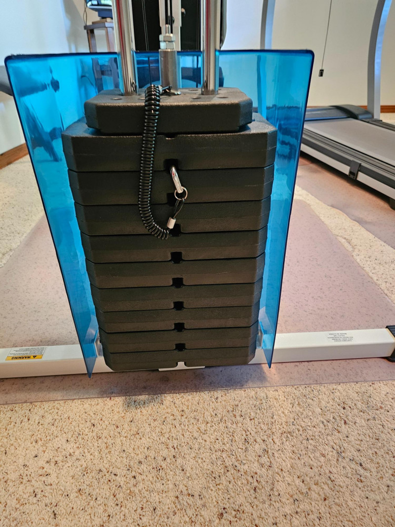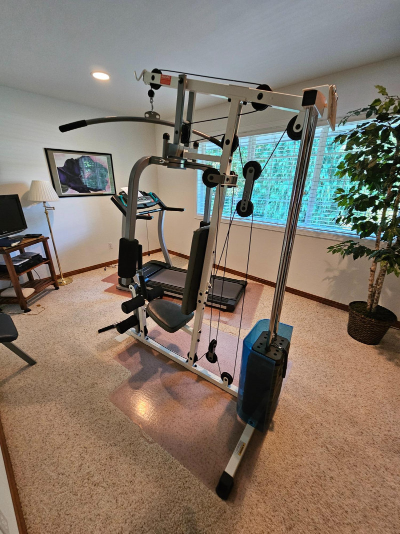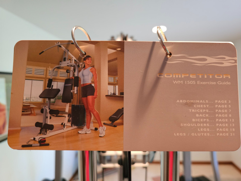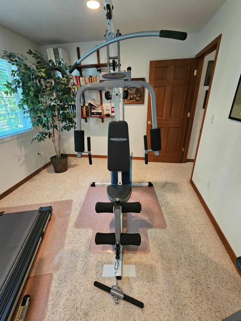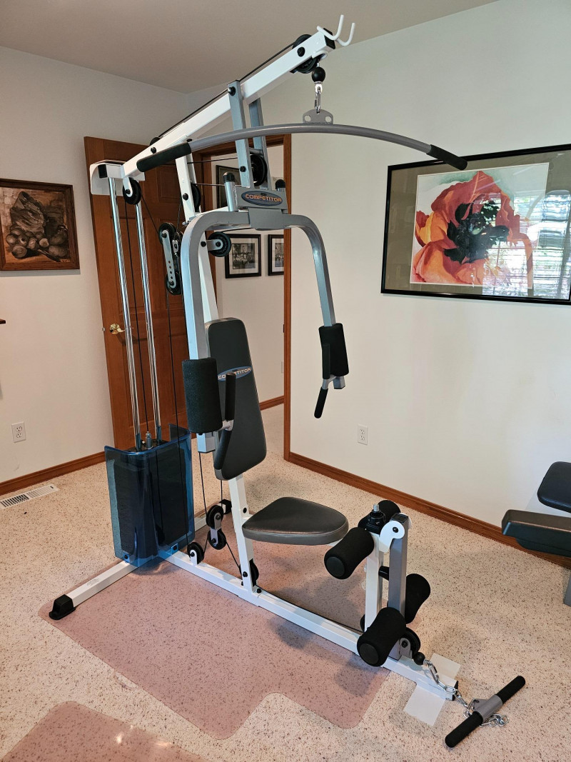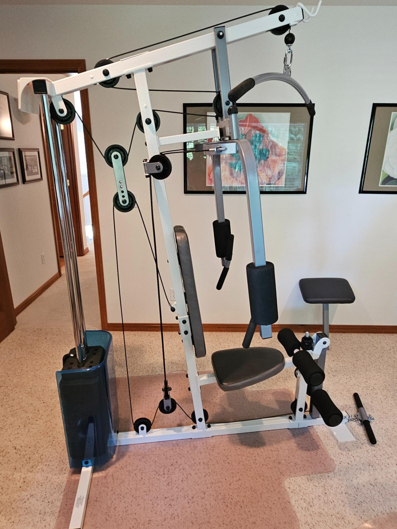 Impex Competitor Home Gym Model #WM-1505 The Impex Home Gym WM-1505 is a compact and versatile home gym system designed for full-body workouts Exercises: It supports a variety of exercises including abdominal crunch, various rows, presses, raises, pulldowns, curls, extensions, kickbacks, and tricep pushdowns. A more comprehensive list of supported exercises can be found in the referenced documents. Resistance: The gym uses a weight stack with 9 plates. It provides up to 126 pounds of resistance for the front press, 110 pounds for most other exercises, and 55 pounds for the butterfly function. Construction: It features a sturdy steel frame. Dimensions: The assembled dimensions are 82"x43"x80" with a total weight of 223 lbs. Includes manual, extra padded rest, hex keys & CD Tested - Works! 82"T x 43"W x 80"D