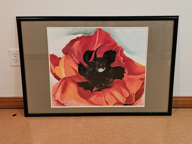Set Of 3 Large Framed & Matted Georgia O'Keeffe Prints "Red Poppy" - 1927 "White Camelia" - 1938 "Petunias" - 1925 Black frame with green & white matting Perfect to hang in the same room! 25"T x 37"W Very attractive and in excellent condition!