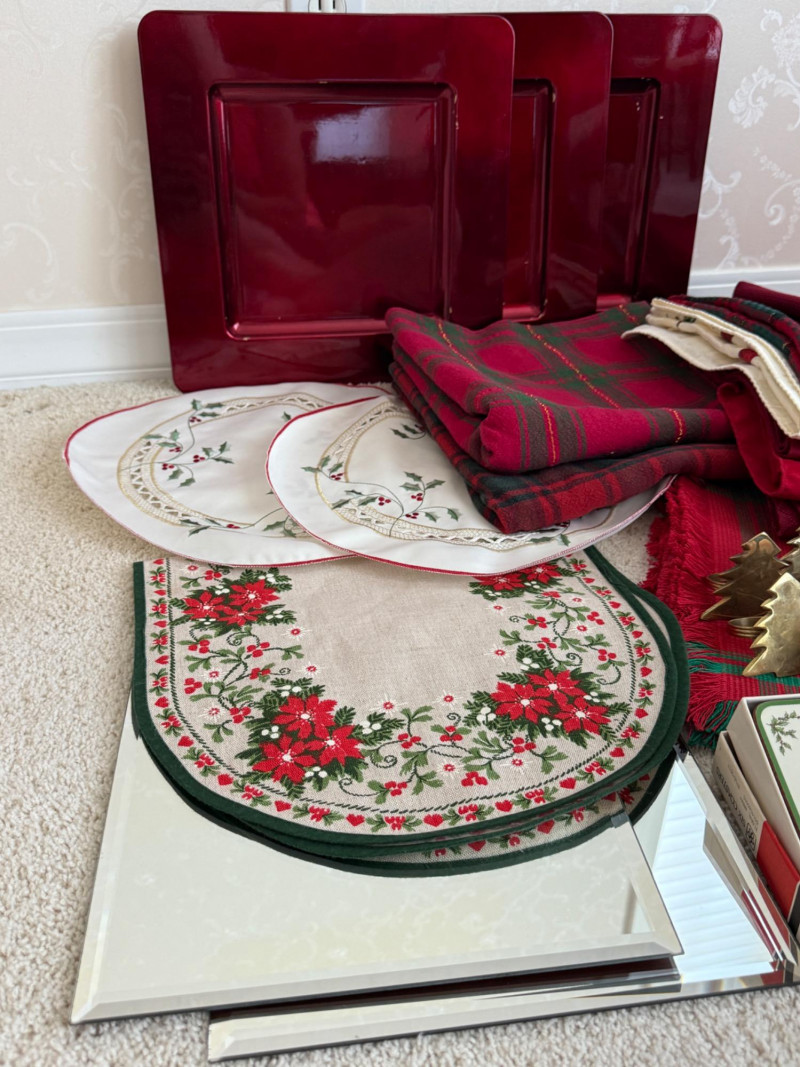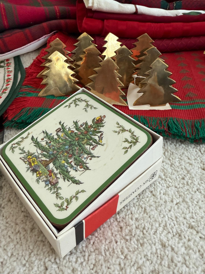 10 brass trees napkins rings 8 brass snowflake napkin rings 8 placemats Tablecloths 3 square chargers 4 square bevel mirror plates Pimpernel Deluxe Coaster Set in original box