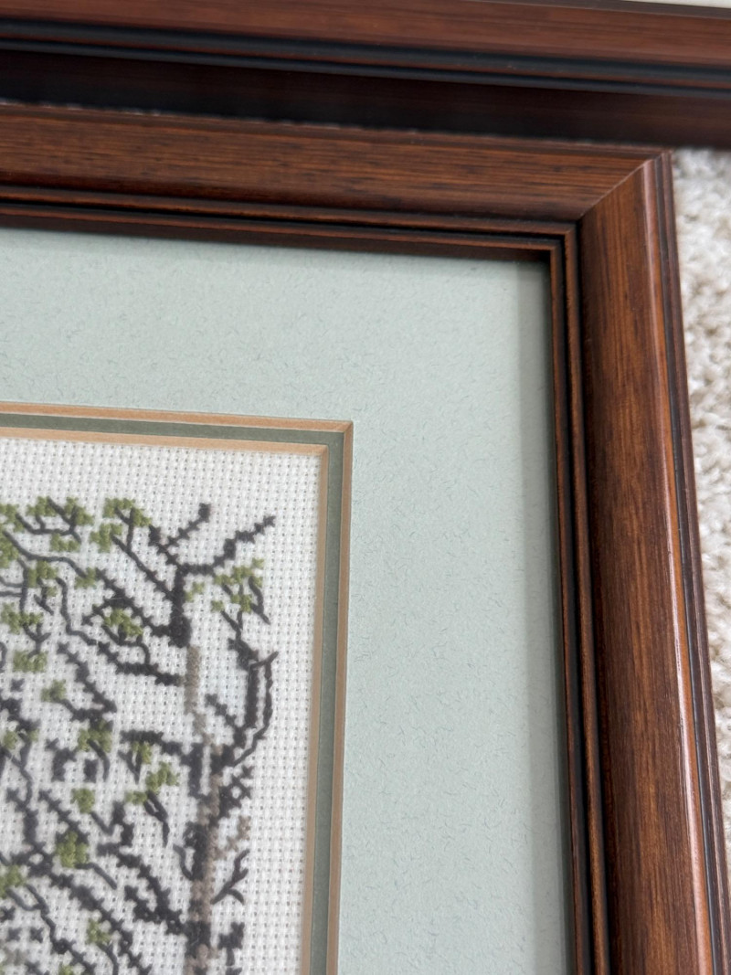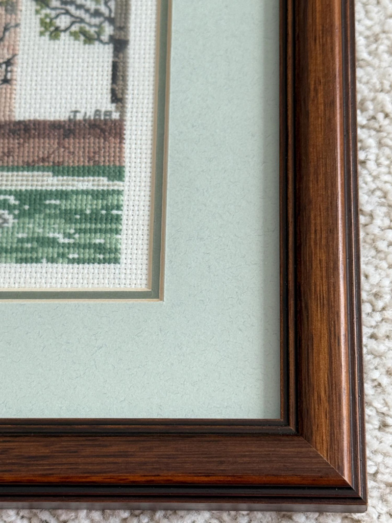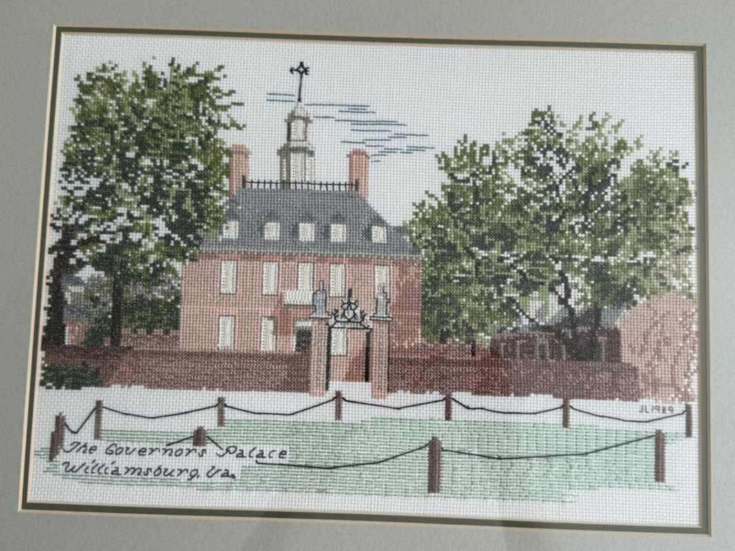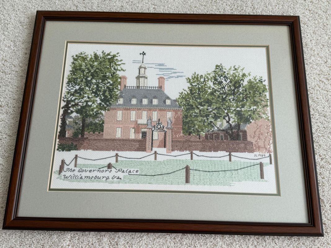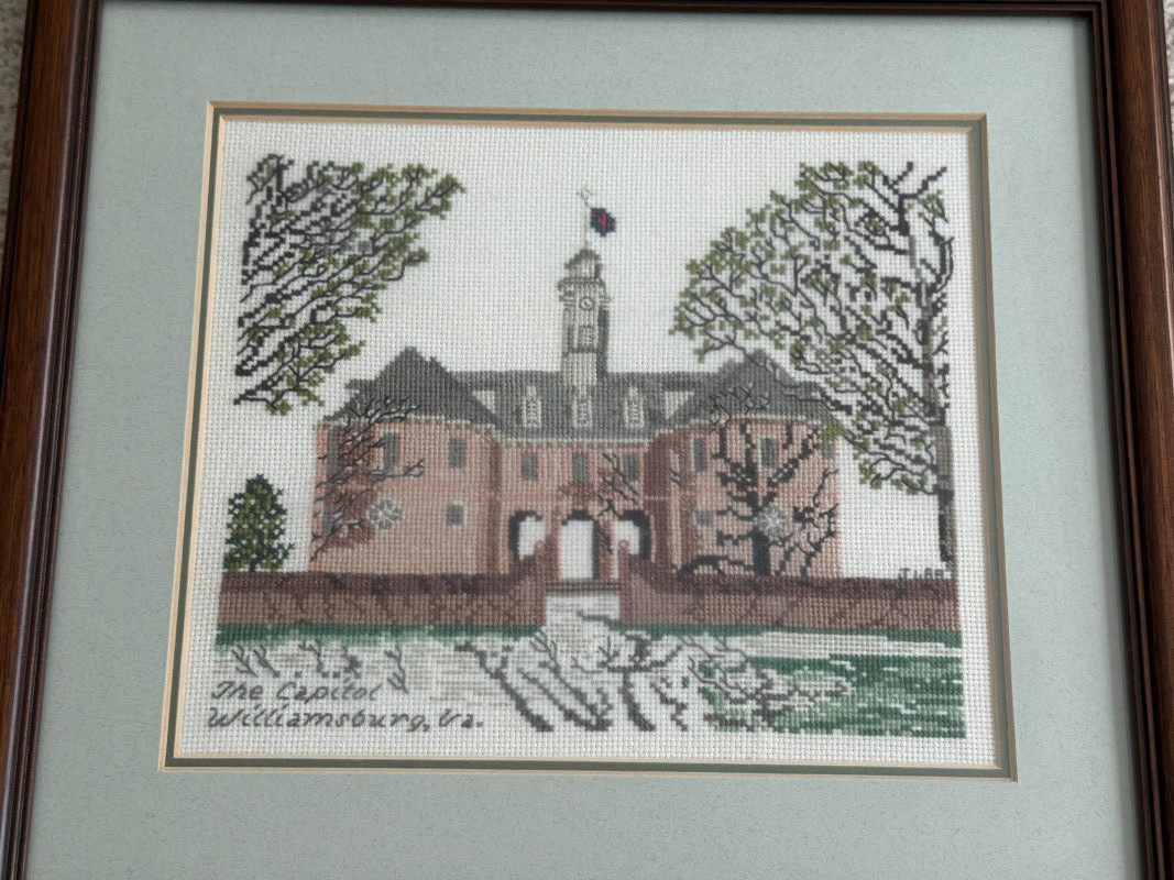 (3) Williamsburg Virginia Cross Stitch Art in Matching Marting and Wood Frames. The Governors Palace 19.75x15.75” The Capitol 11x12.5”