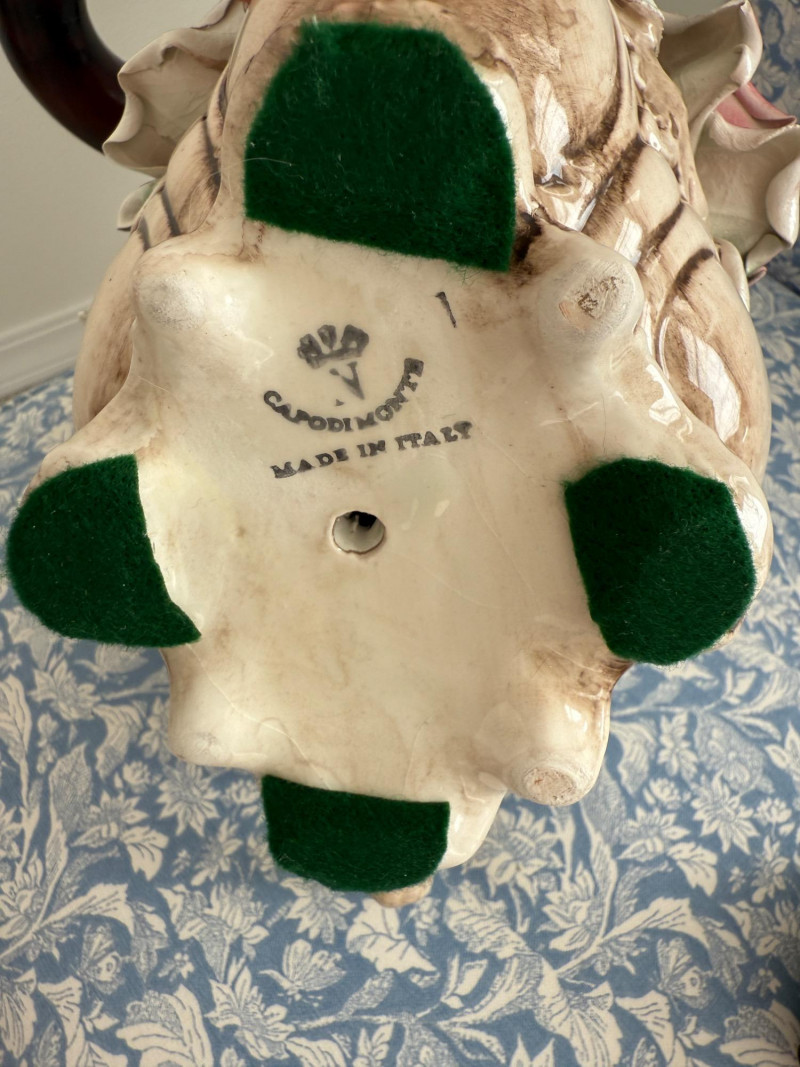 Capodimonte porcelain originates from the Real Fabbrica di Capodimonte manufactory in Naples, Italy, established between 1743 and 1759.