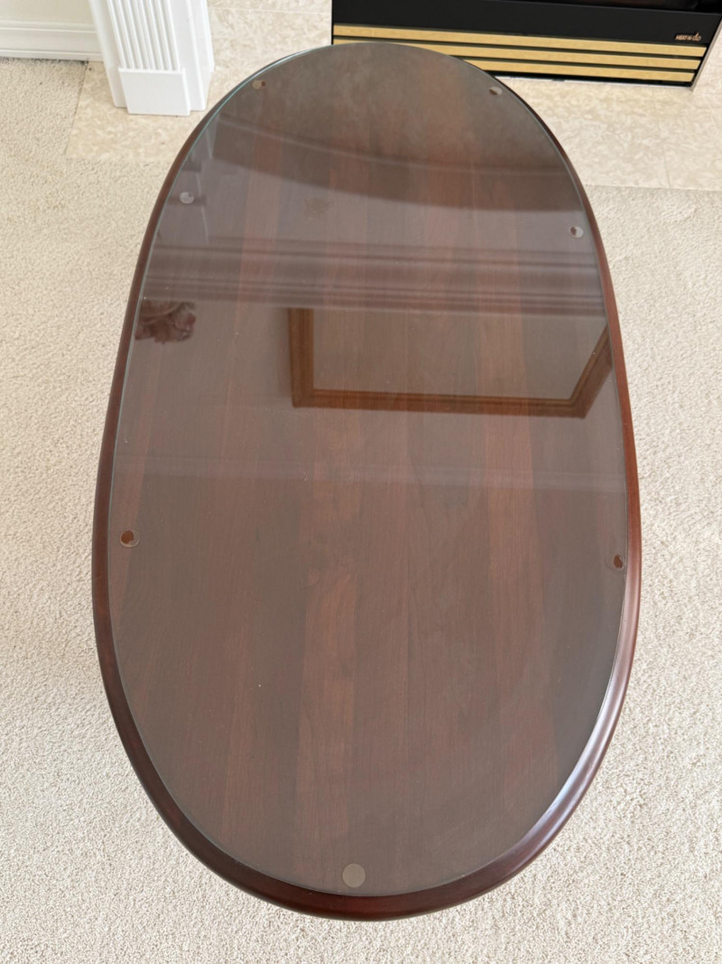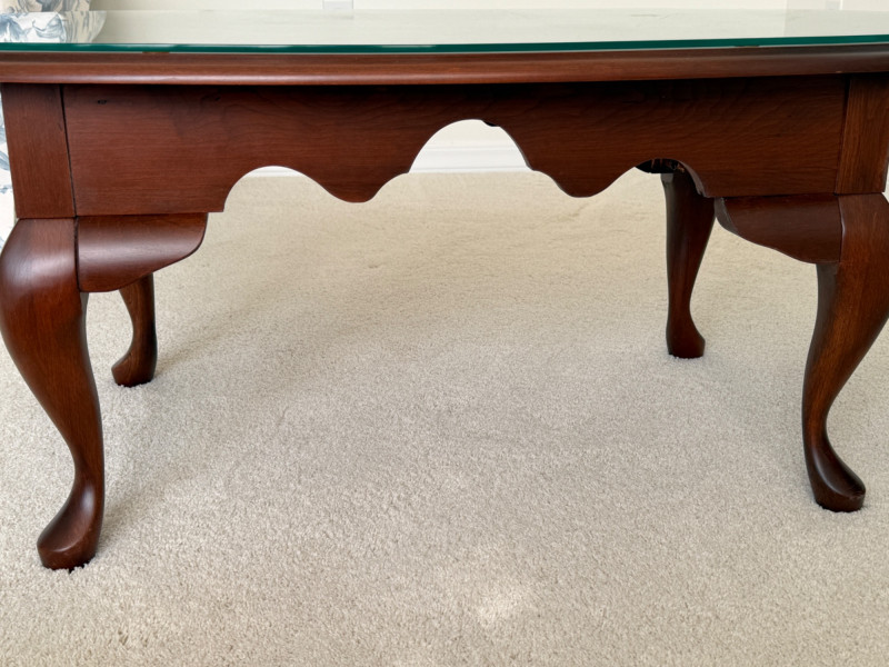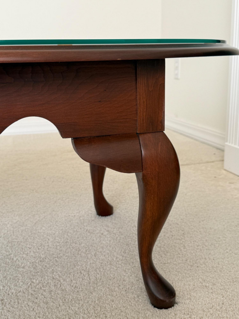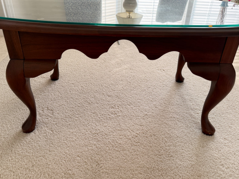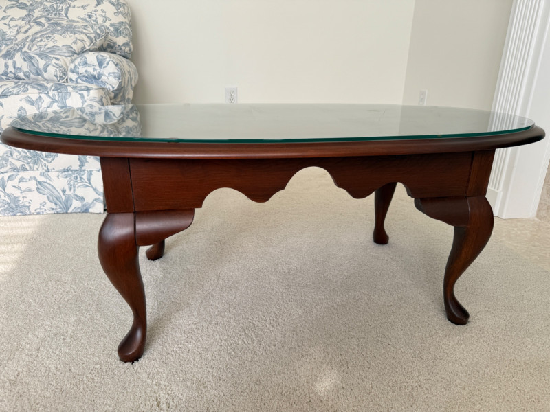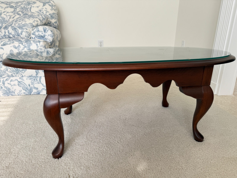 Oval Quality Queen Anne Coffee Table with glass top. Beautiful table in great condition! Solid table! 24x45x17.5” Coffee table.