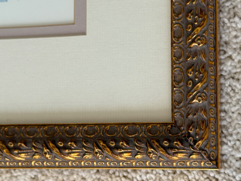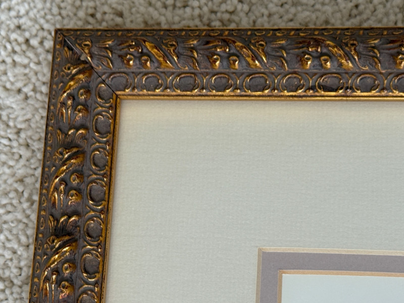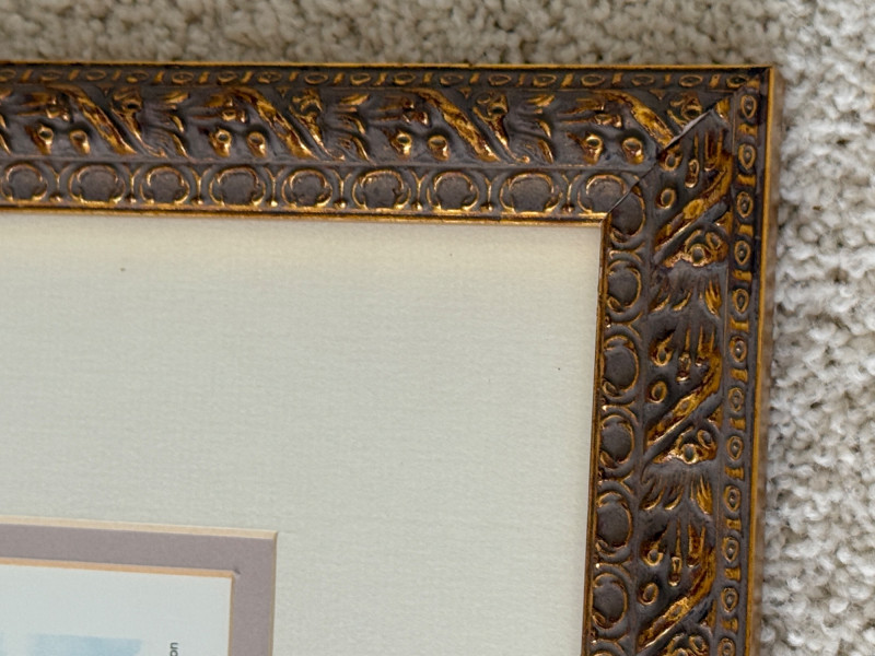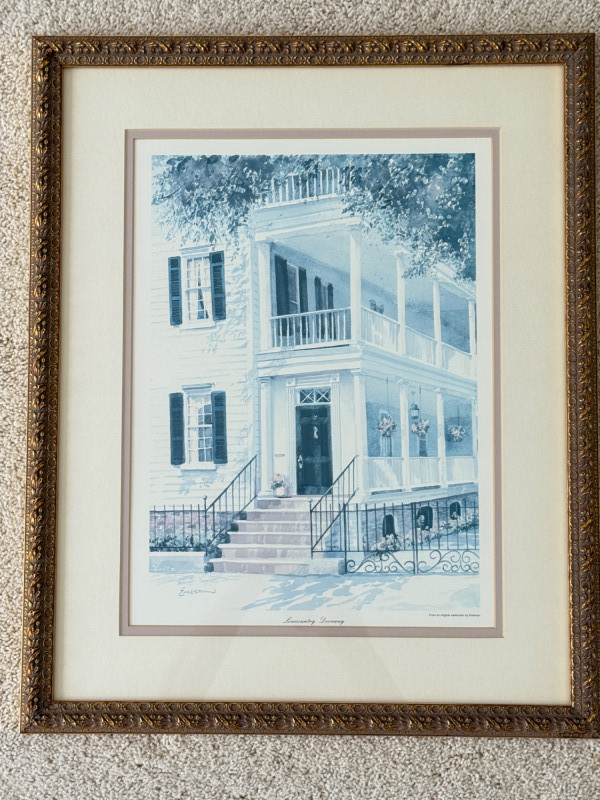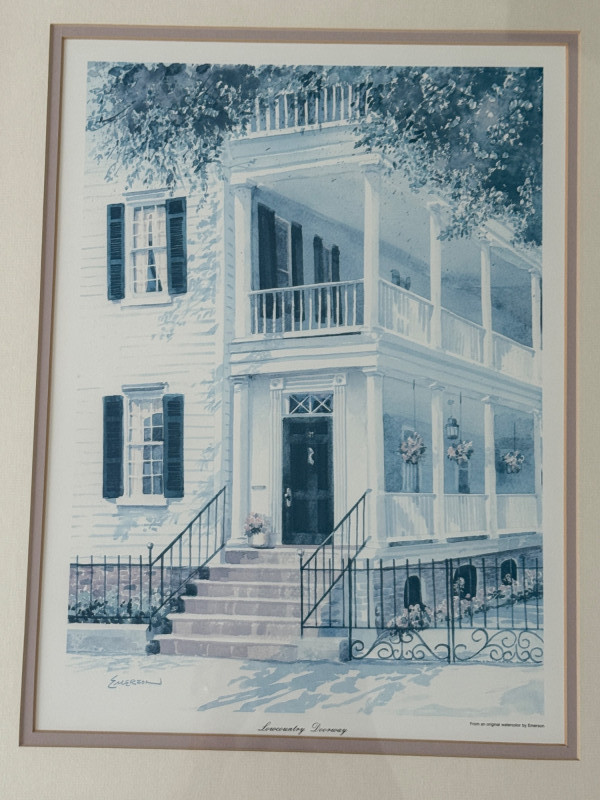 “Lowcountry Doorway” by Emerson -A Print From Original Watercolor By Ermerson, double matted with gold frame. Mostly blue with hints of pink in the flowers.