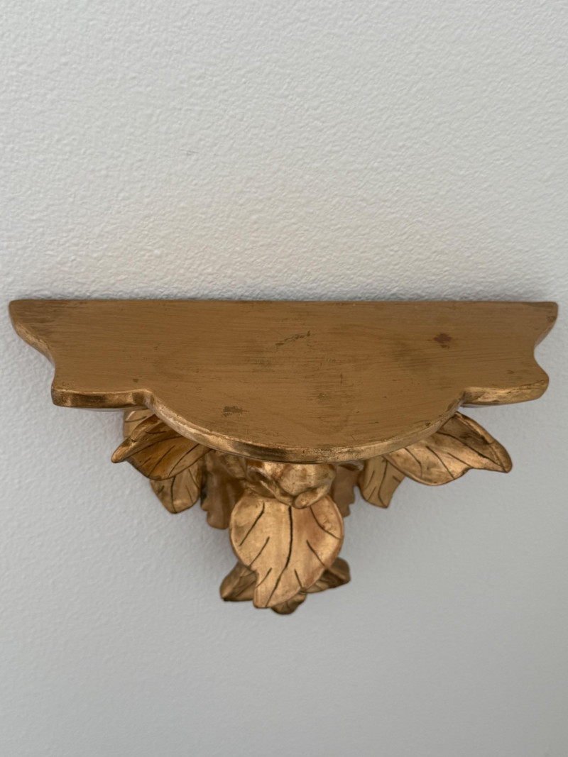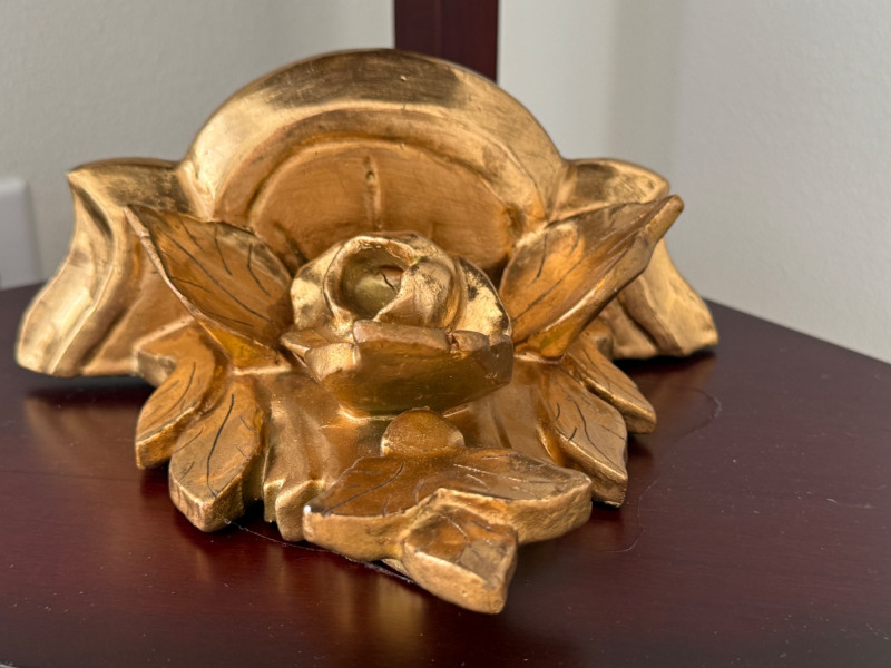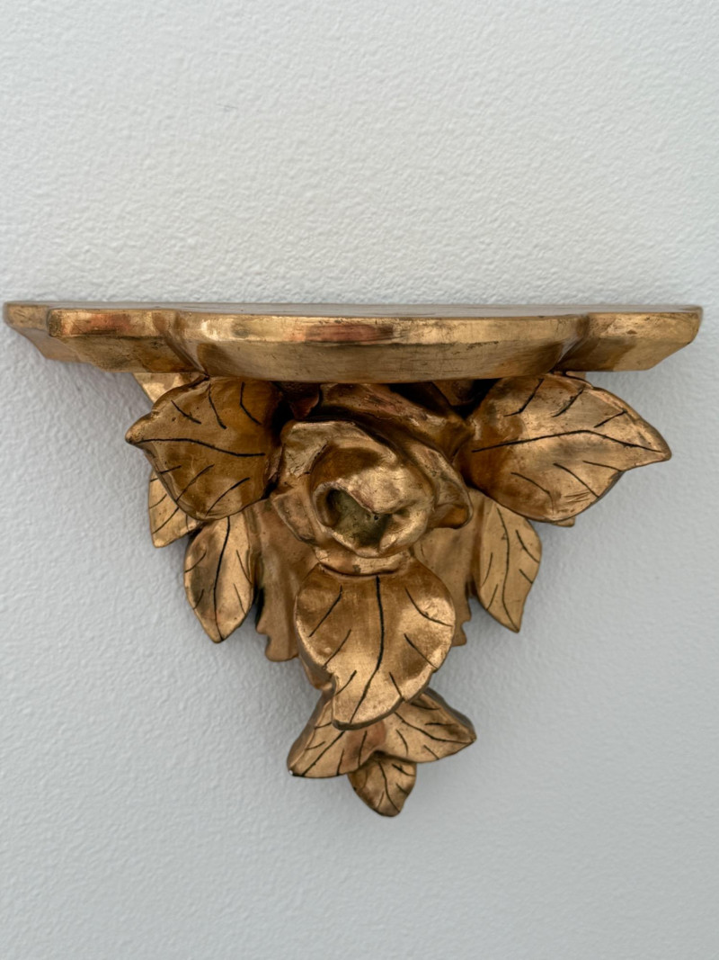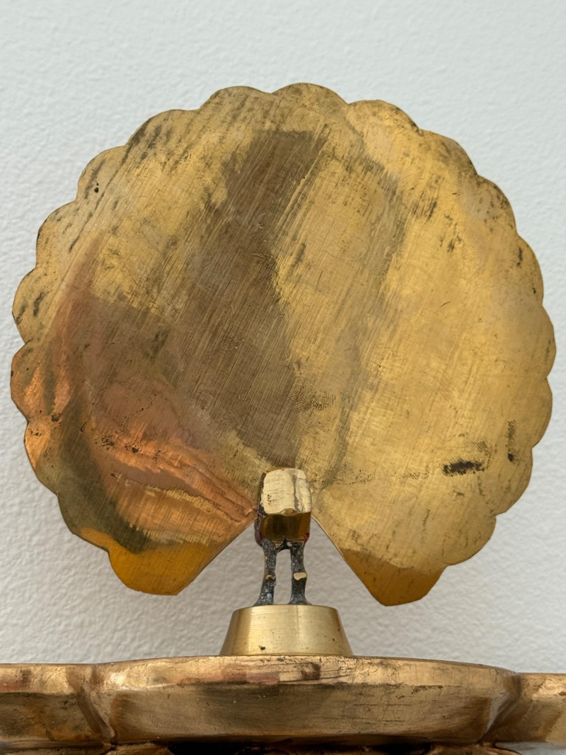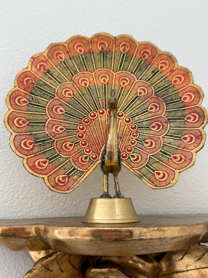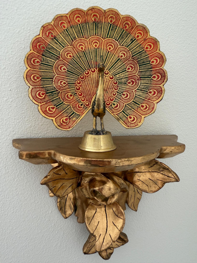 Hashcart Brass Peacock Statue Figurine 7x7x2” on gold painted carved wood rose wall shelf 8x6x4”