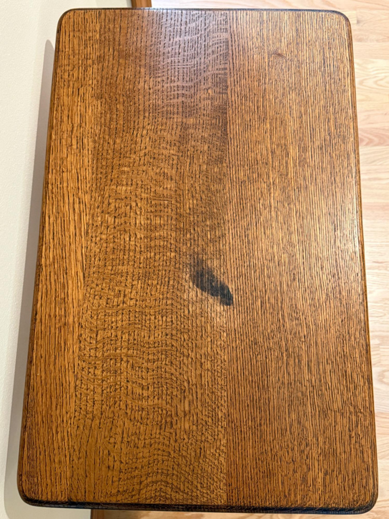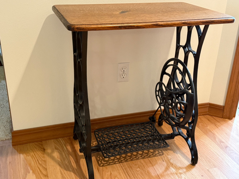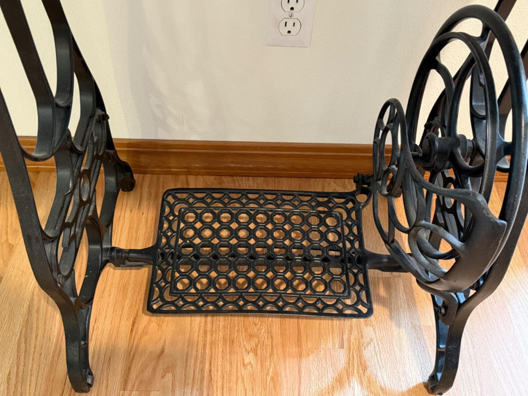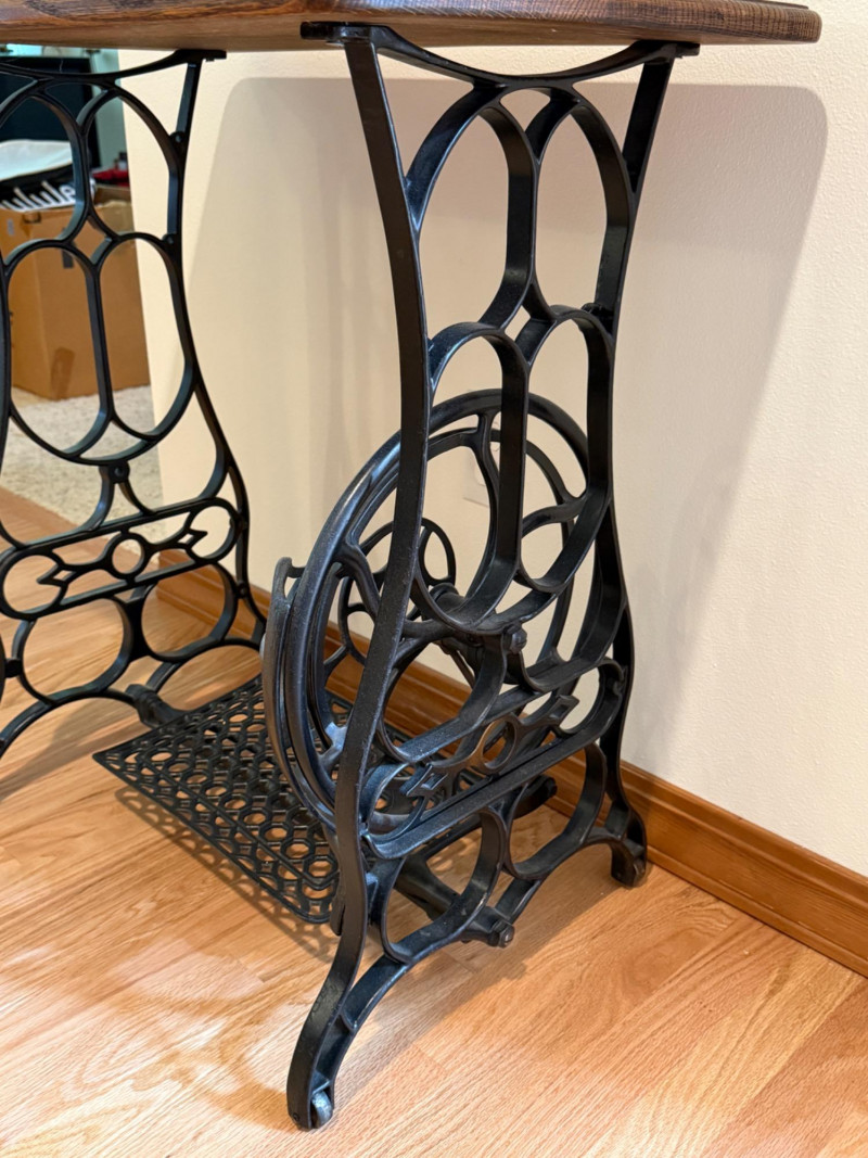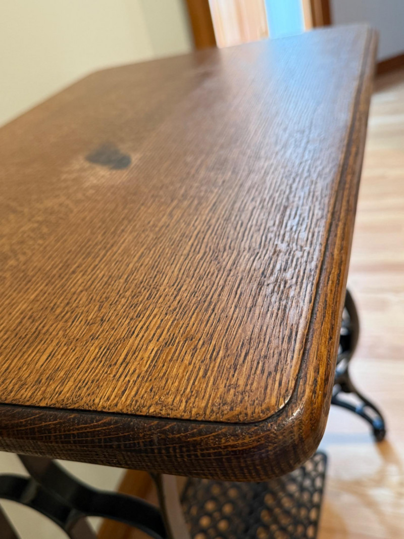 Iron Treadle Table With Oak Top Treadle works and spins smoothly. Scorch or stain on table top. 27x17x29”