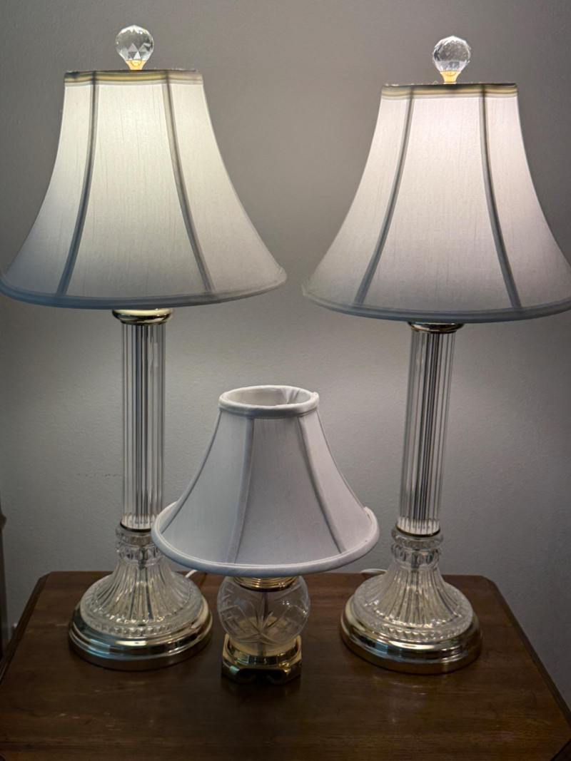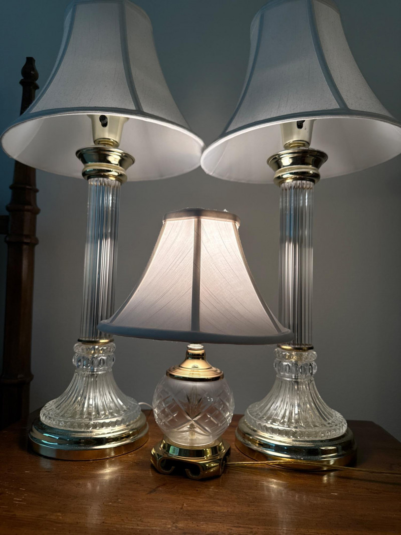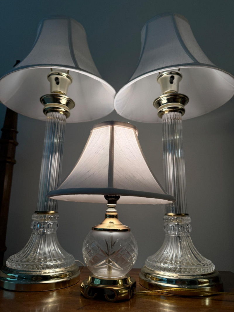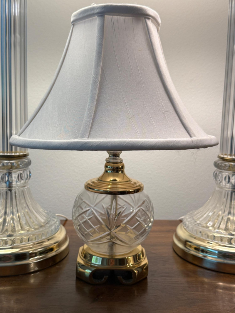 Cut Crystal and Brass Lamp Trio Lamp pair measure 9x29” with 12.5” shade. Round lamp is 4x13” with 10” shade.
