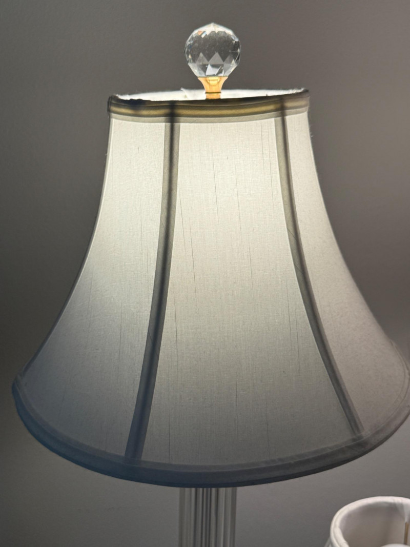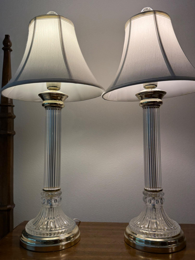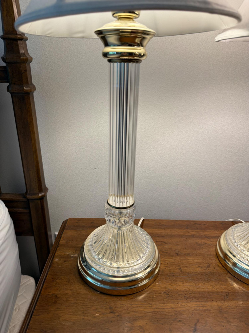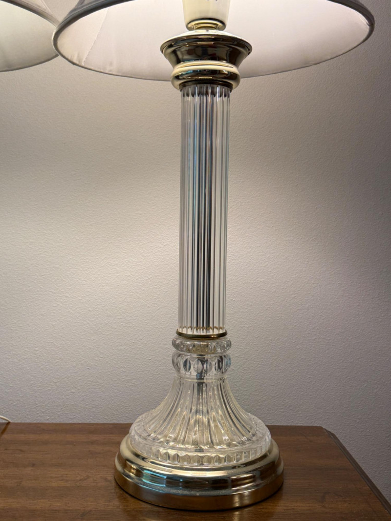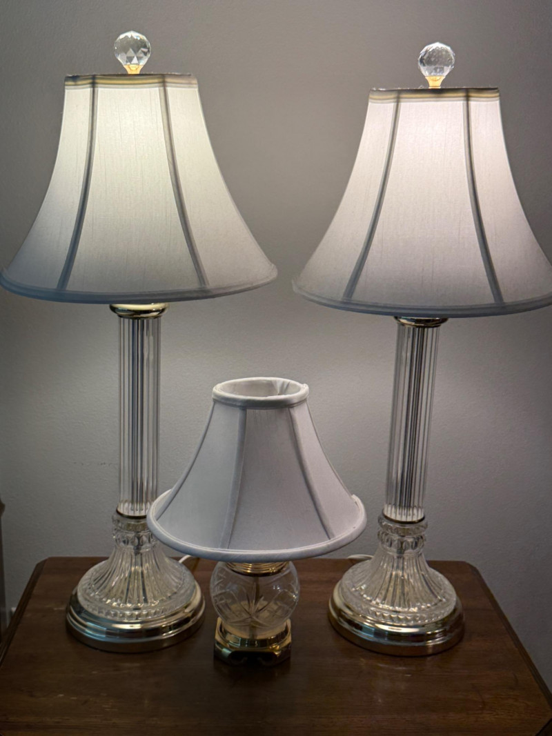 Cut Crystal and Brass Lamp Trio Lamp pair measure 9x29” with 12.5” shade. Round lamp is 4x13” with 10” shade.
