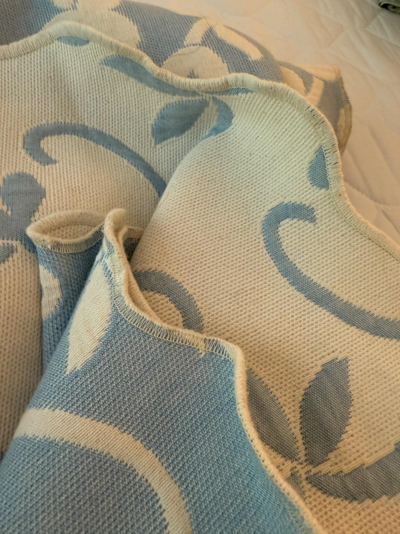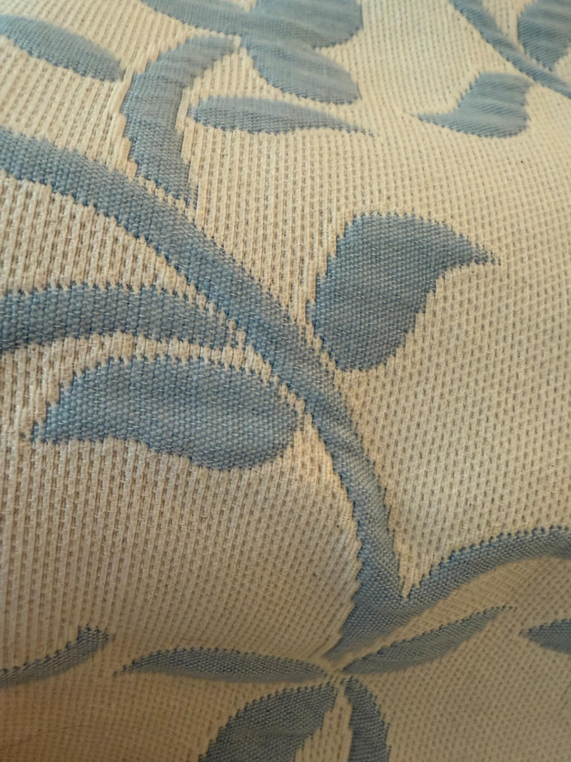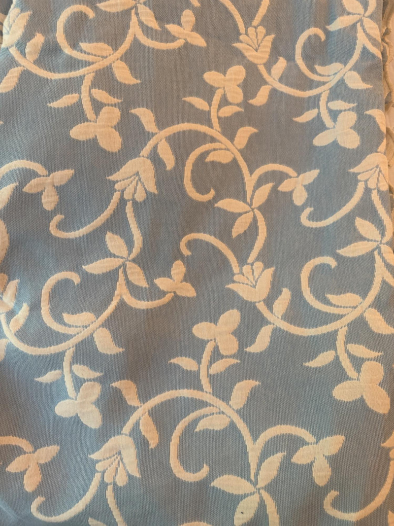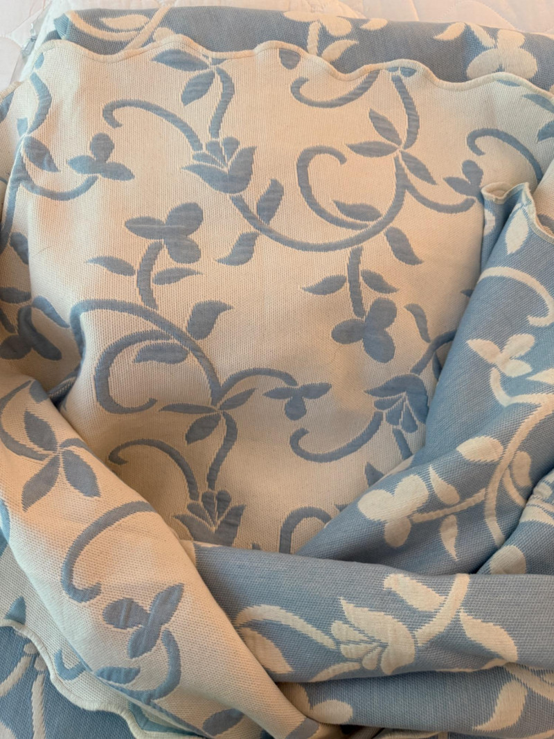 Reversible Queen Bedspread - Sheet Set - Mattress Protector Small spot noted on reversible powder blue and ivory Linensource bedspread. Made in Portugal.
