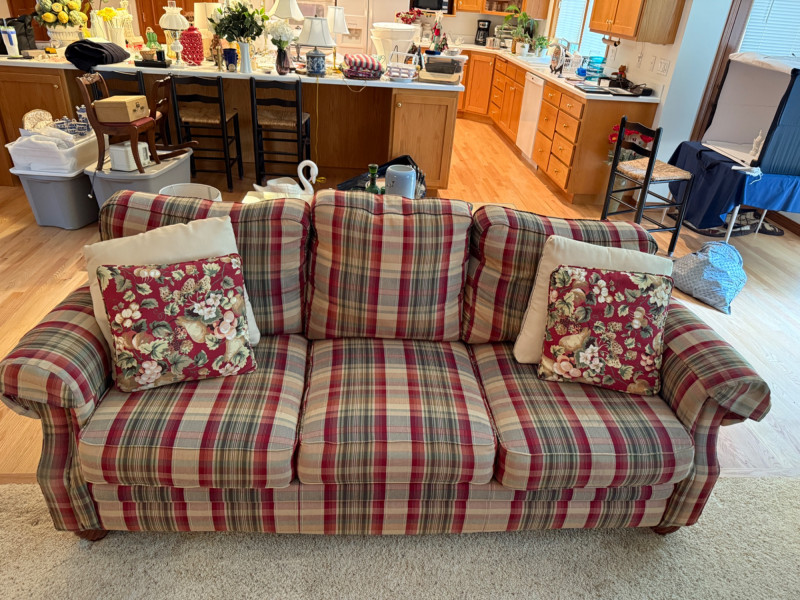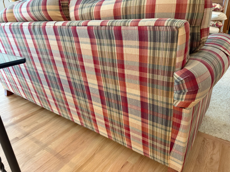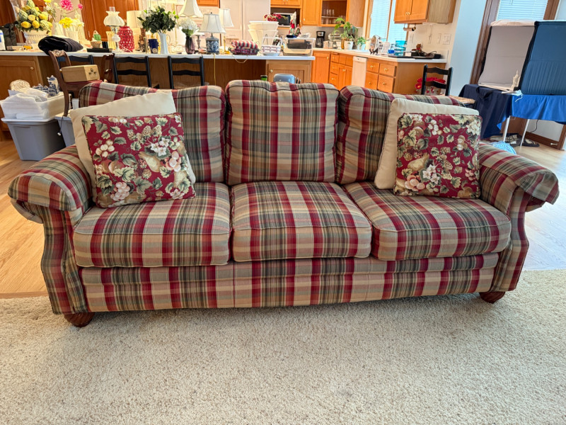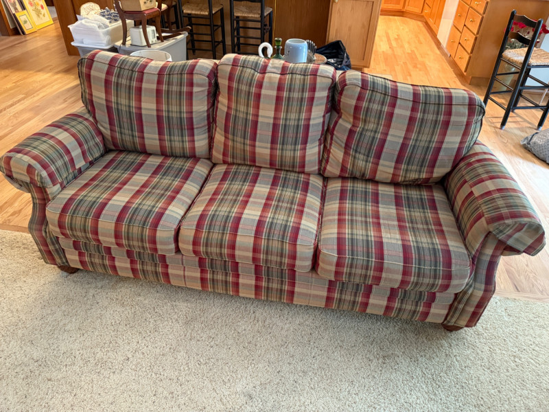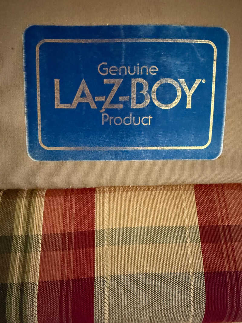 La-Z-Boy Red and Tan Plaid 3 Cushion Sofa Very good condition with arm covers. Backs are attached, seat cushions are removable. Tested, comfy. 87x36x36”