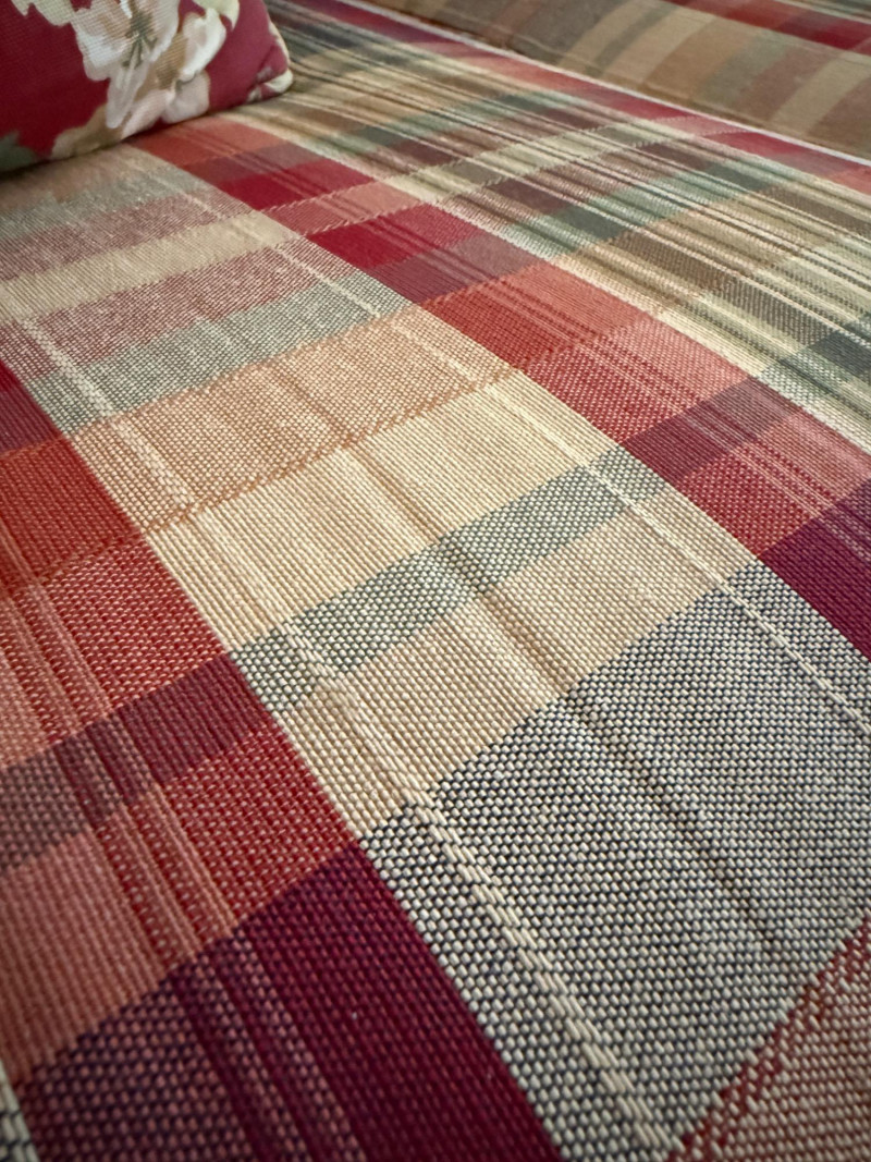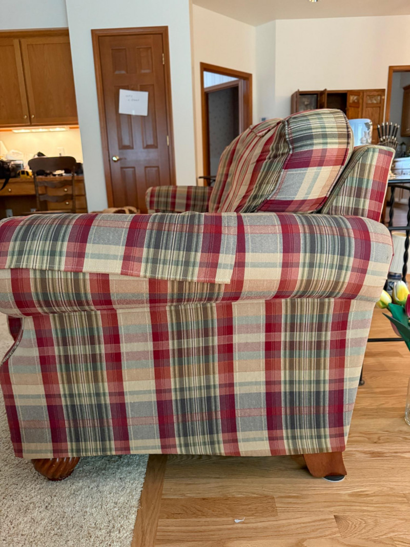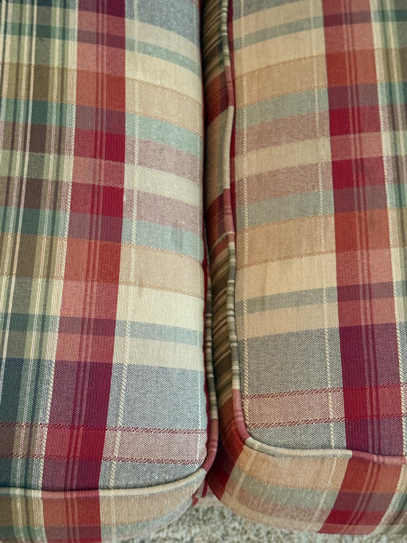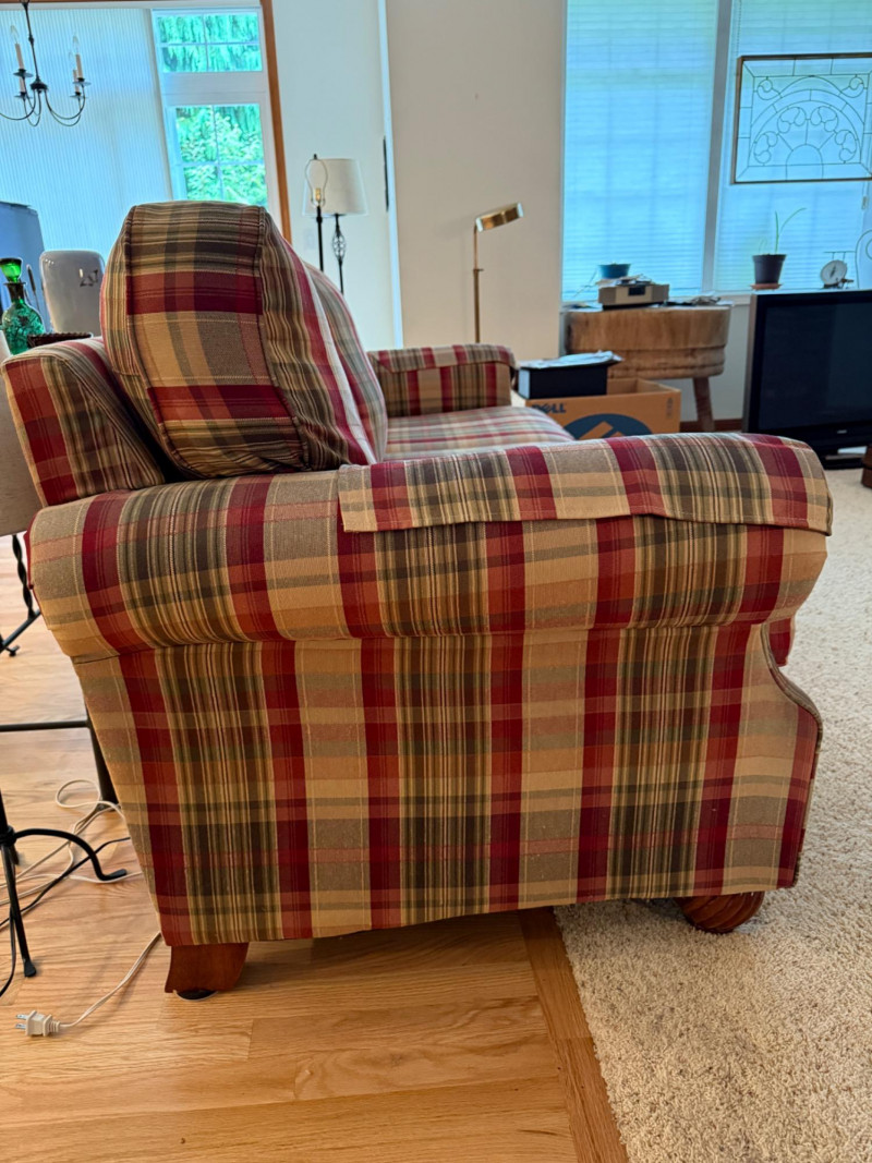 La-Z-Boy Red and Tan Plaid 3 Cushion Sofa Very good condition with arm covers. Backs are attached, seat cushions are removable. Tested, comfy. 87x36x36”