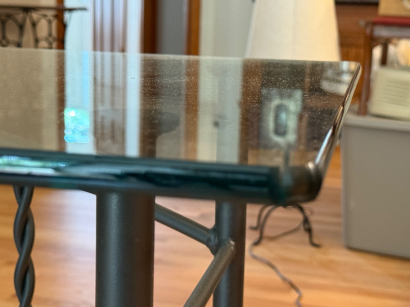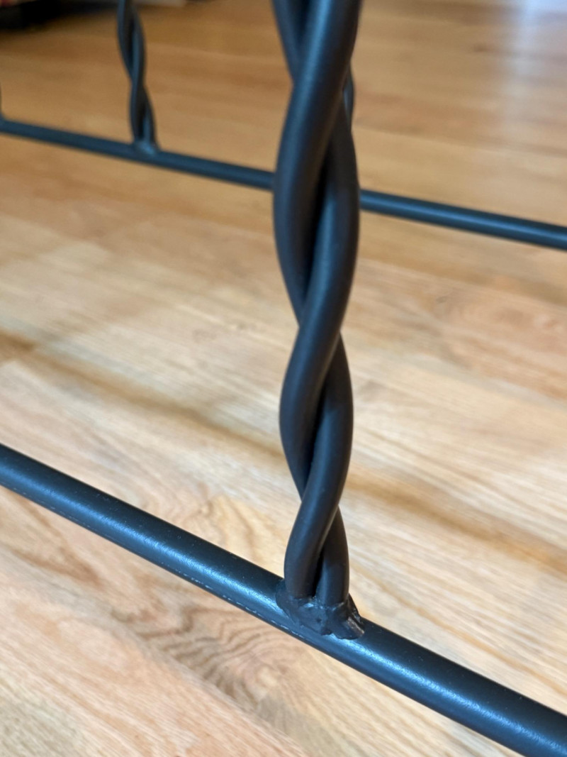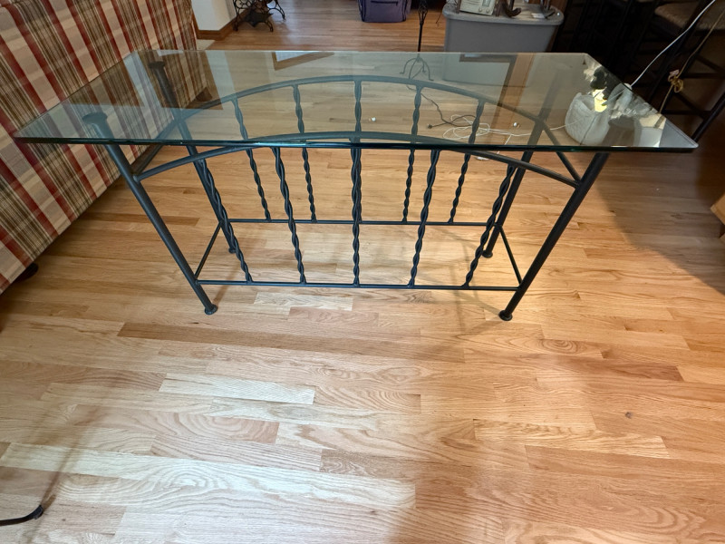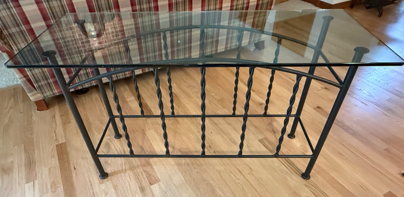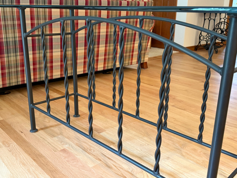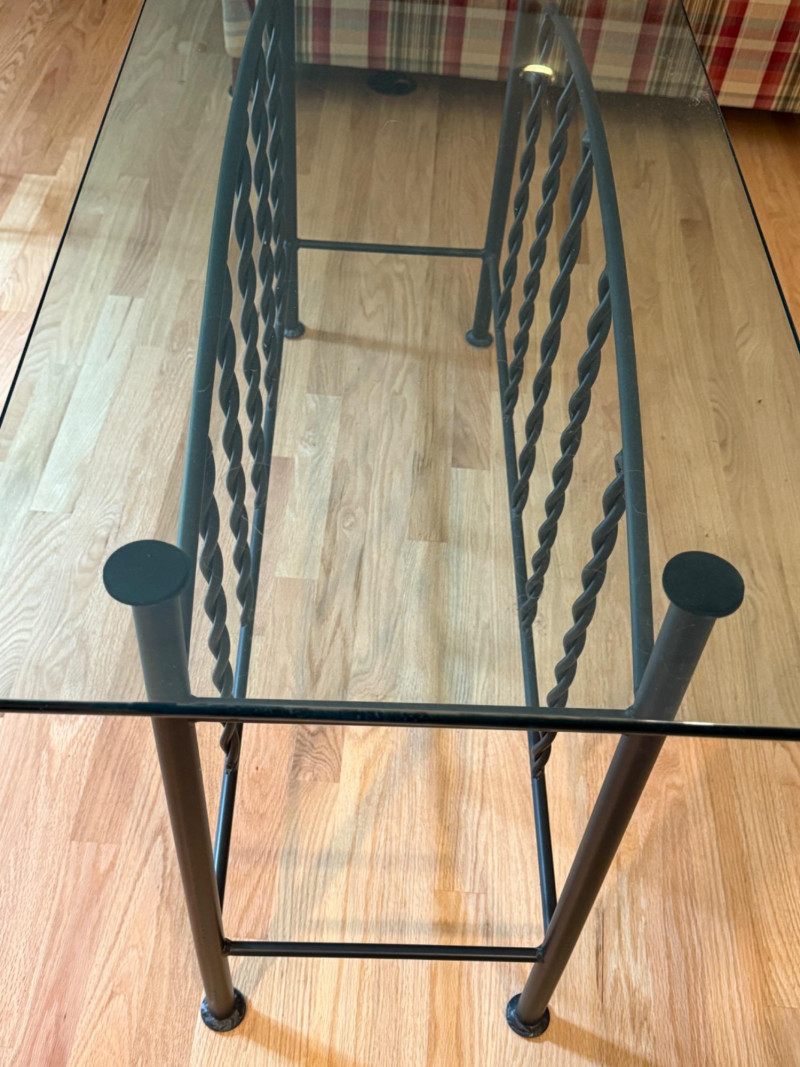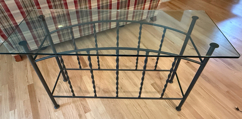 Twisted Iron and Glass Sofa Table With Arched Design 50” x 20” x 28” tall. 1/4” thick rounded edge glass top.