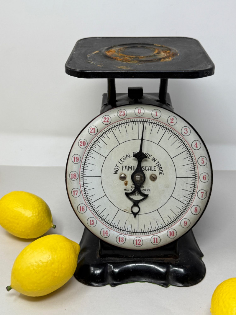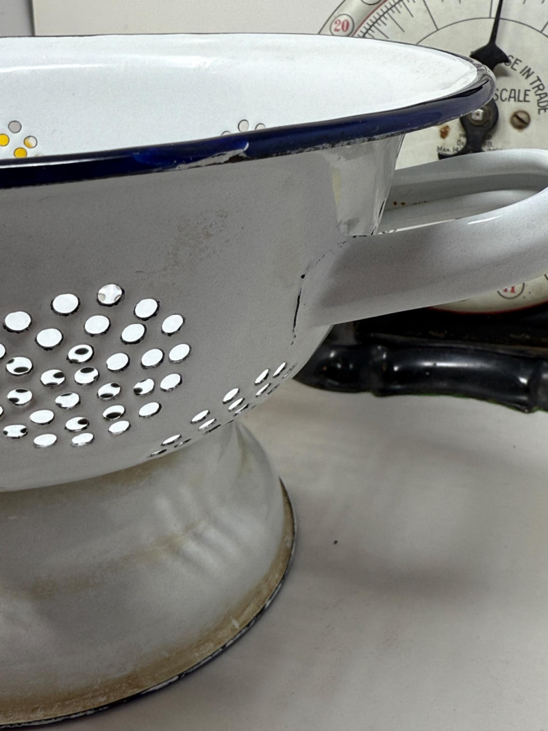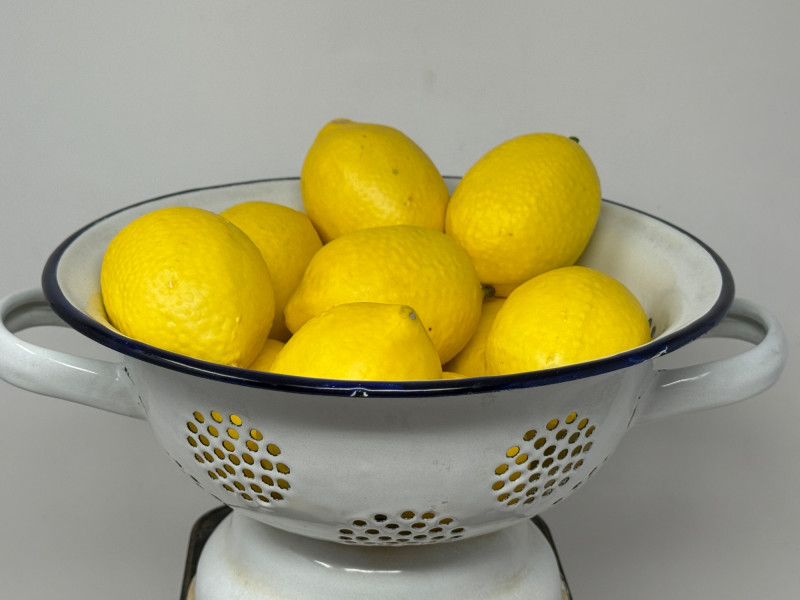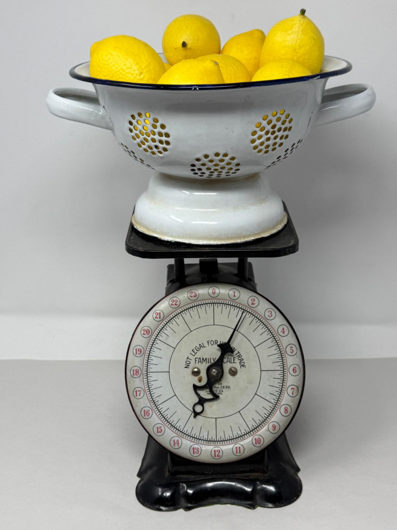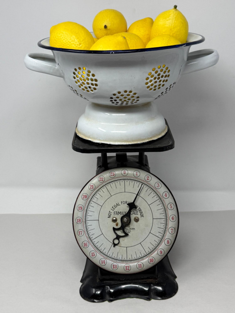 Countertop Family Scale & Enamel Colander & Lemons Shapleigh HDWE Co. Diamond Edge 6.5x8.5x8.25” scale 9x5” white and blue enamel colander with 12 faux lemons.