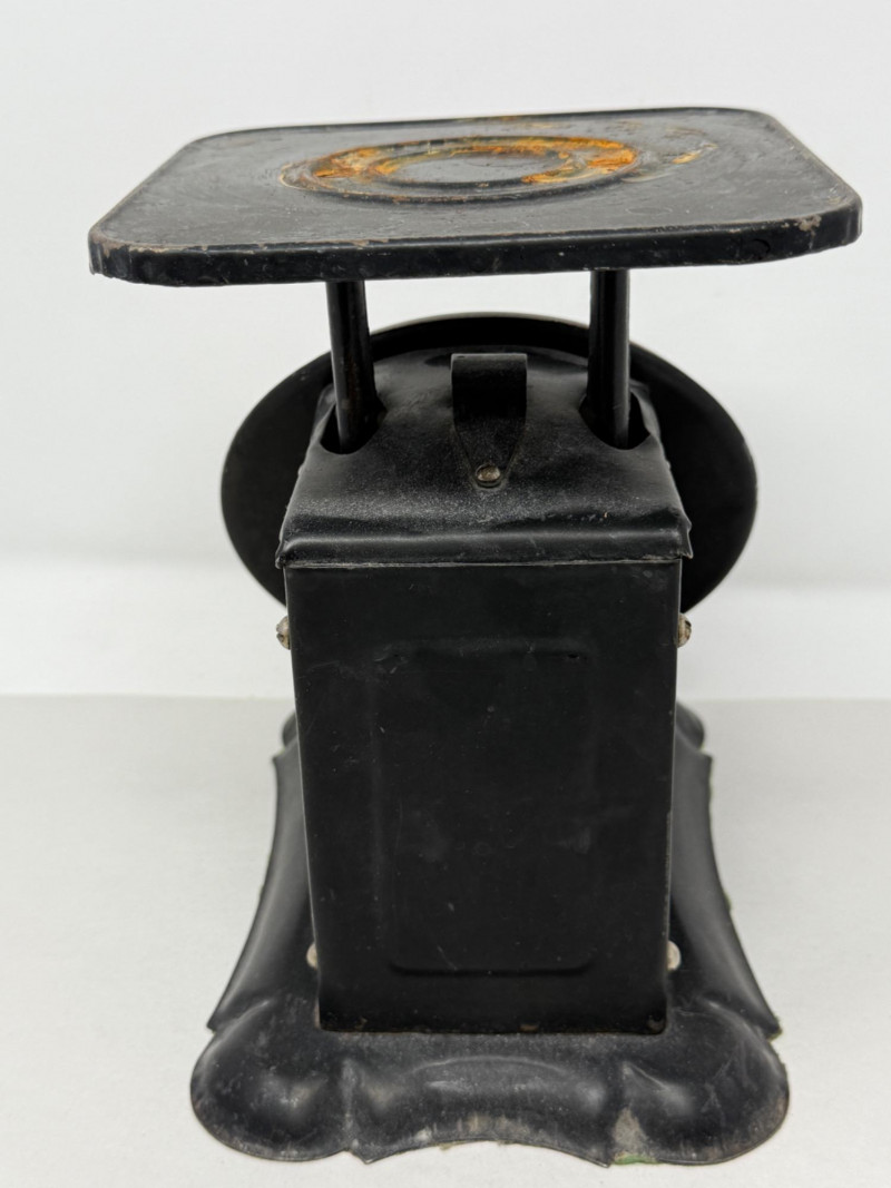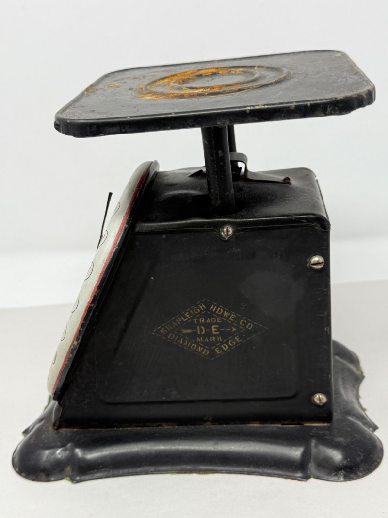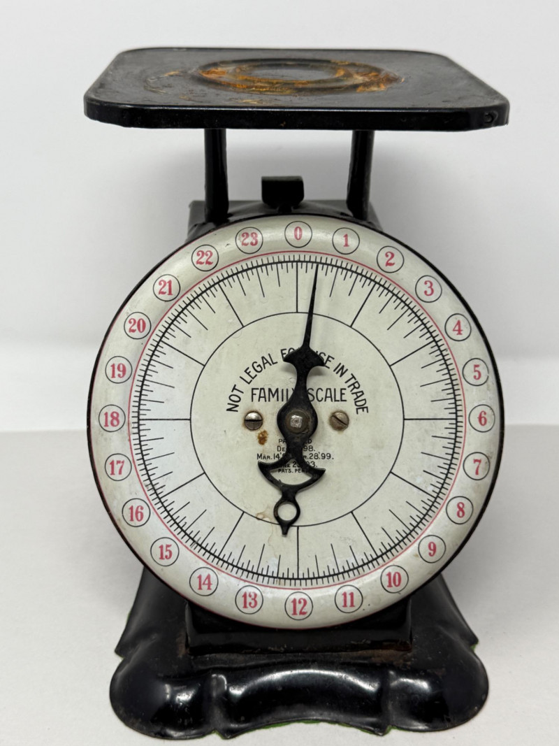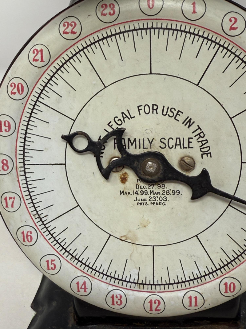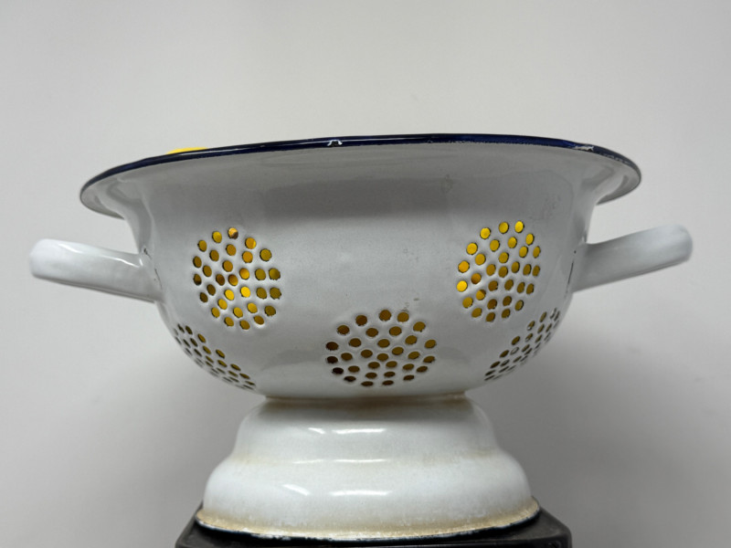 Countertop Family Scale & Enamel Colander & Lemons Shapleigh HDWE Co. Diamond Edge 6.5x8.5x8.25” scale 9x5” white and blue enamel colander with 12 faux lemons.