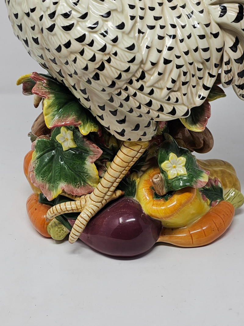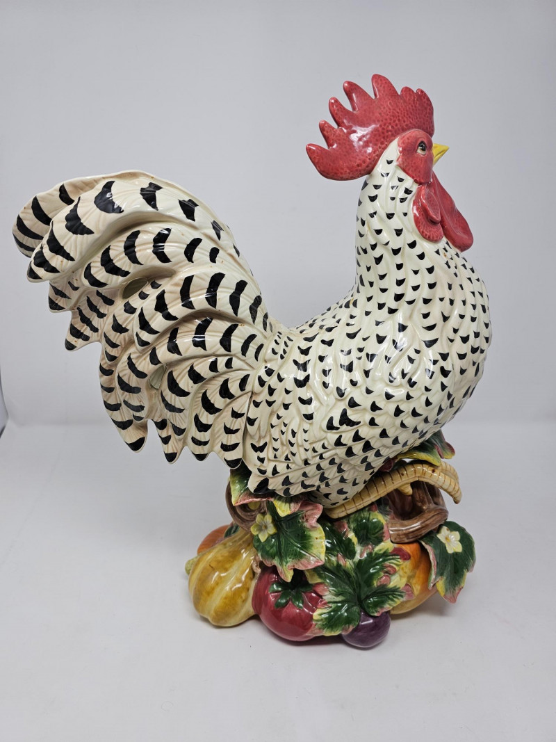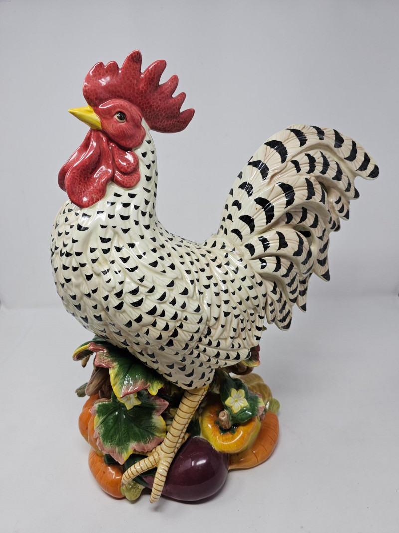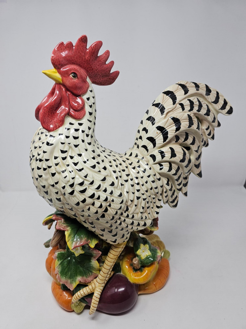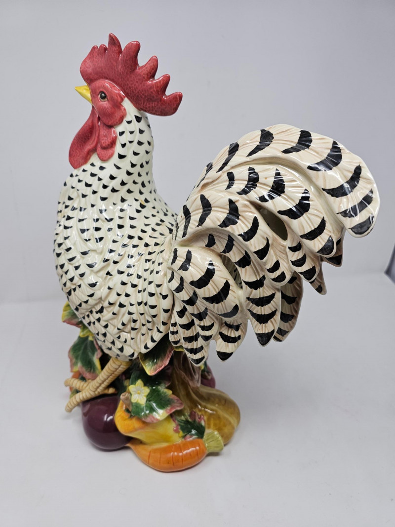 Fitz and Floyd Classics Ceramic Gardening Gourmet Rooster Centerpiece Figurine This large ceramic figurine depicts a rooster standing atop a base adorned with various vegetables like carrots, peppers, eggplant, and tomatoes, reflecting the "Gardening Gourmet" theme It is crafted from ceramic earthenware, often featuring a vibrant hand-painted finish Designed as a decorative centerpiece, it's suitable for enhancing kitchen or dining spaces with a touch of country or farmhouse charm Appears to be nice condition (see pics) 16"T x 13"W x 6"D