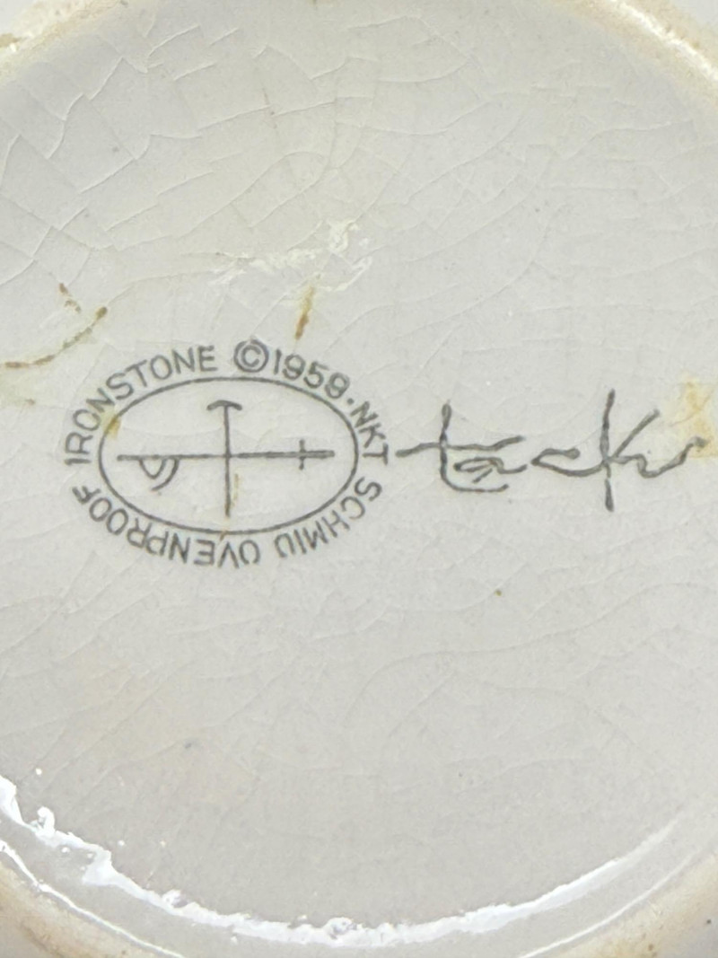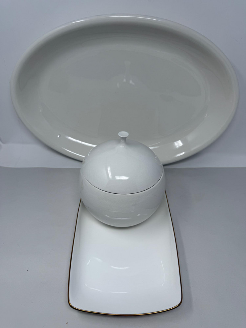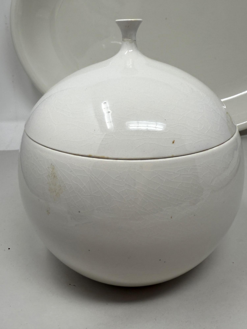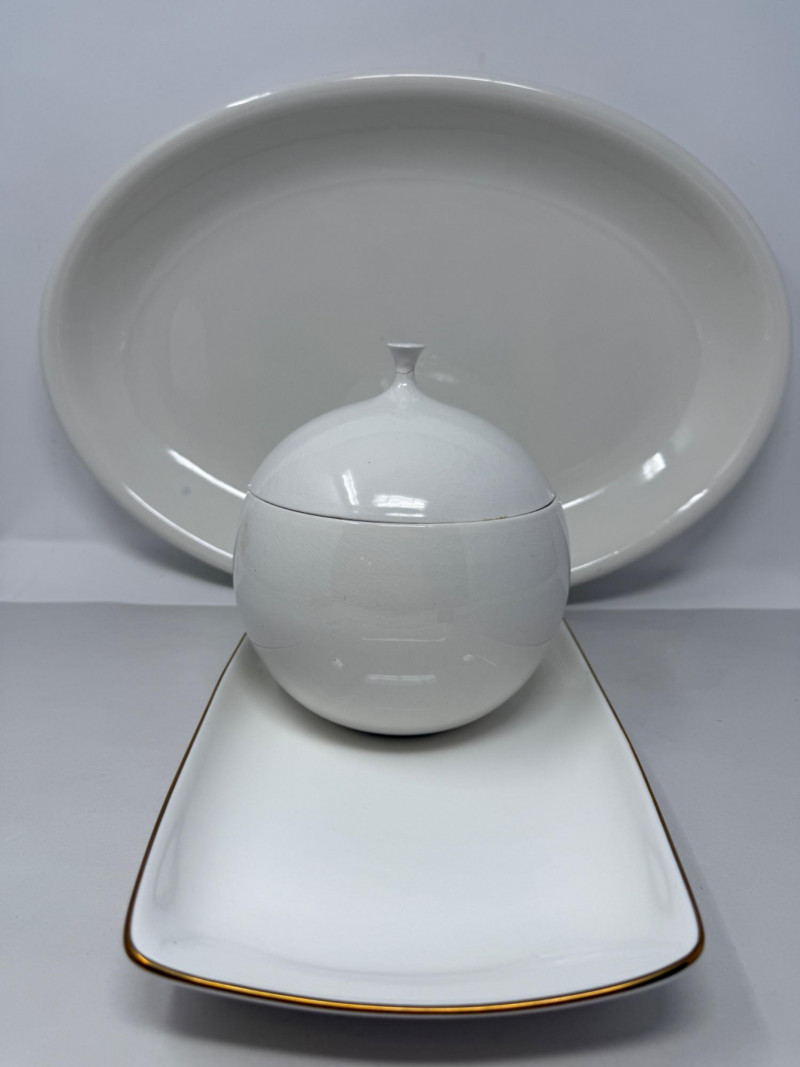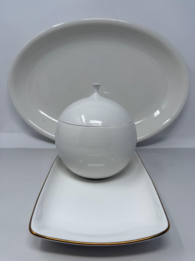 1959 Schmid LaGardo Tackett lidded bowl, likely made of ironstone. 7x14” Gold Rim Lenox Continental Dining Gold Platter Large OvalPrimula Italian Pottery Platter 19x13.5” (Turkey siize)